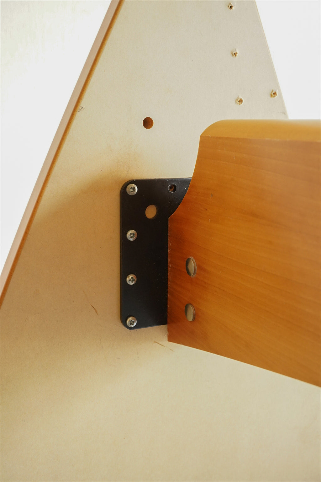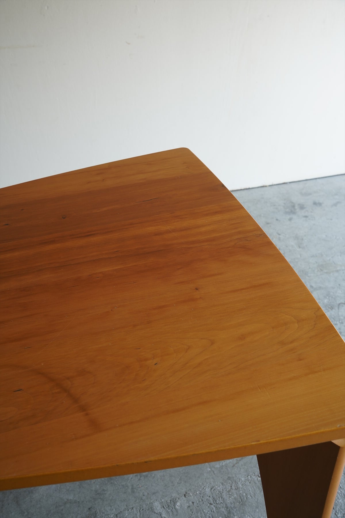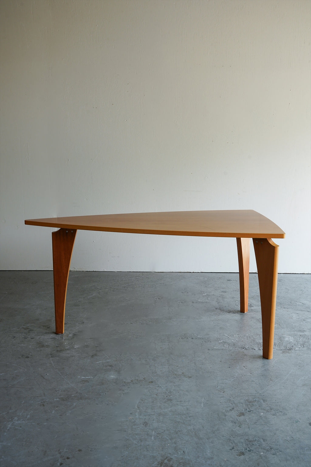 天板は、角が丸く削られた柔らかな三角形。3本の脚は見る角度によって表情を変える遊び心のあるデザインです。木材の滑らかな質感と温かい色合いが、モダンでありながらもどこか優しい雰囲気を醸し出しています。