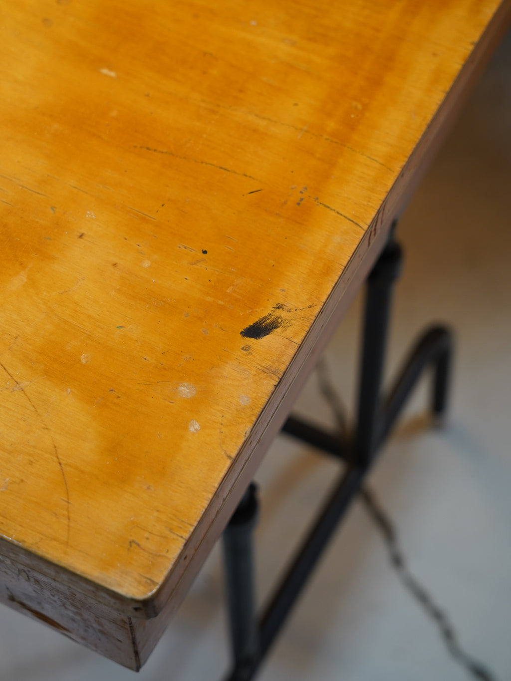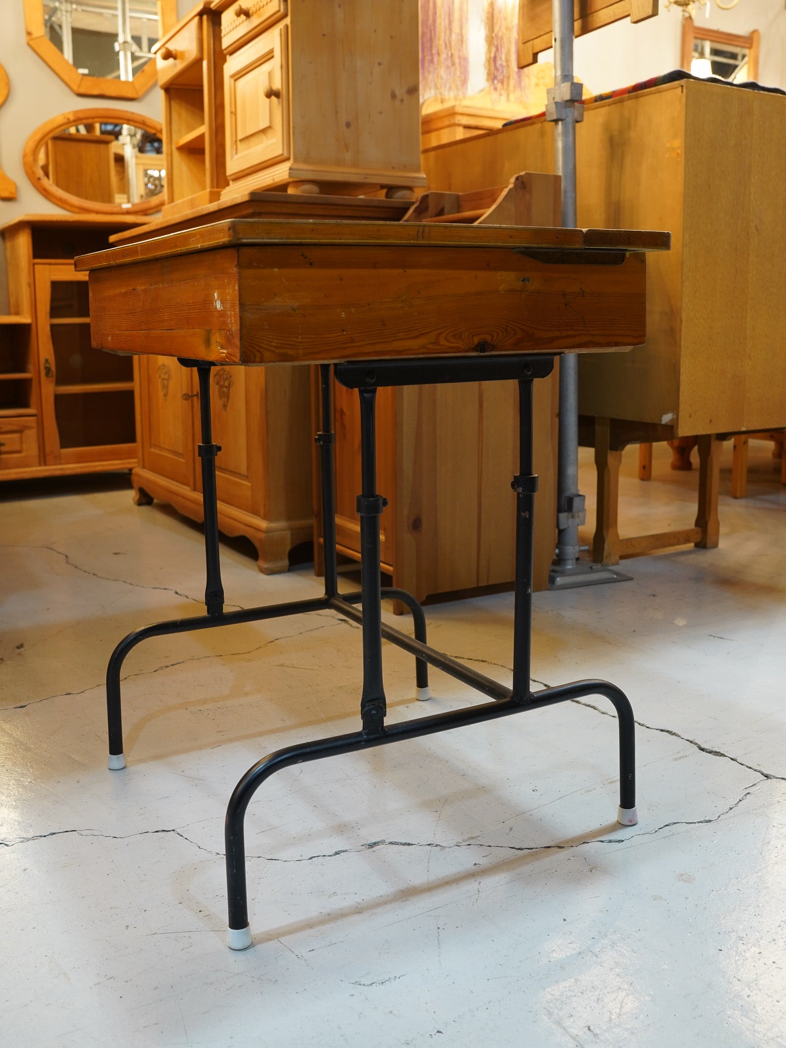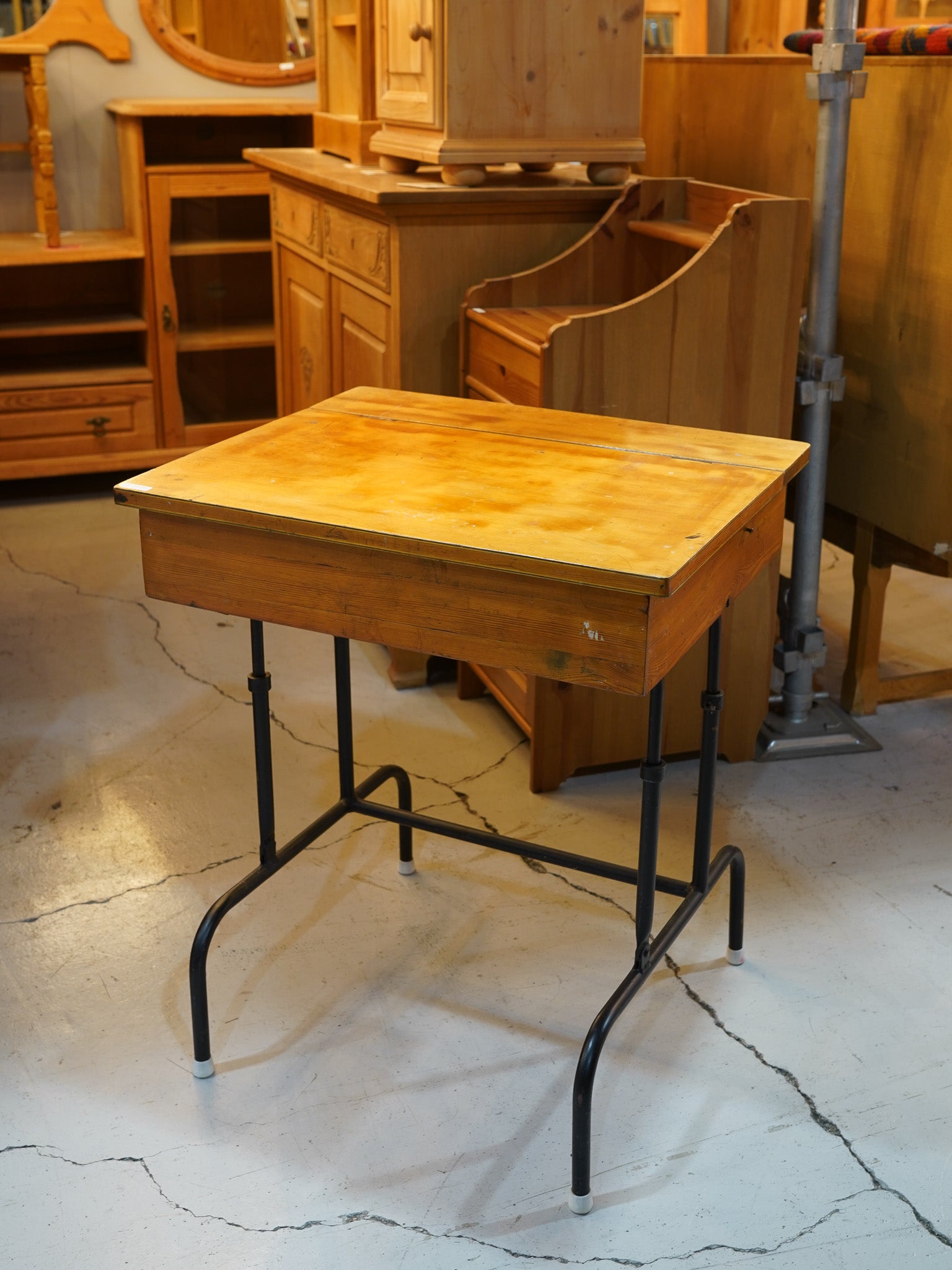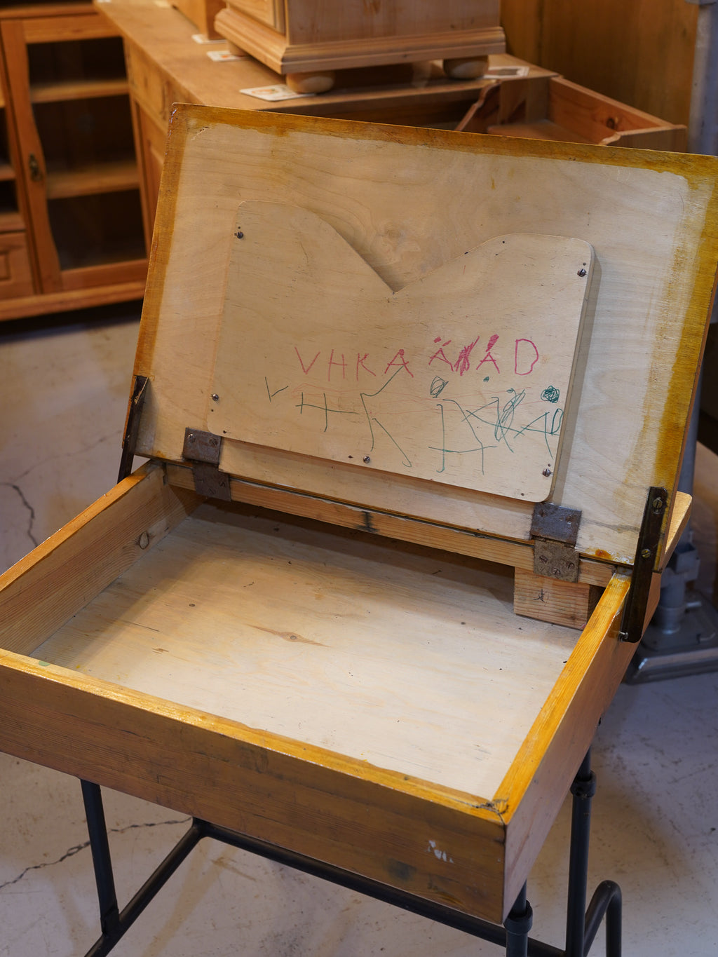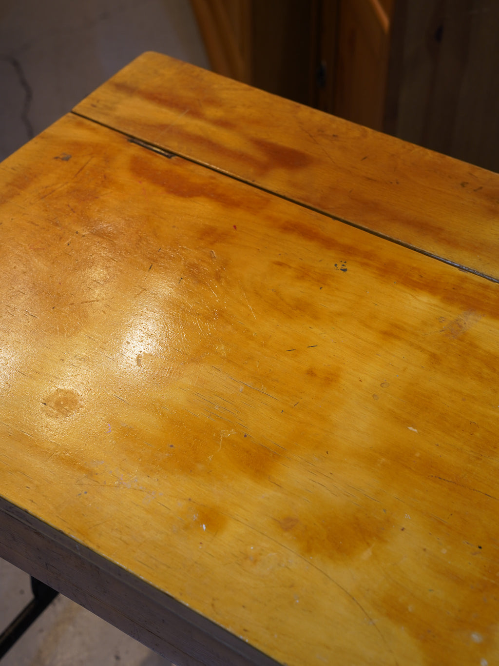 天板は上部に開く構造になっており、内部は収納スペースとして利用できます。かつては学校の机や子供用の学習机として使われていたことを偲ばせるデザインです。
