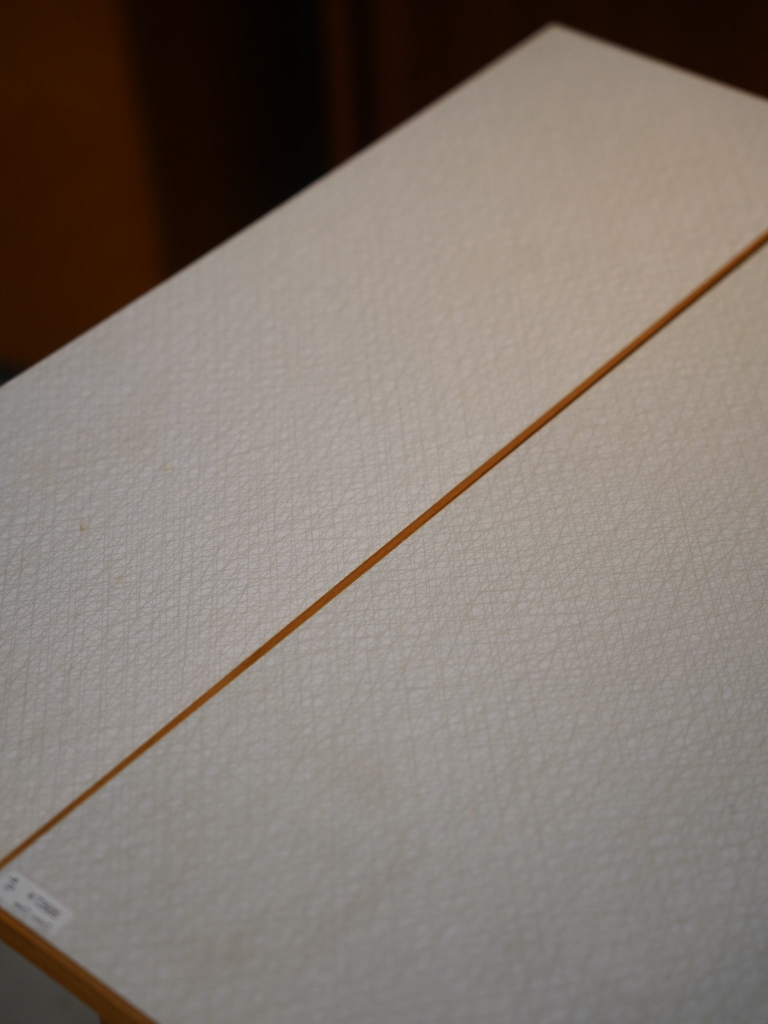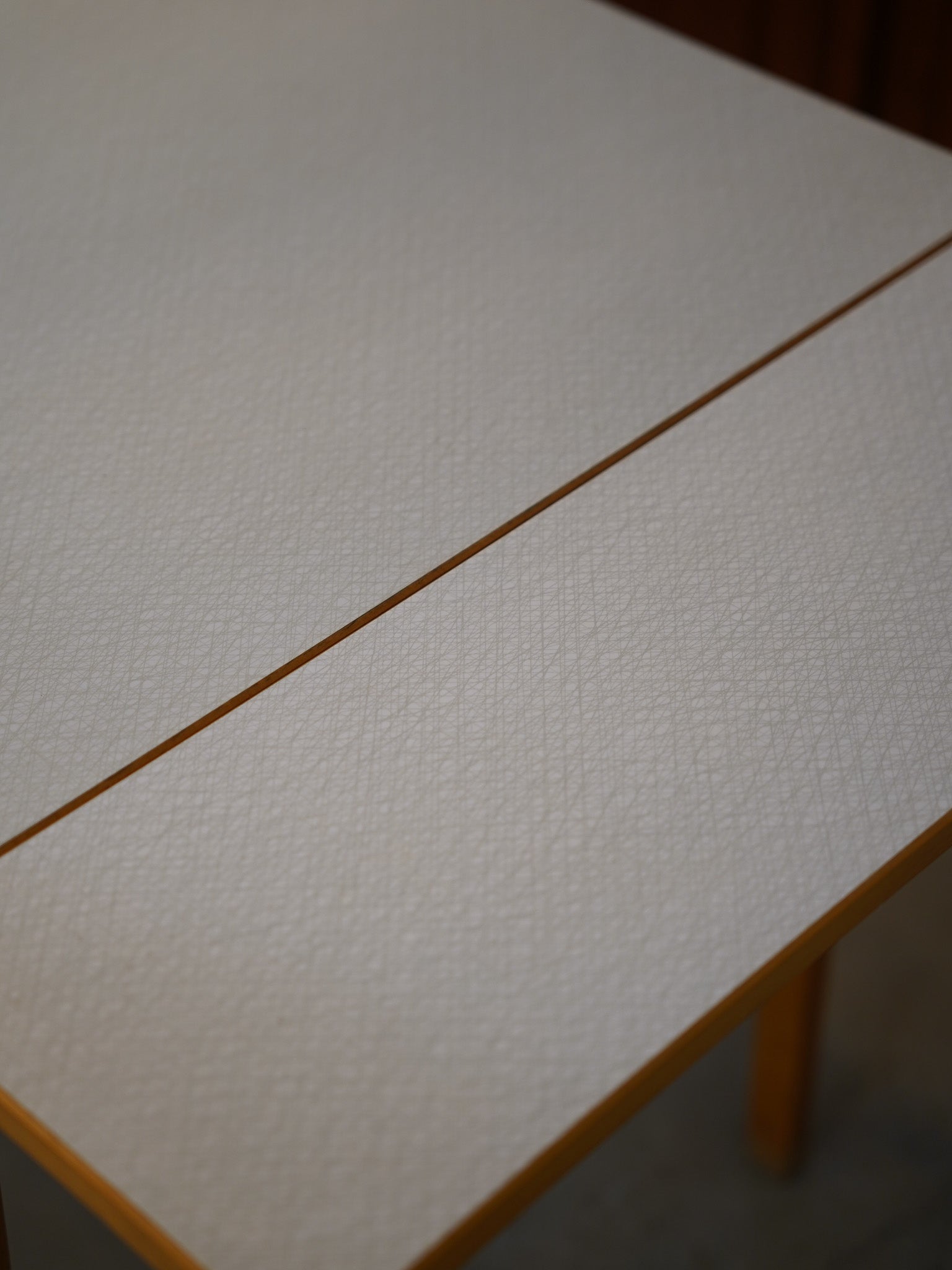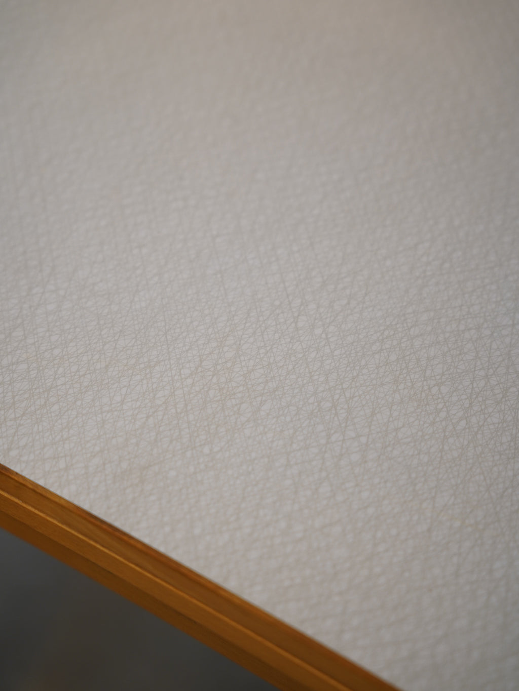 モダンなホワイトカラーの天板と、温かみのあるウッドの脚が、空間に明るく柔らかな雰囲気をもたらします。