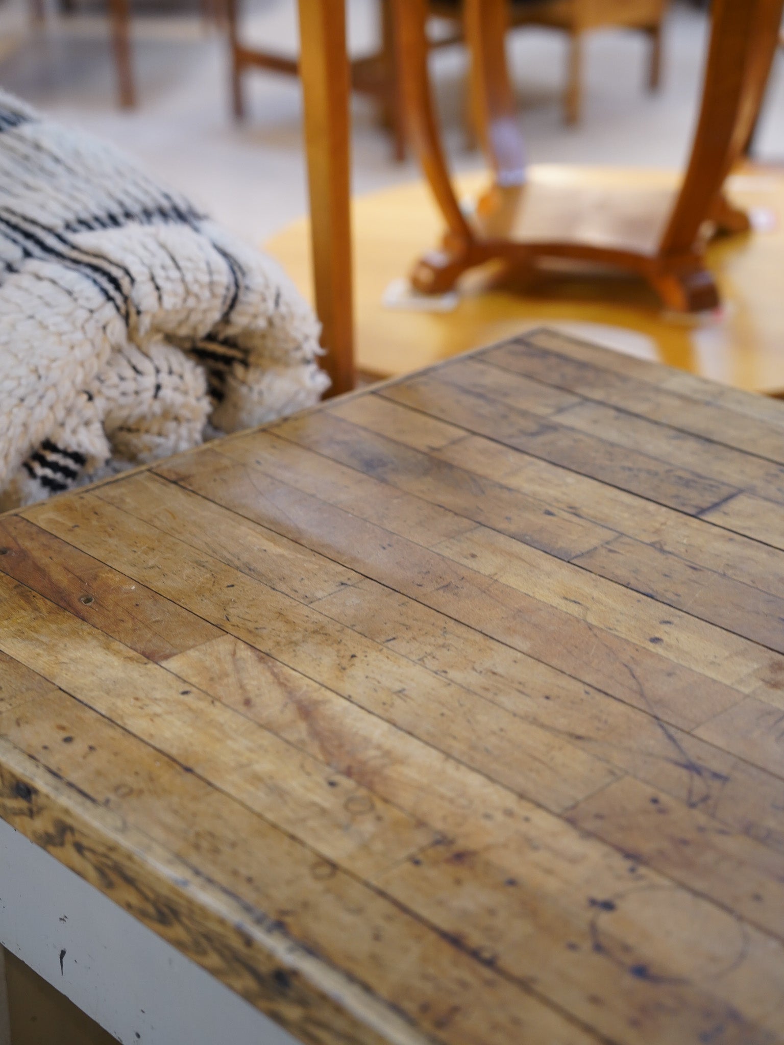 無垢材ならではの自然な木目と、長年の使用によってできた味わい深いツヤや傷が特徴です。