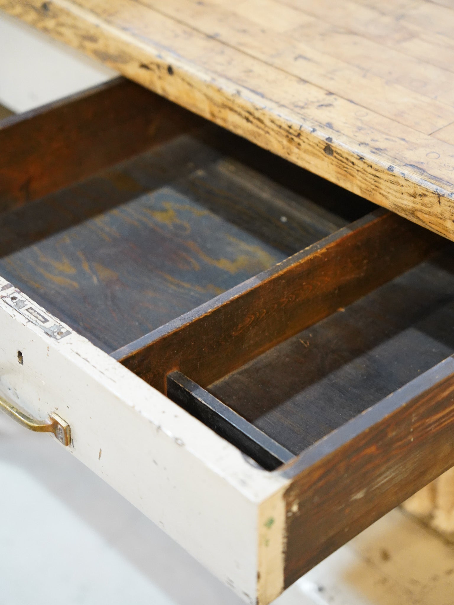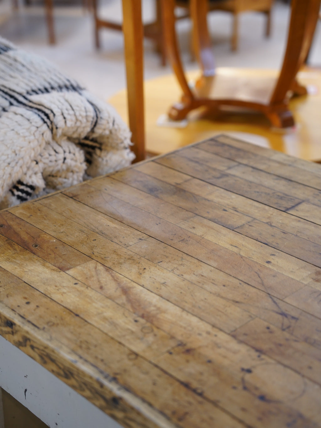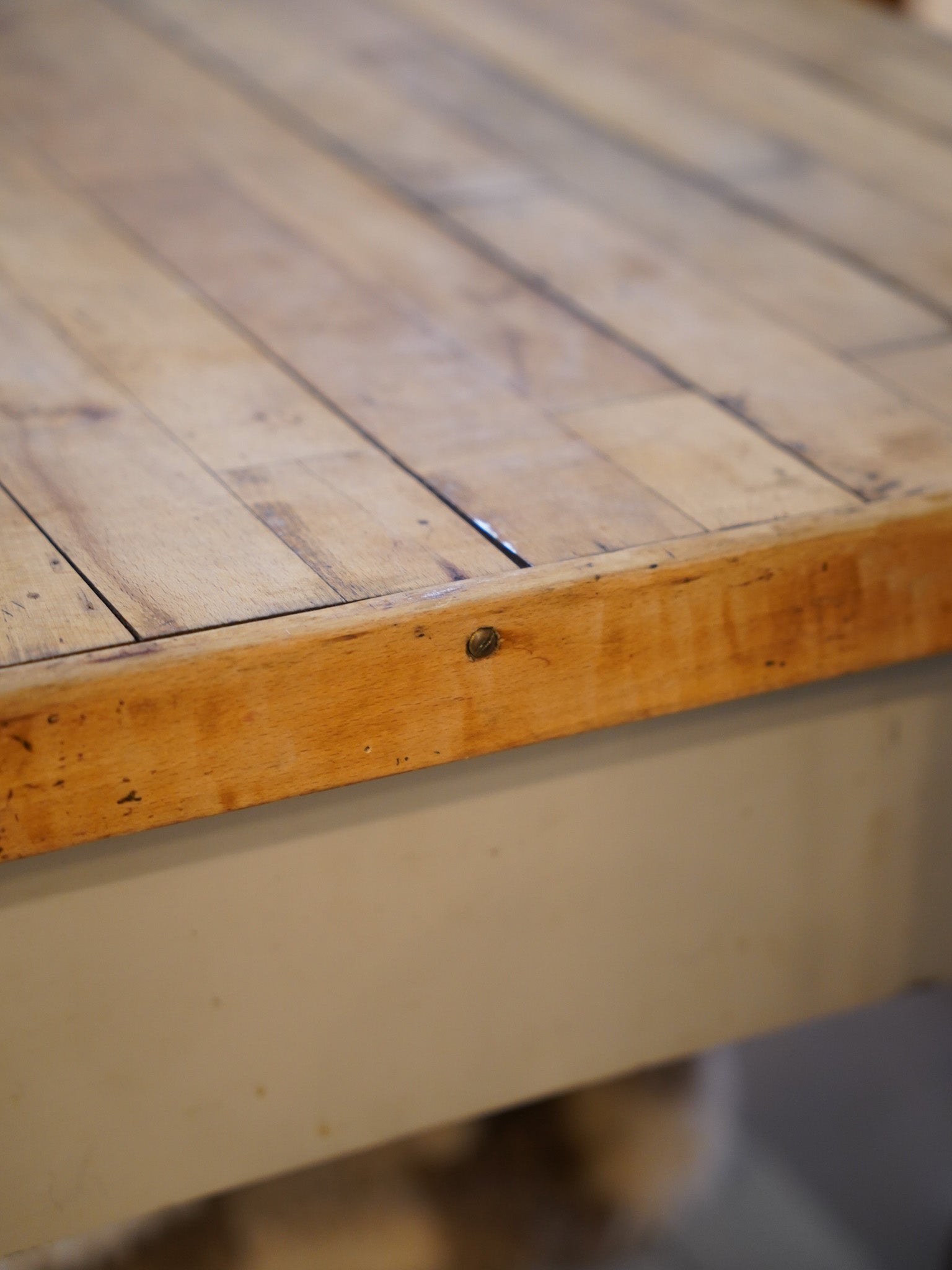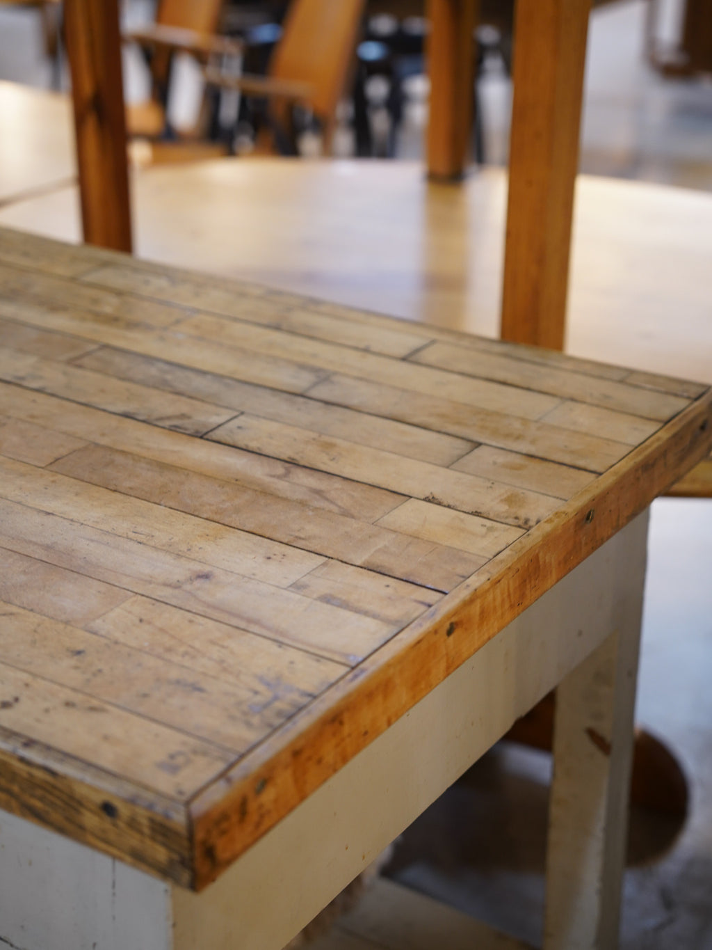 使い込まれた木製天板と、ヴィンテージならではの経年変化を感じられるペイント仕上げのウッドフレームが魅力的なワークテーブル。