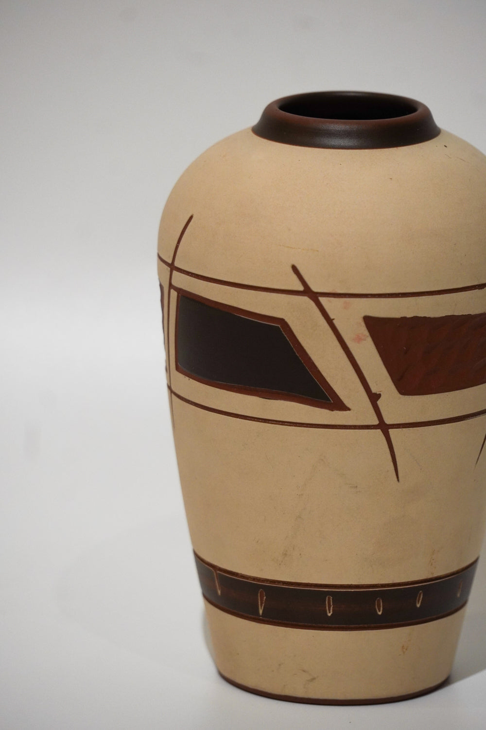 This vintage vase features modern aesthetics. The glossy blue-gray base features a three-dimensional, organic texture, creating a unique finish that changes appearance depending on the angle of the light. The flowing glaze pattern is distinctive, making it a recommended one-of-a-kind art piece.