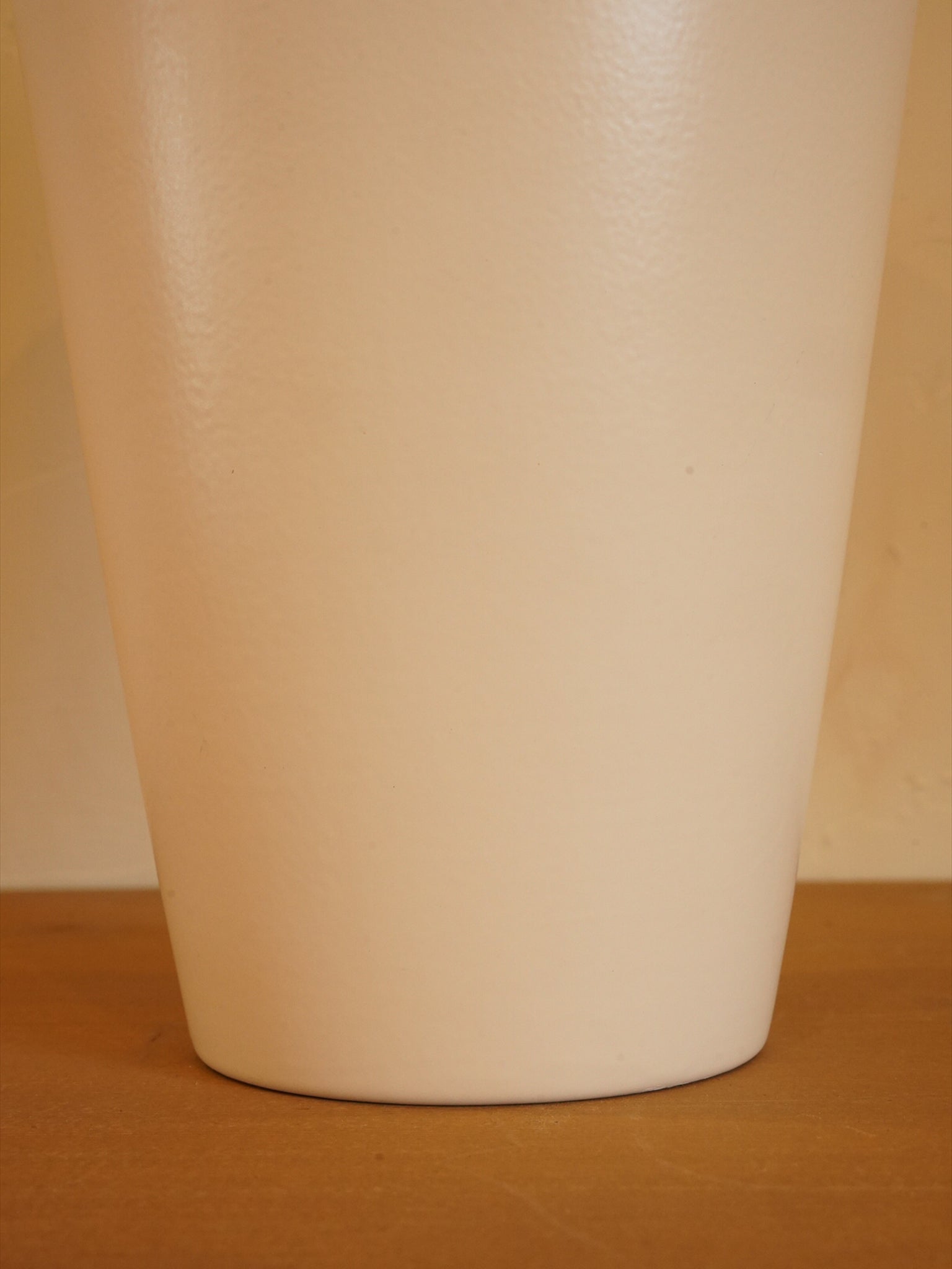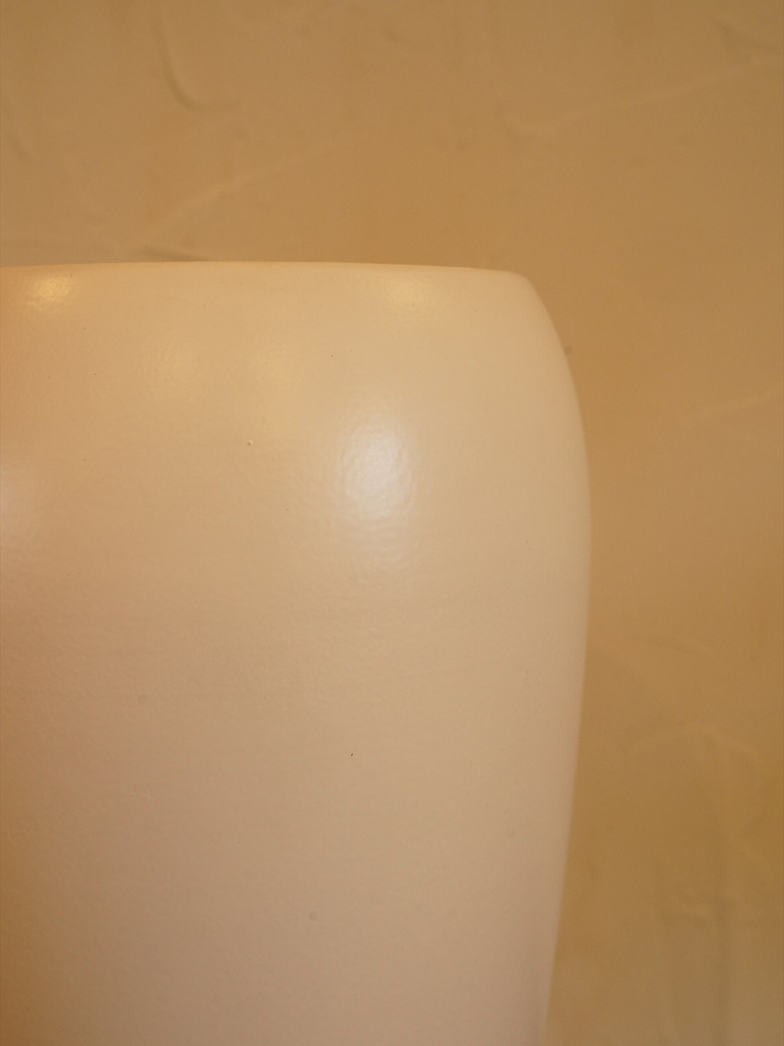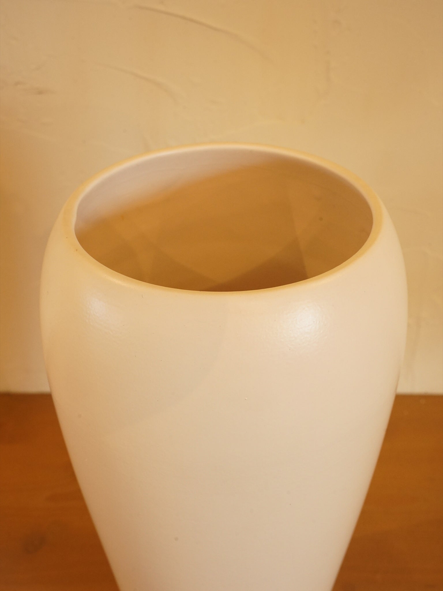 表面は均一で光沢のあるライトベージュの単色釉薬で覆われ、ミッドセンチュリーモダン後期のミニマリズムに通じる洗練された美しさを放っています。内側の濃い釉薬とのコントラストもモダンな印象です。