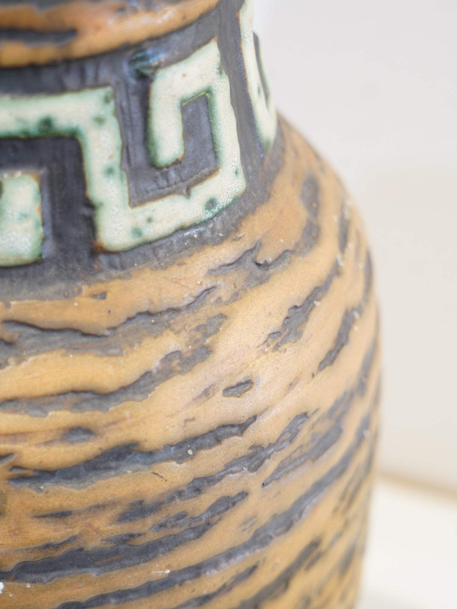 最大の見どころは、ネックラインに施された「メアンダー(雷紋)」のレリーフです。この伝統的な紋様に淡いグリーンの釉薬が結晶のように留まり、無機質なボディに有機的な彩りを添えています。胴部分に刻まれた水平方向のダイナミックな凹凸は、光を浴びることで深い陰影を生み出し、空間に心地よいリズムと圧倒的な奥行きをもたらします。