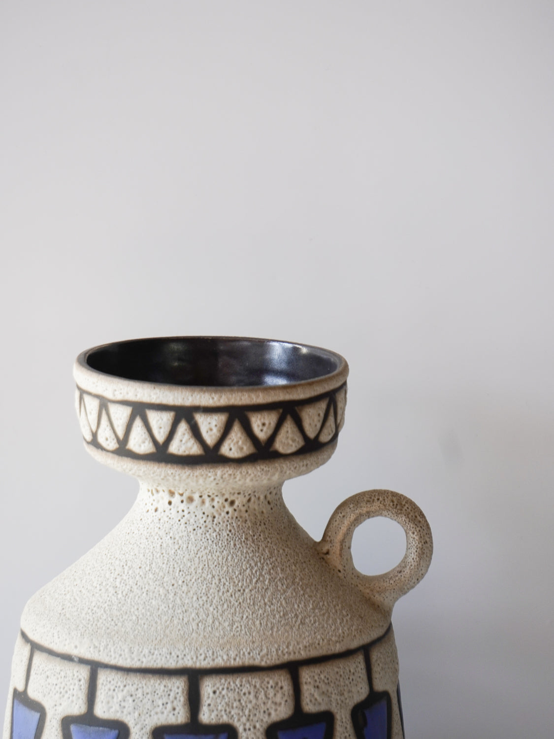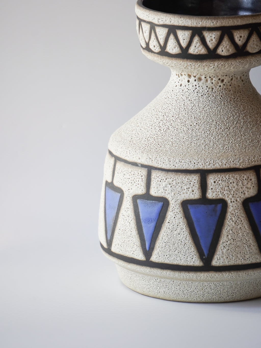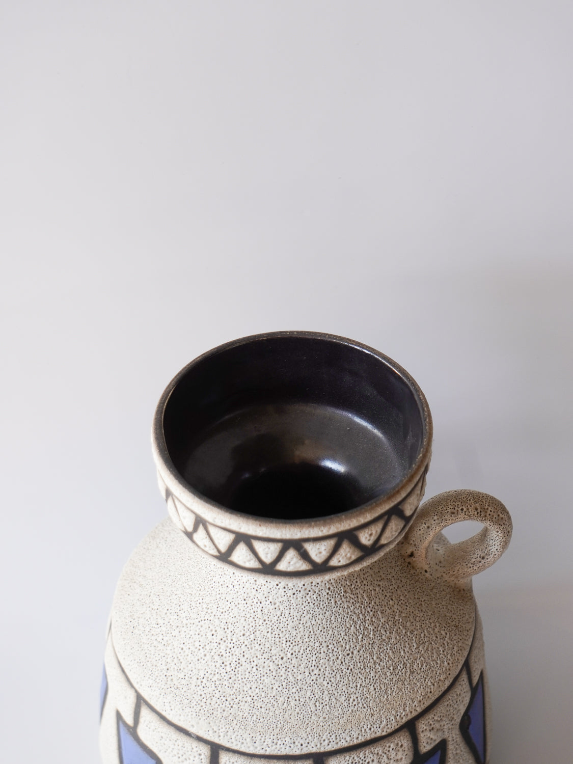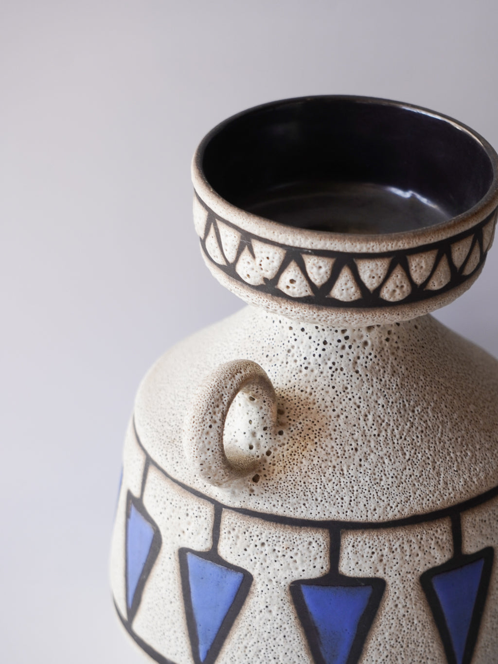 This vintage vase features modern aesthetics. The glossy blue-gray base features a three-dimensional, organic texture, creating a unique finish that changes appearance depending on the angle of the light. The flowing glaze pattern is distinctive, making it a recommended one-of-a-kind art piece.