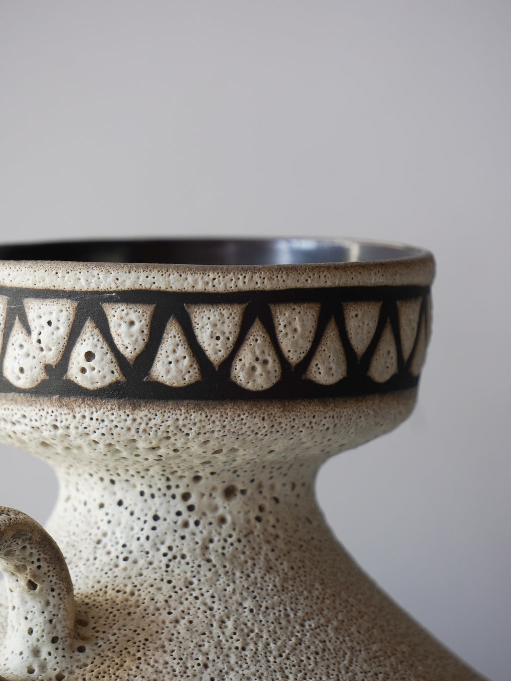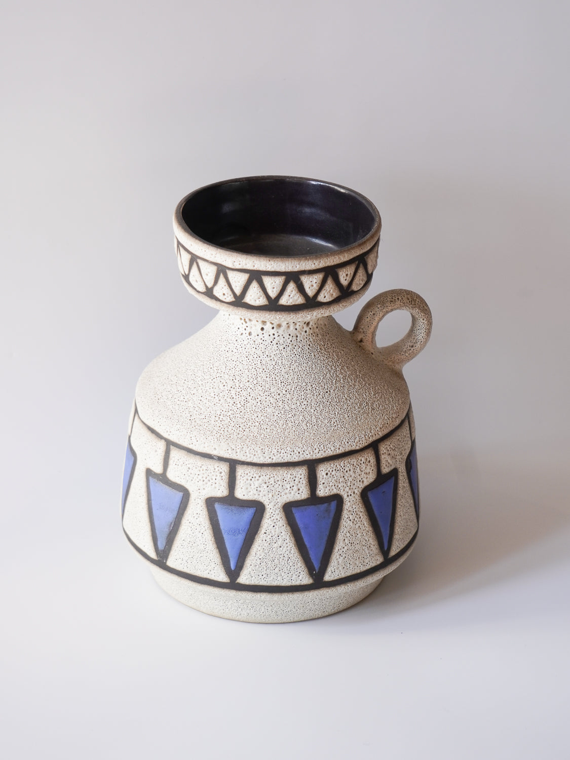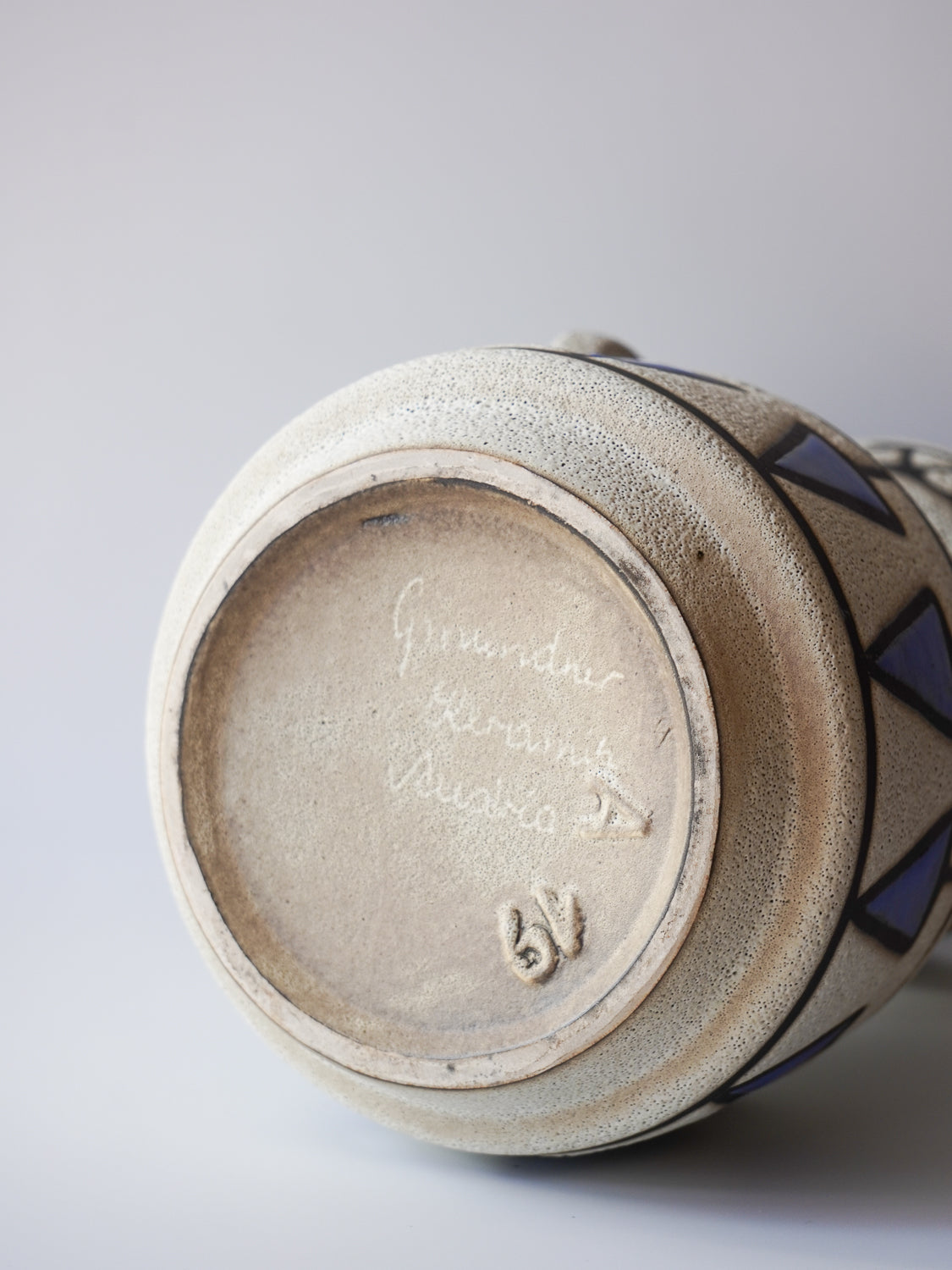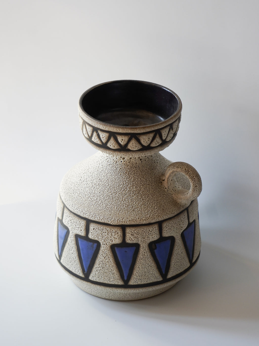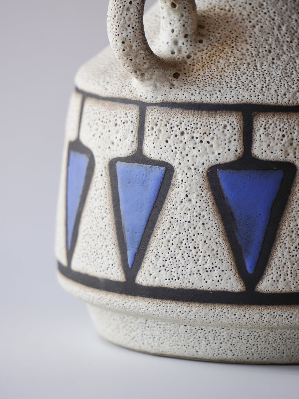 This vintage vase features modern aesthetics. The glossy blue-gray base features a three-dimensional, organic texture, creating a unique finish that changes appearance depending on the angle of the light. The flowing glaze pattern is distinctive, making it a recommended one-of-a-kind art piece.
