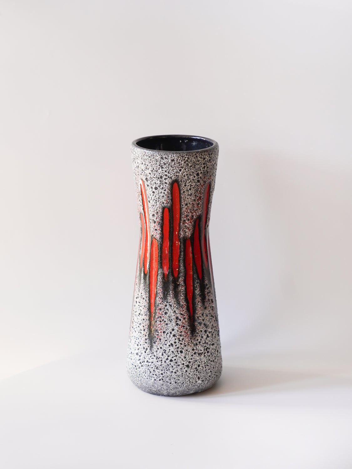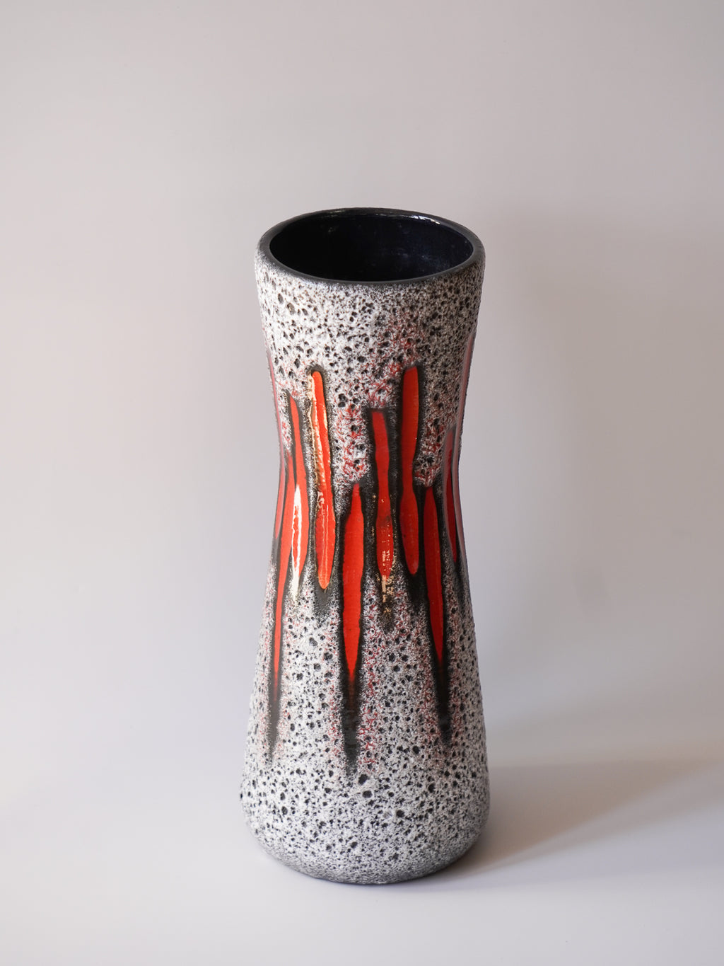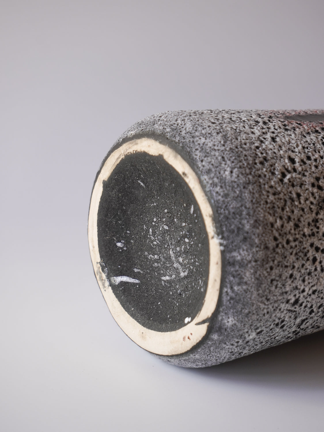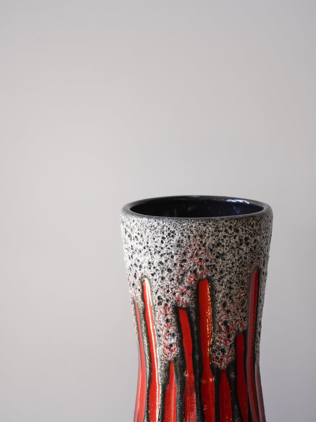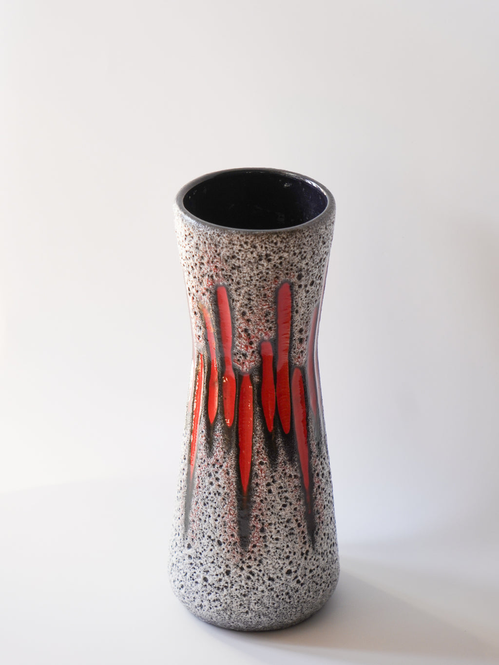 This vintage vase features modern aesthetics. The glossy blue-gray base features a three-dimensional, organic texture, creating a unique finish that changes appearance depending on the angle of the light. The flowing glaze pattern is distinctive, making it a recommended one-of-a-kind art piece.