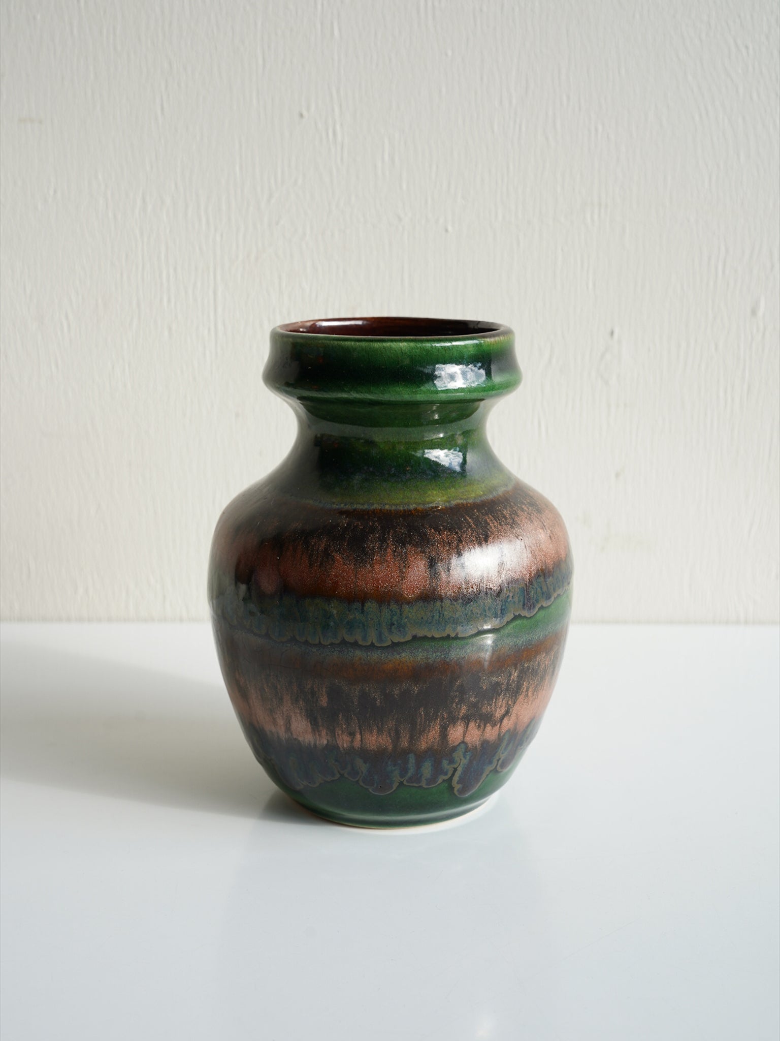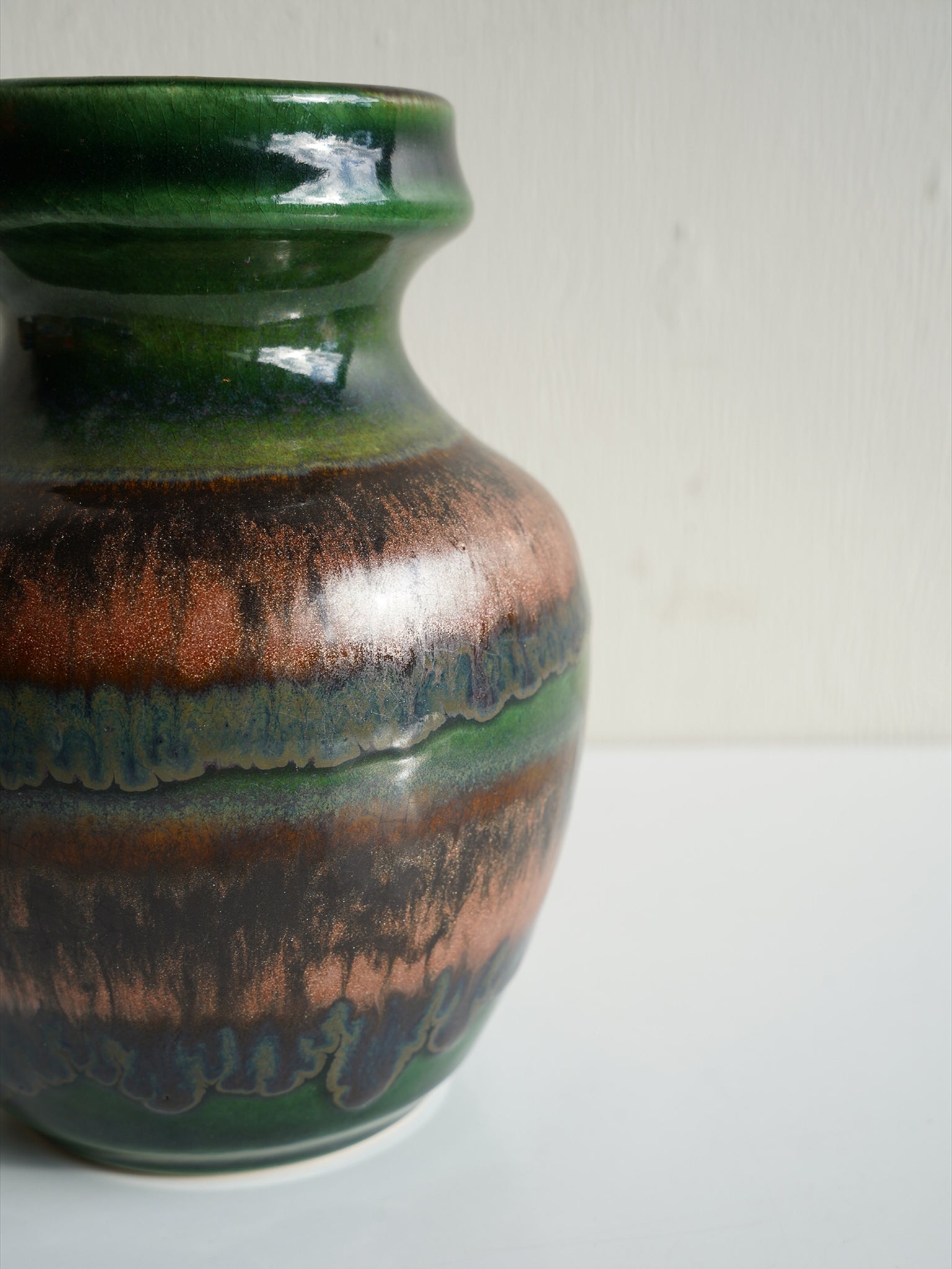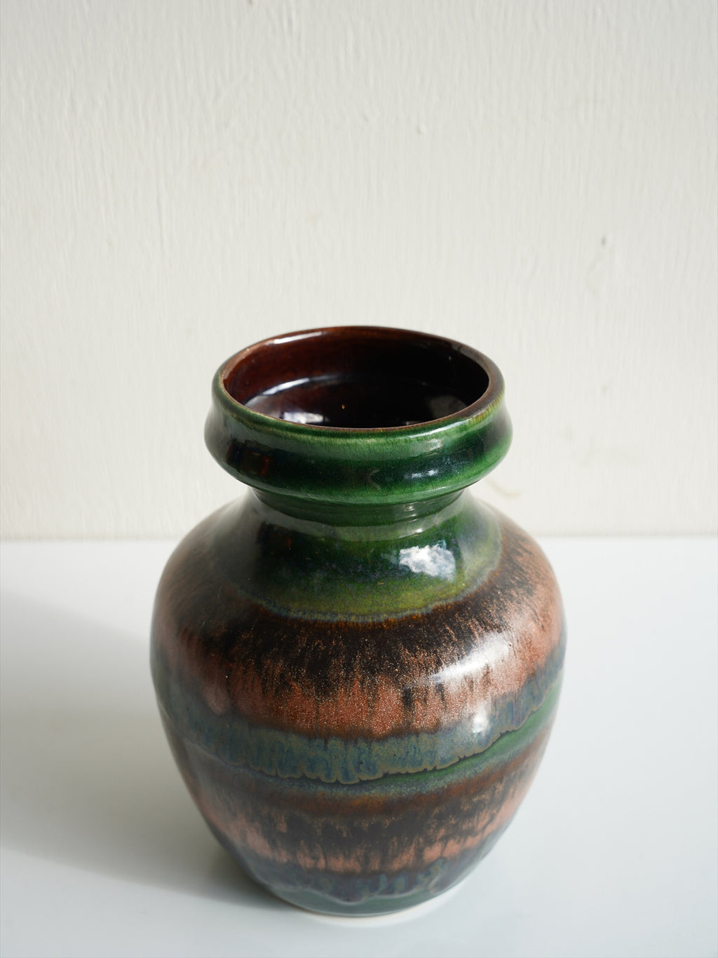 特に中央のブラウンと銅色の部分に見られる釉薬の質感の変化は、西ドイツ陶器らしい力強いアート性を感じさせます。