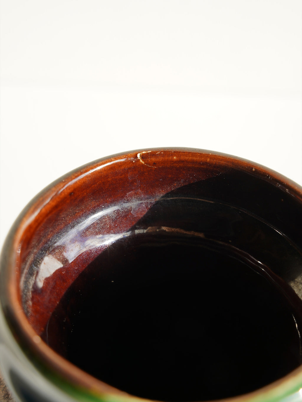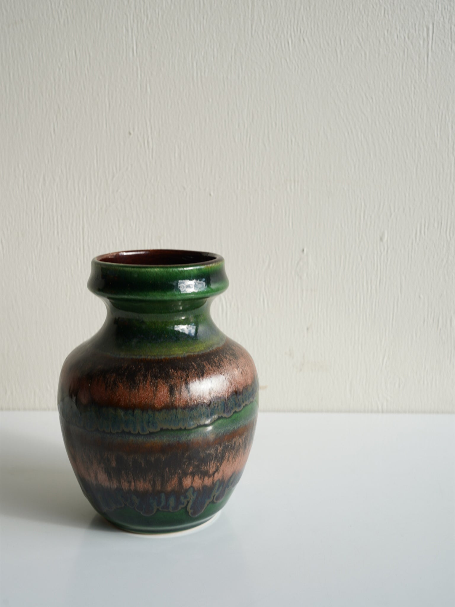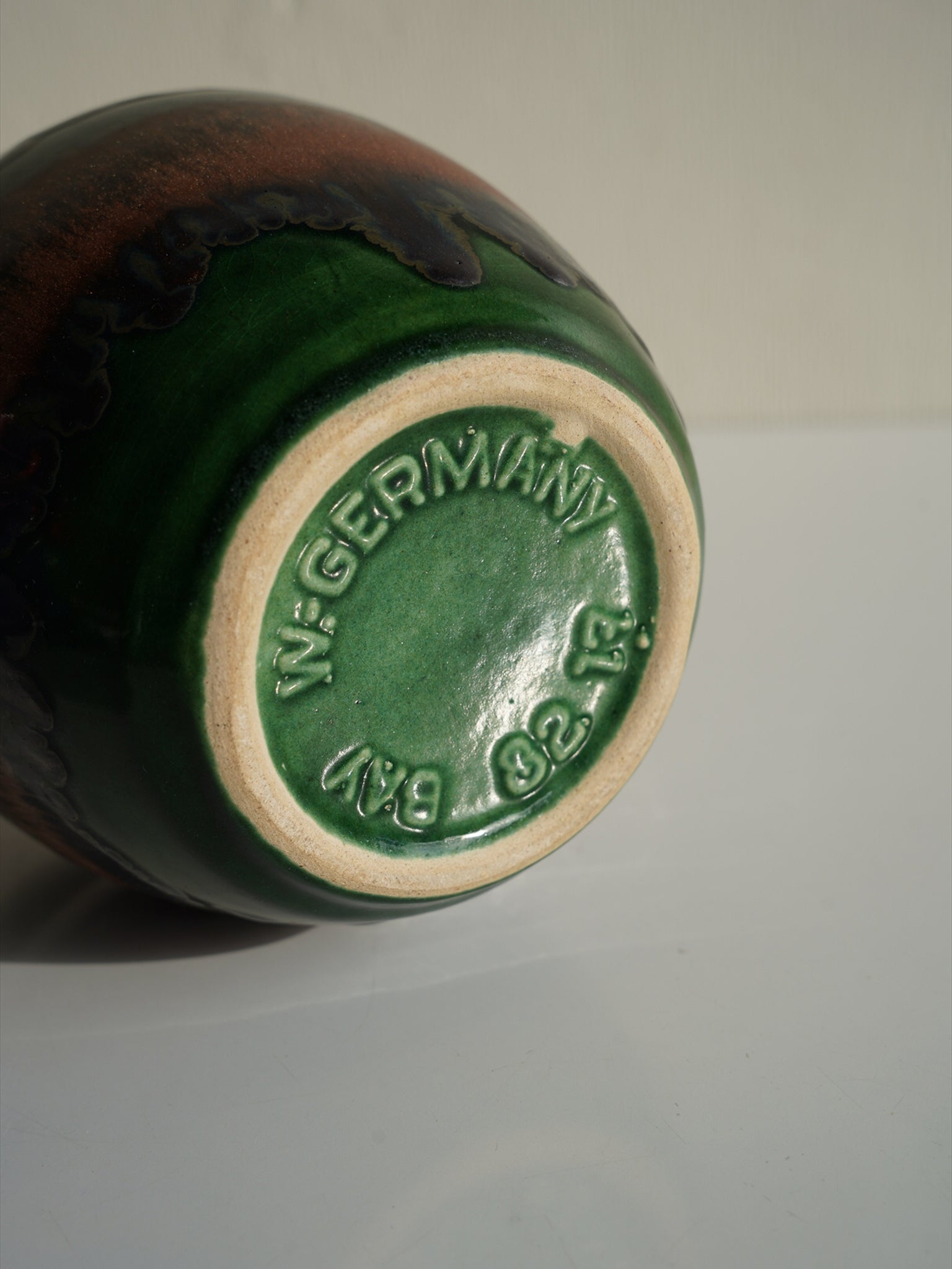 特に中央のブラウンと銅色の部分に見られる釉薬の質感の変化は、西ドイツ陶器らしい力強いアート性を感じさせます。