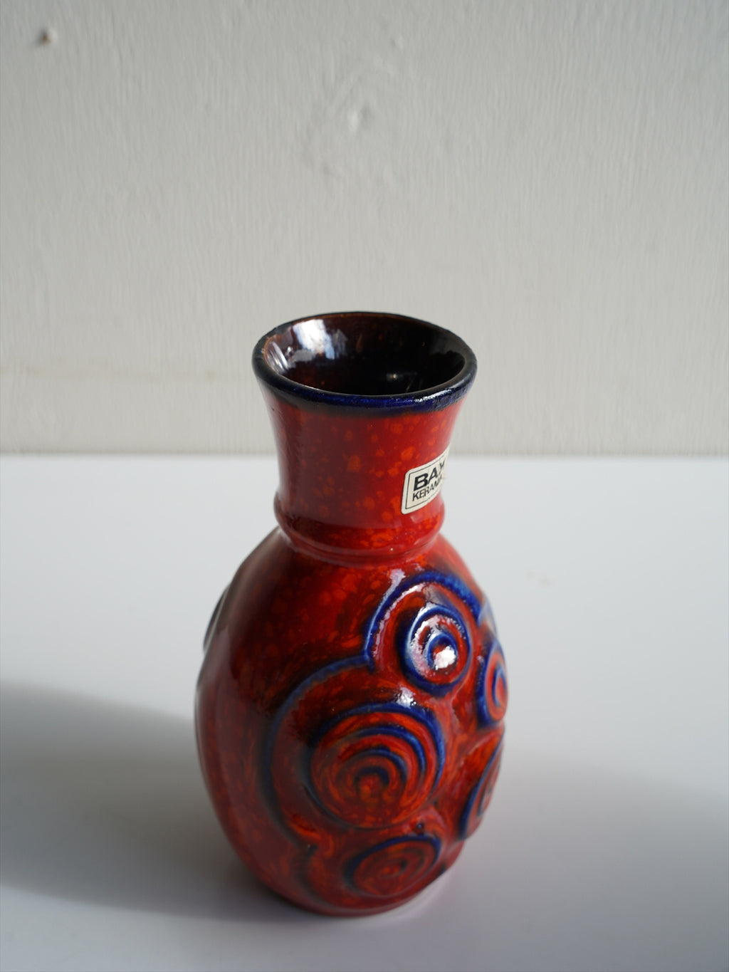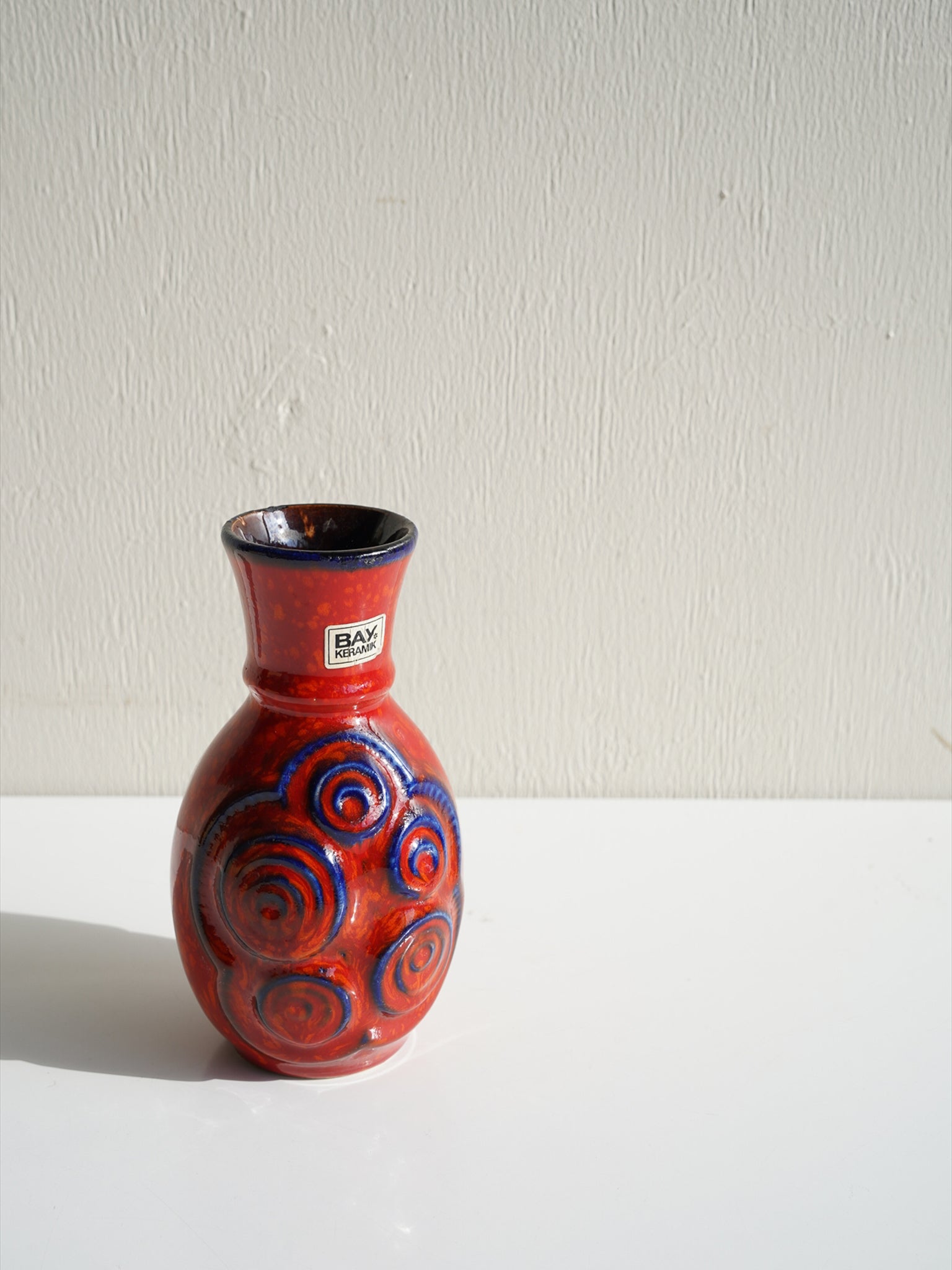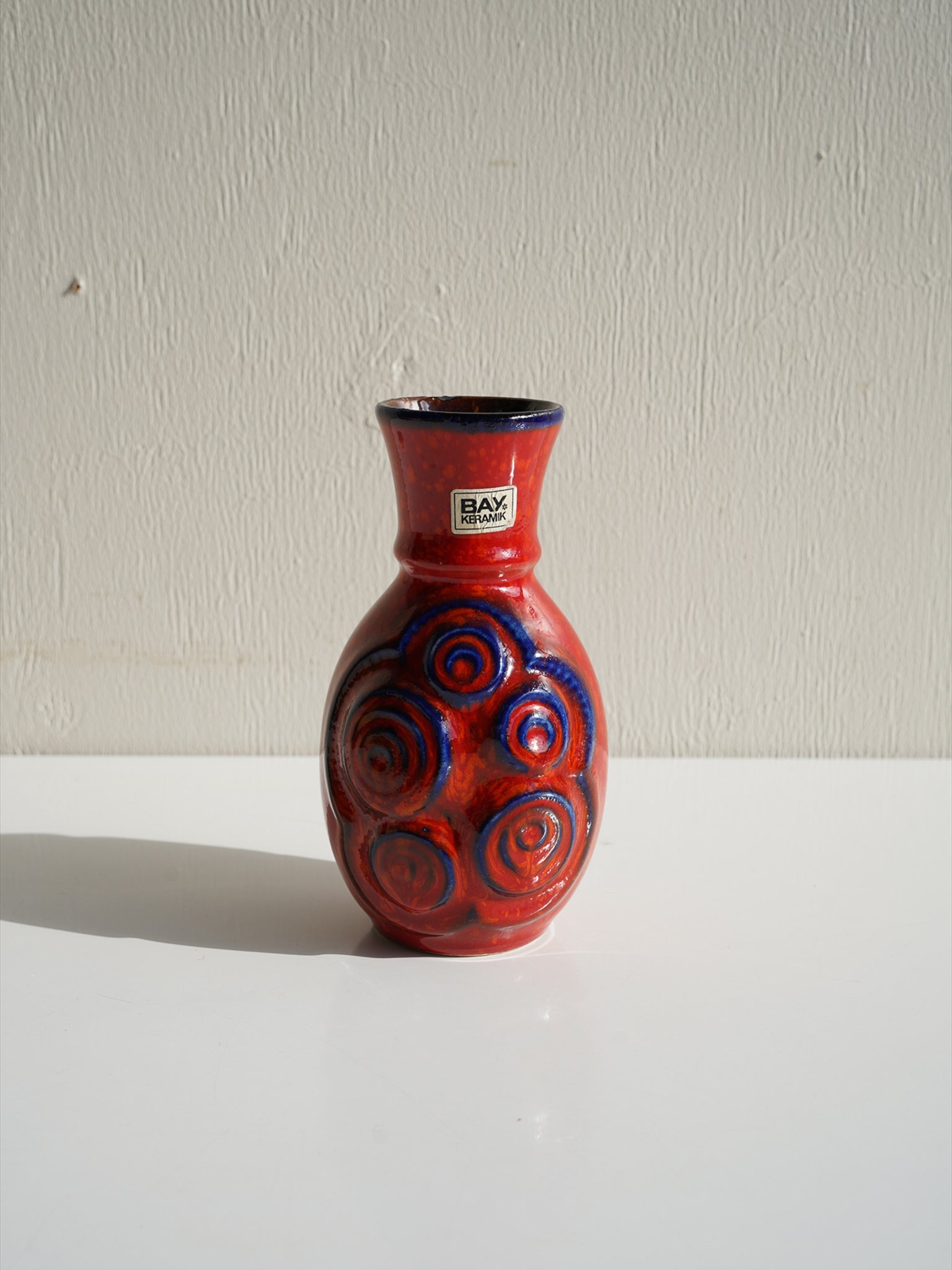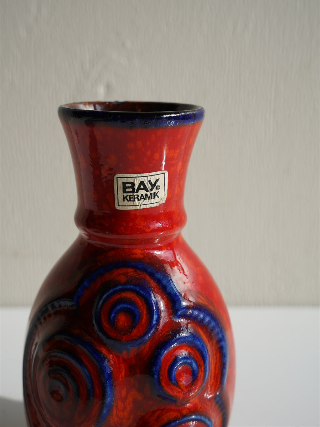 1933年から1997年まで西ドイツに存在した陶器メーカーです。戦後、急速に成長し、Scheurich(シューリッヒ)と並ぶ西ドイツ陶器界の主要メーカーの一つとなりました。1960年代から70年代にかけては、特に大胆な色彩と幾何学的でモダンなフォルム(球形、ディスク型、円筒形など)を特徴とする製品で人気を博しました。また、厚い溶岩釉薬の製品も多数製造していますが、シンプルな単色やグラデーション釉薬の作品も多く、そのデザインの幅広さが特徴です。製品の底面には型番とサイズのほか、しばしば「BAY」のロゴや星、花のシンボルが刻印されました。