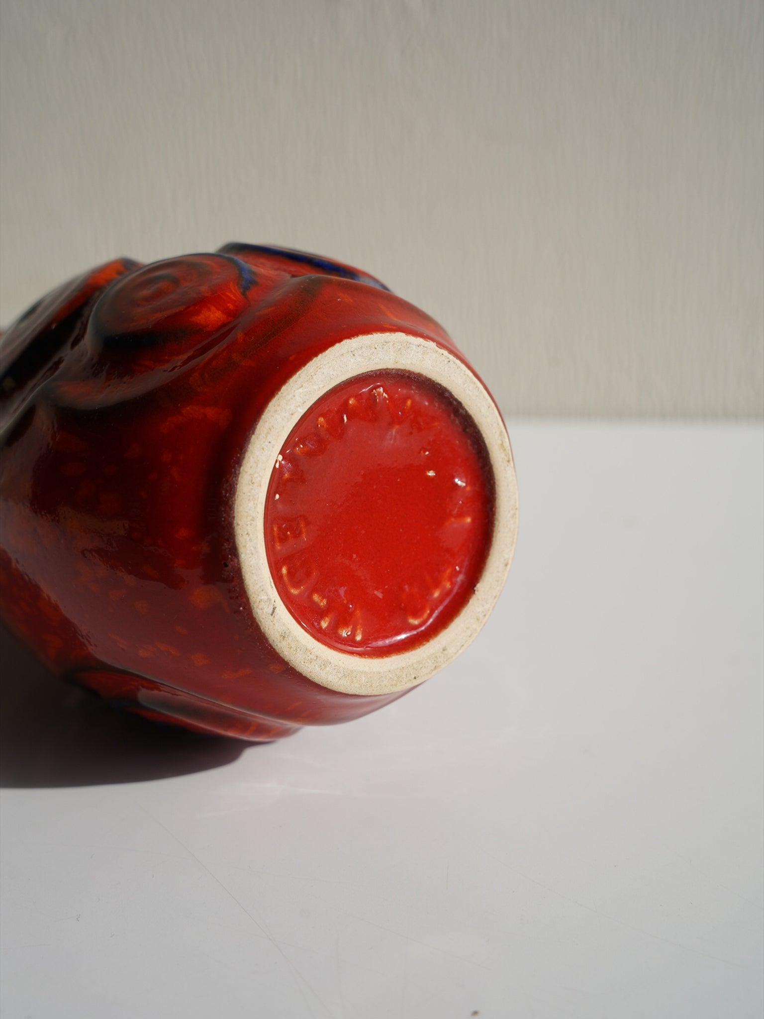 鮮やかなレッドとブルーのコントラストが目を引くこのベースは、表面に施された大胆な渦巻き状のレリーフが特徴。艶のある釉薬がレリーフの凹凸にたまり、深い陰影と独特の立体感を生み出しています。