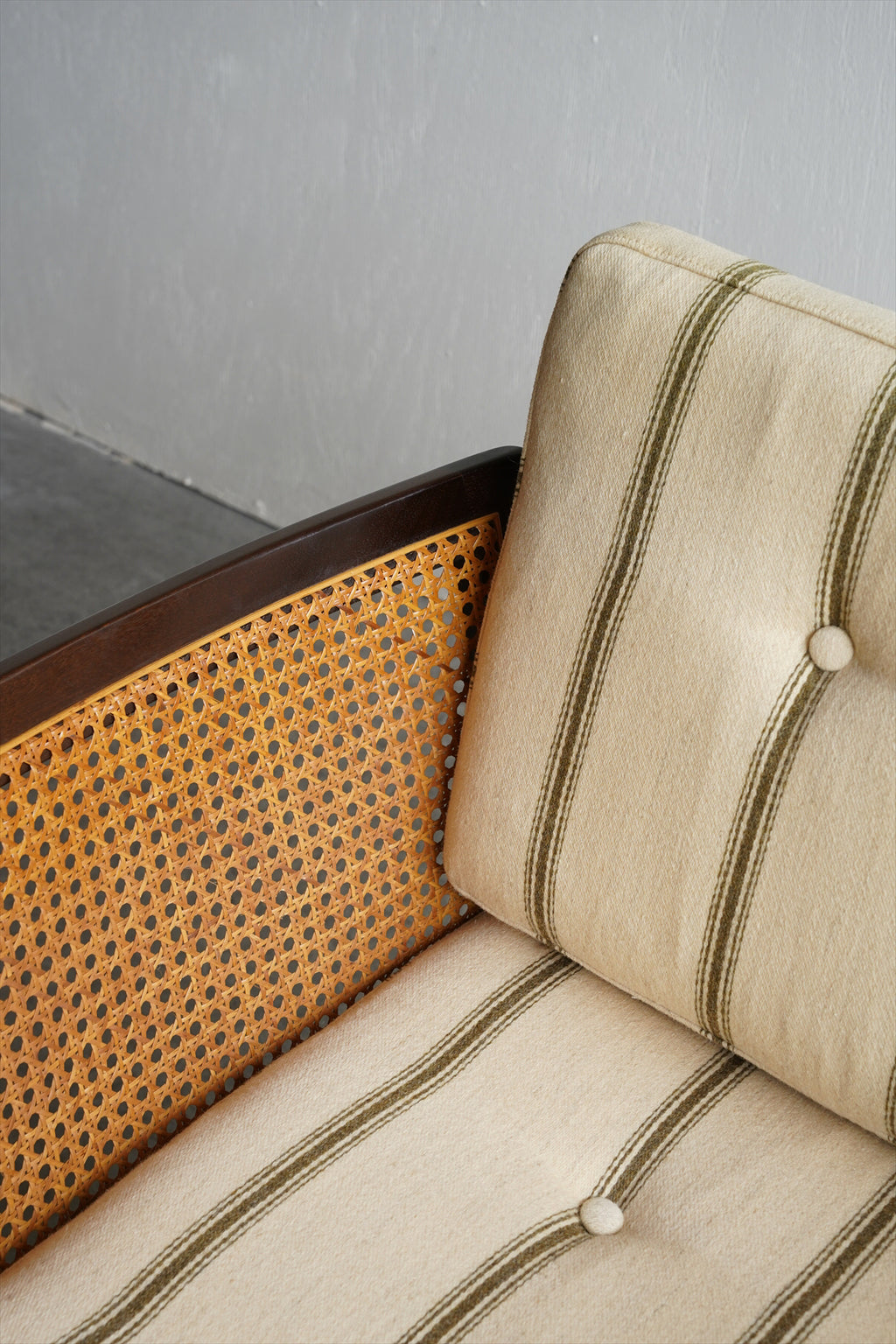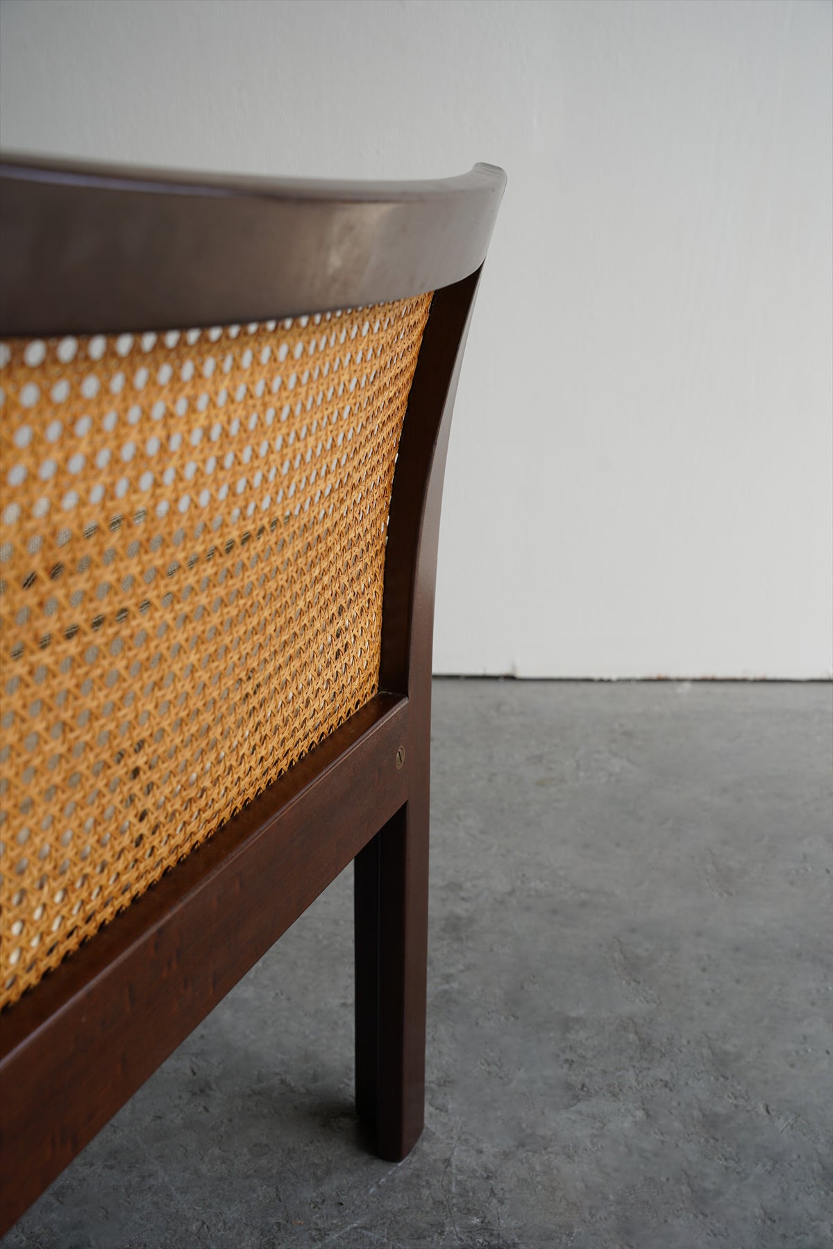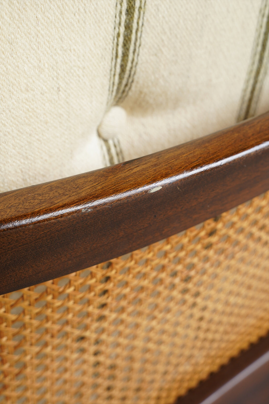 The frame is made of warm wood and features woven rattan on the back and sides.