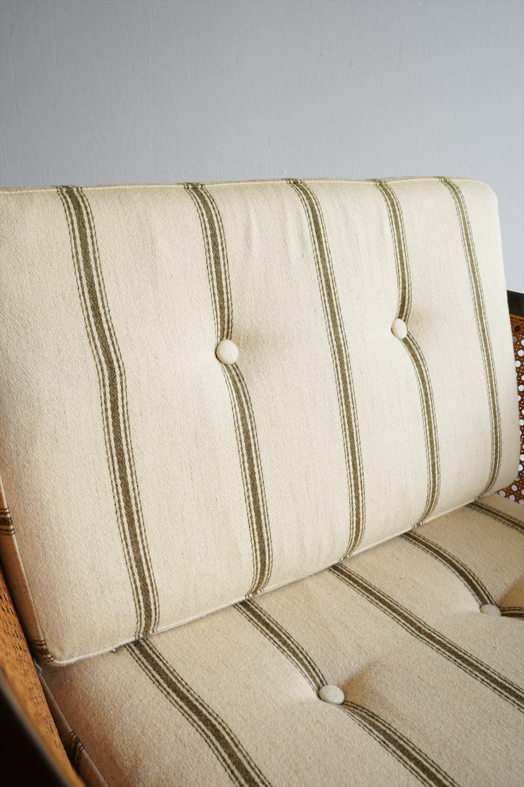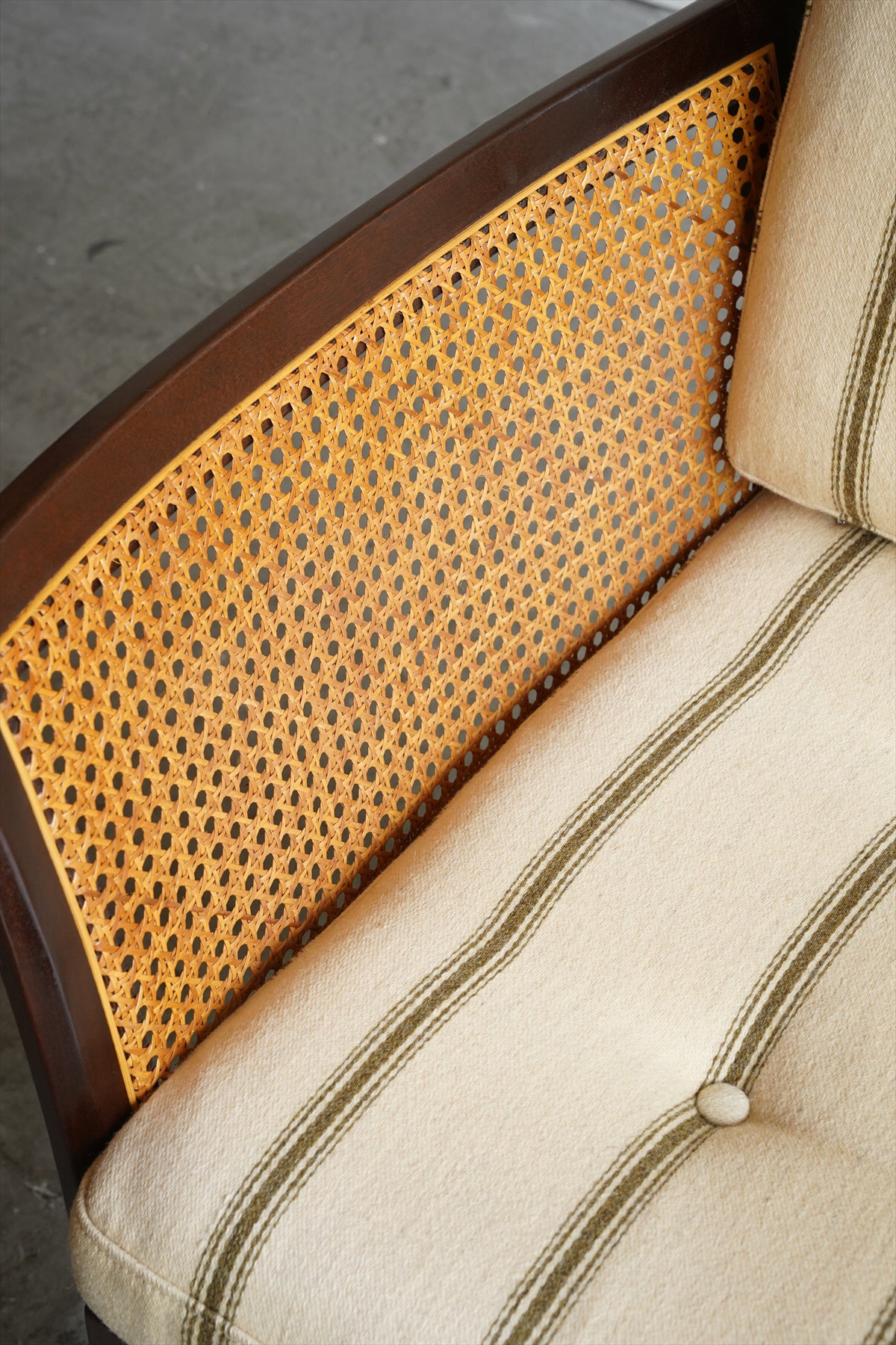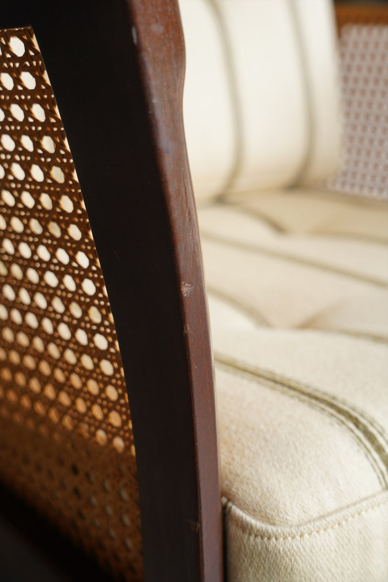The frame is made of warm wood and features woven rattan on the back and sides.