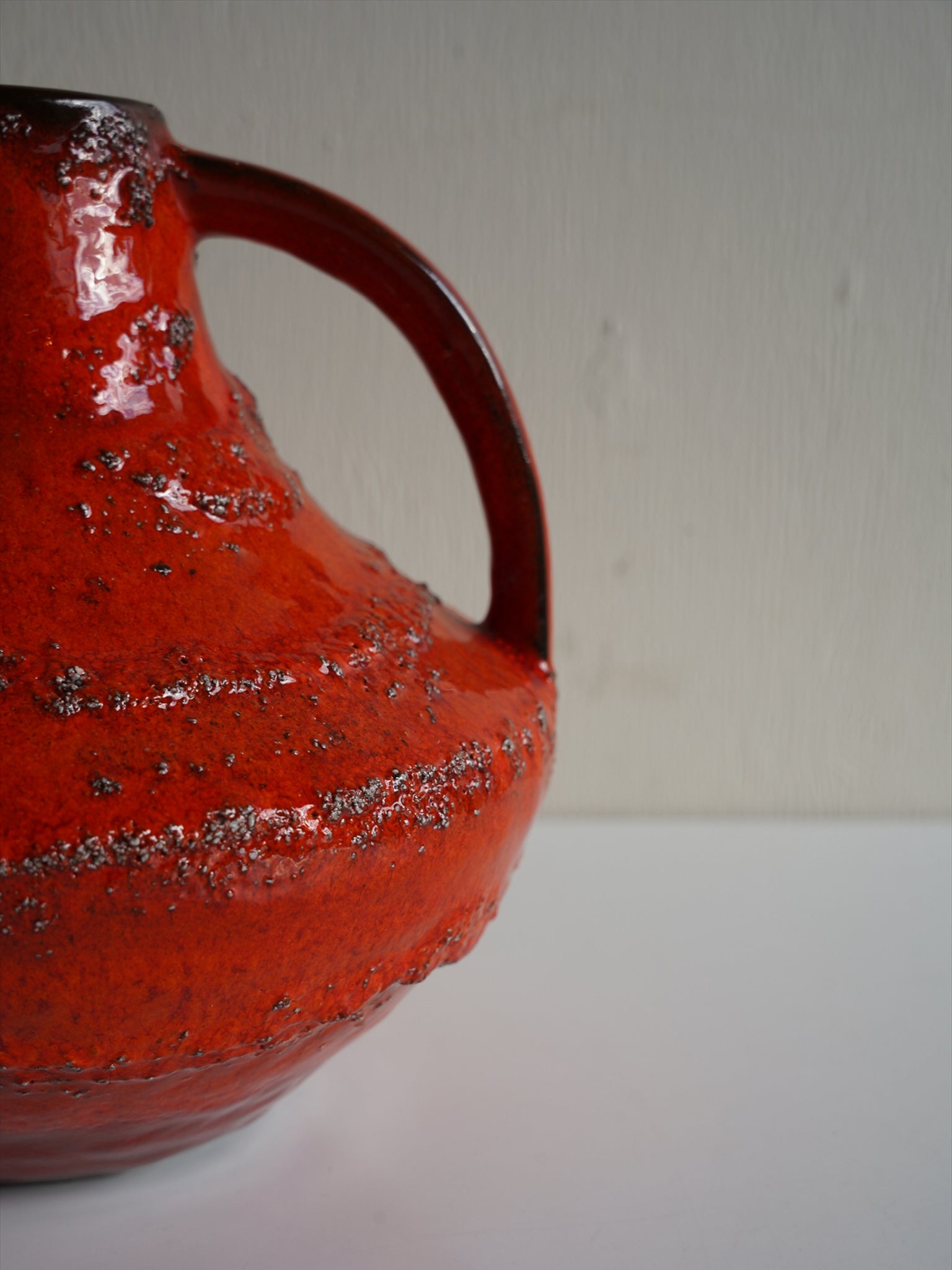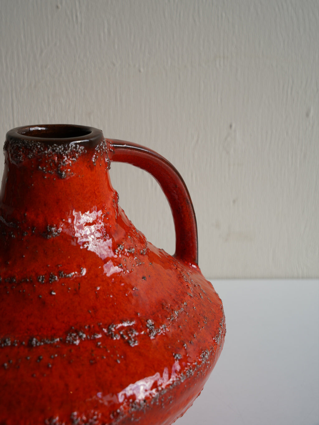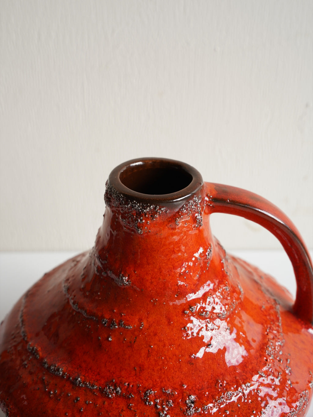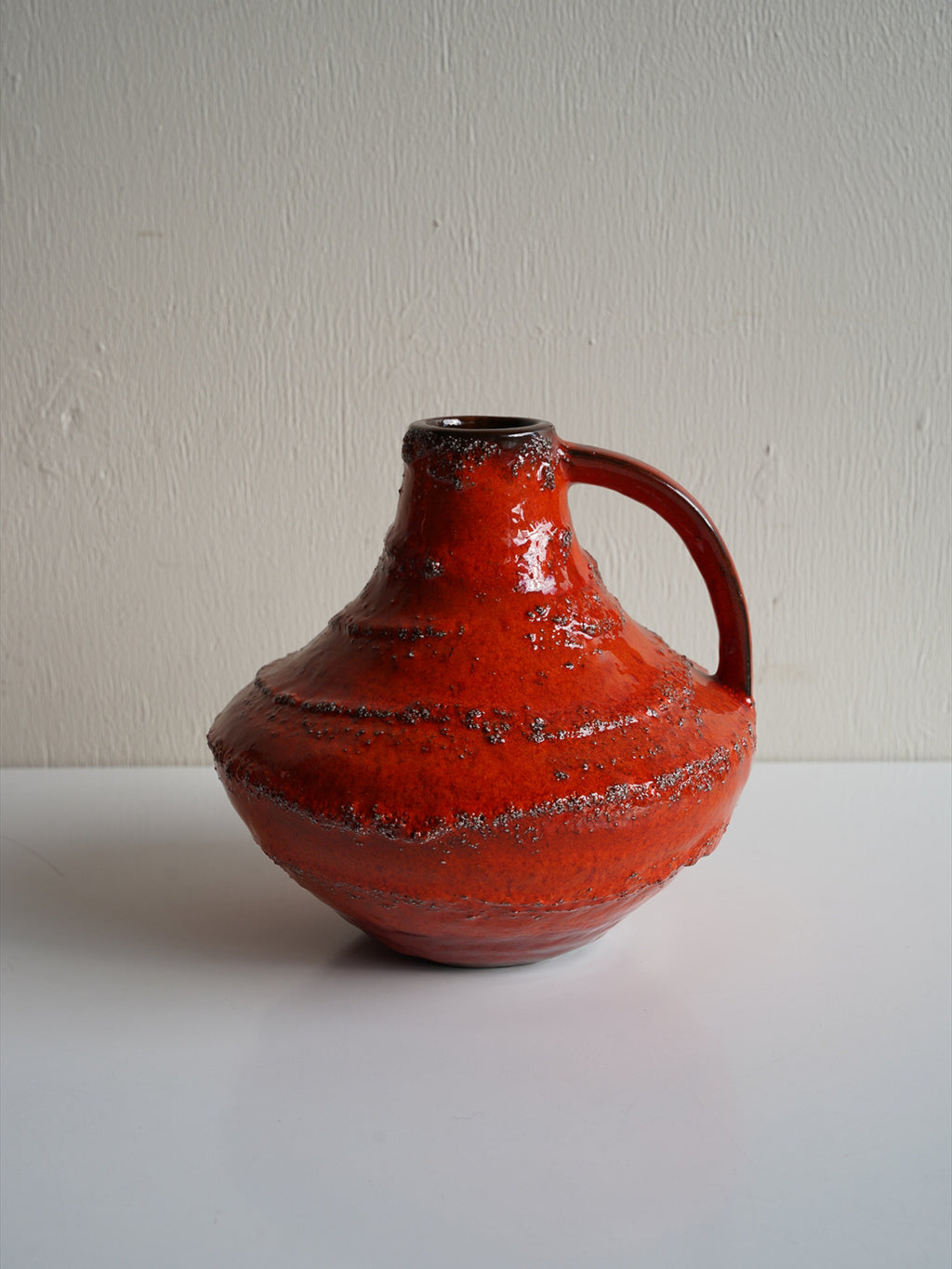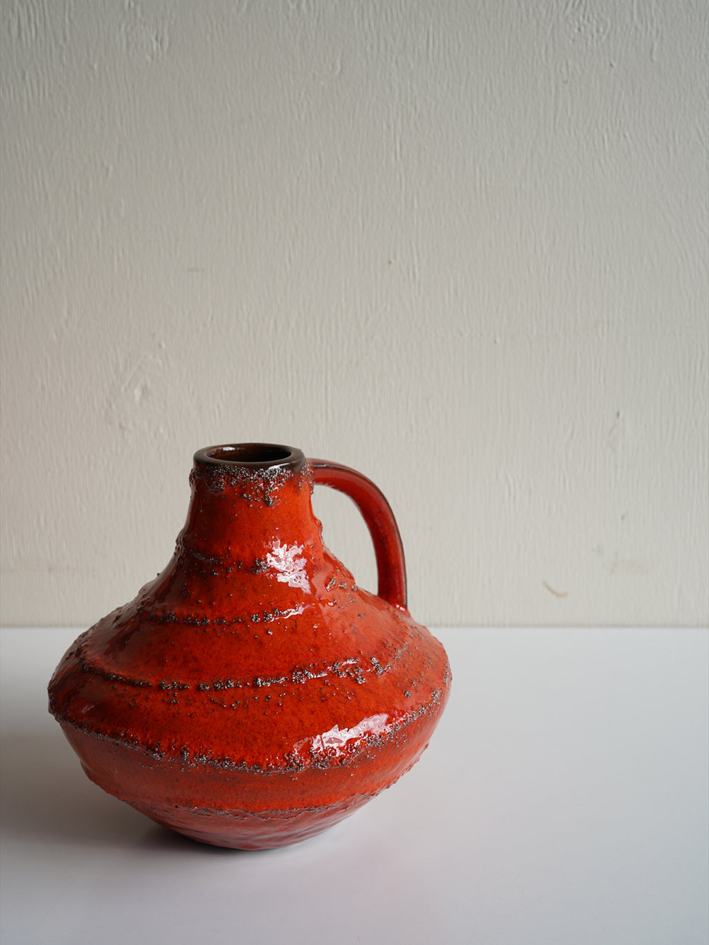 手作業で取り付けられた大きなハンドルが、デザインに実用的なアクセントを加えています。棚に飾るオブジェとして、また大胆な花を活ける花器として、空間に強烈な個性の炎を灯す逸品です。