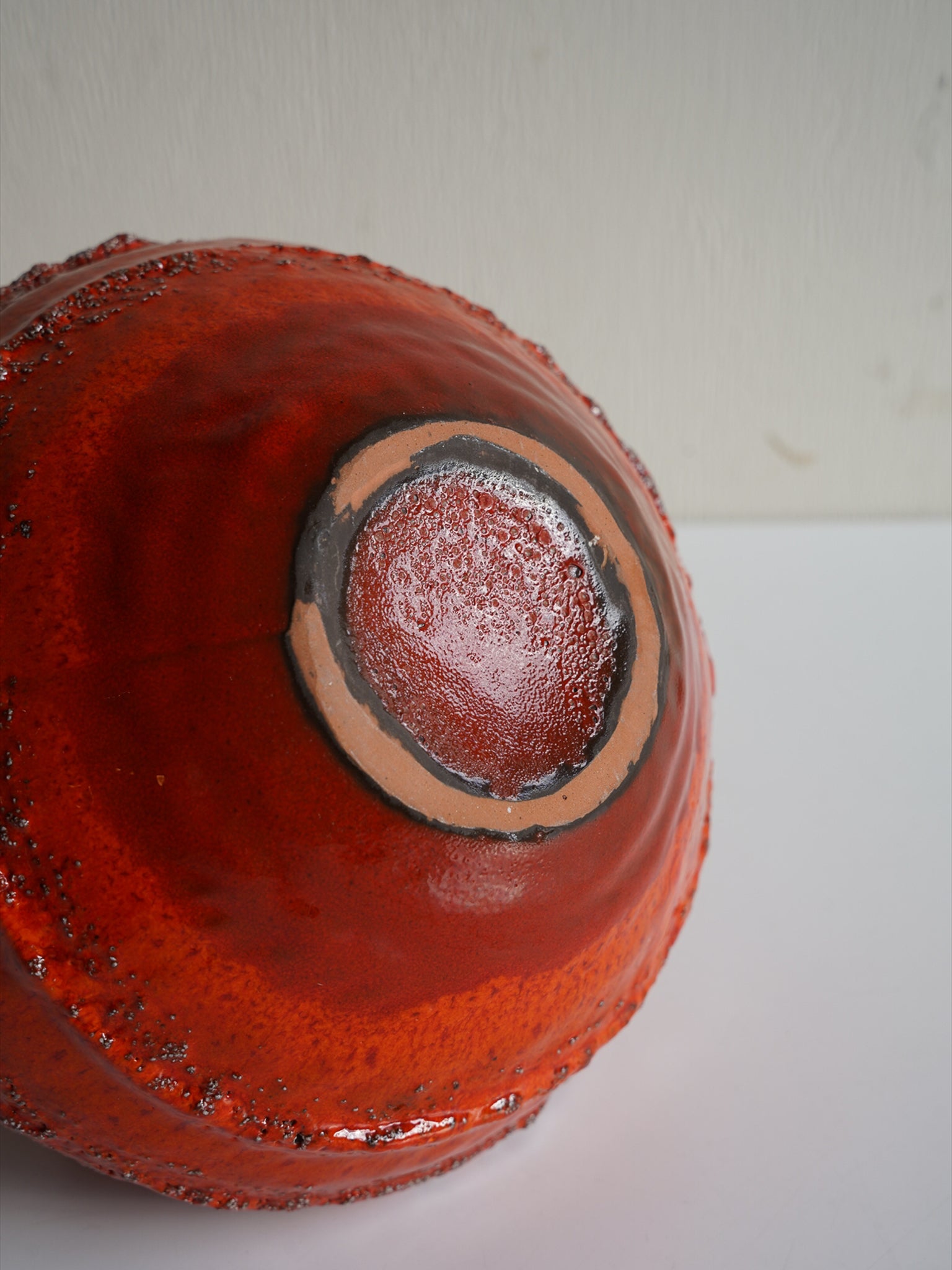 全体を覆うのは、光沢のある鮮烈な朱赤の釉薬と、その中に散りばめられた荒々しい黒い斑点。釉薬の厚みや流れによって生まれる不均一な表面は、まさにFat Lavaを体現する力強いアート性を放ちます。