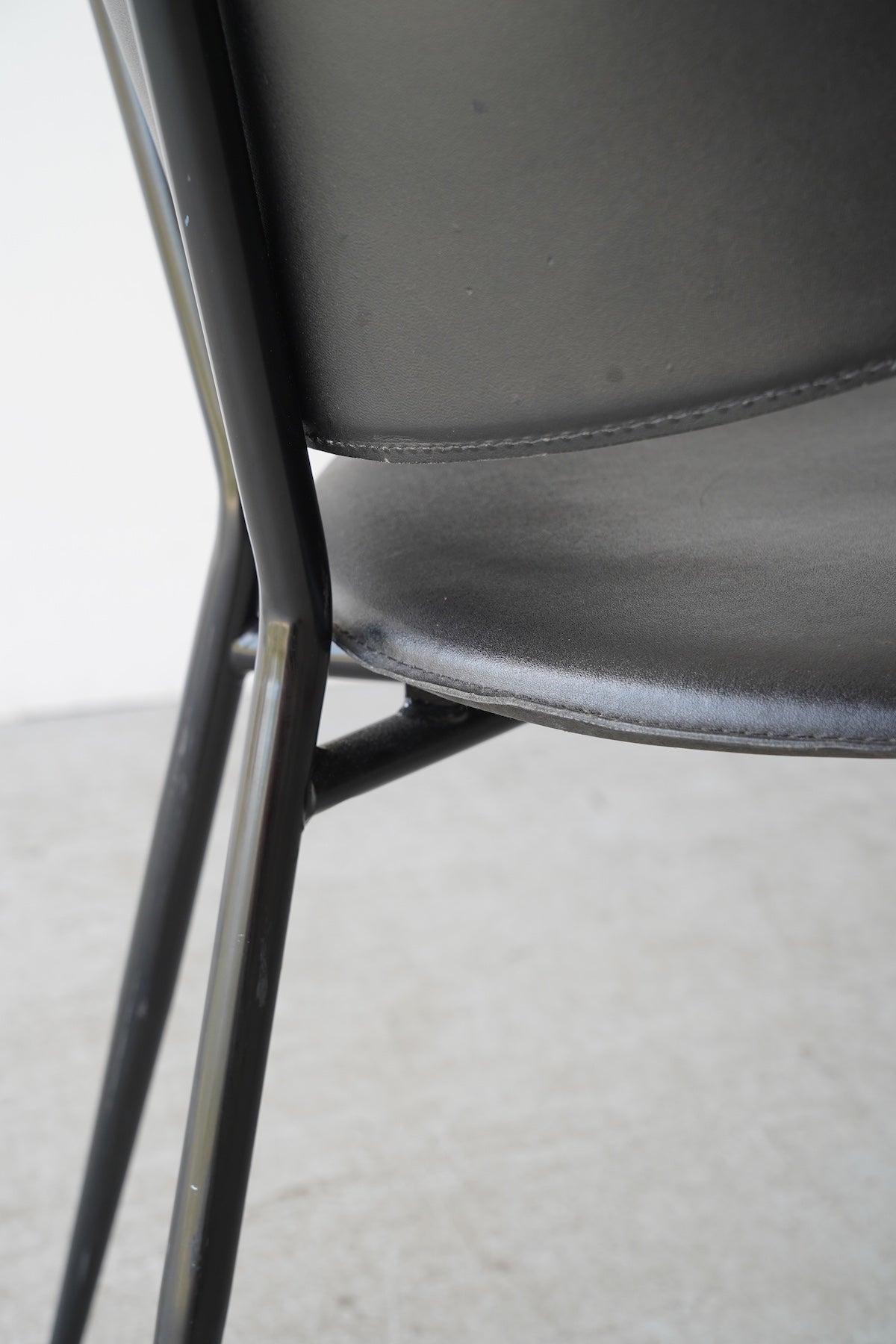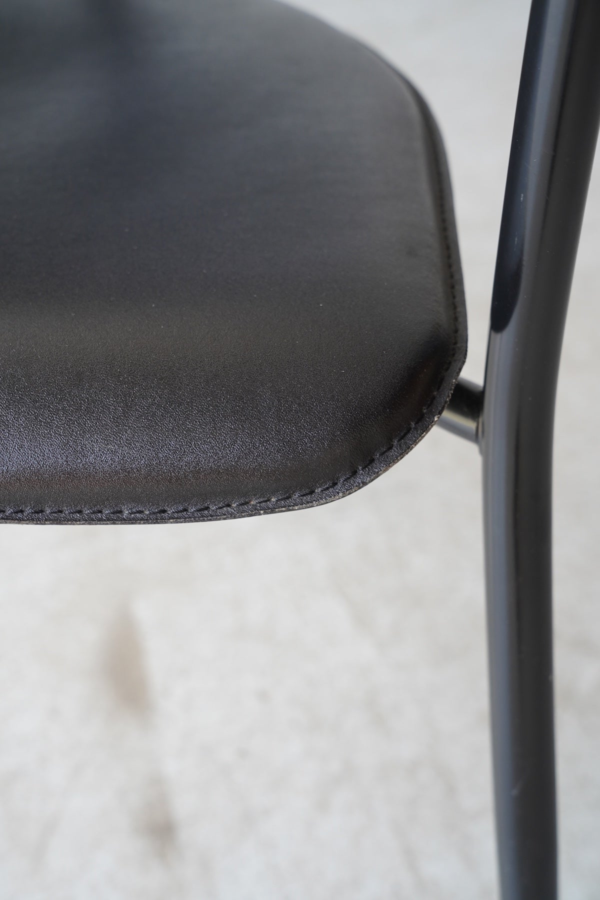 The simple combination of a seat and backrest on a slender black steel frame creates a light yet powerful presence.