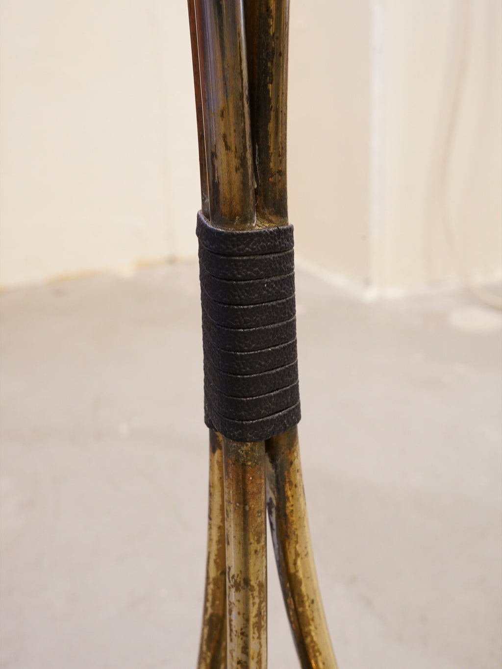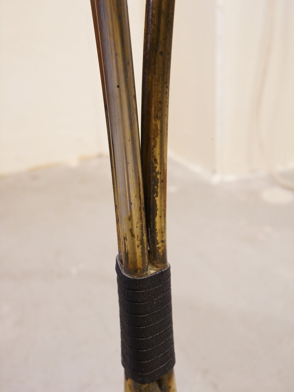 三本に分かれた細身の支柱と、そこから伸びる流線型のアームが織りなす造形は、まるで空間に描かれたアートピースのようです。本体はダークトーンのメタル素材で、中央部分にはデザインのアクセントとして革ひもが巻き付けられています。