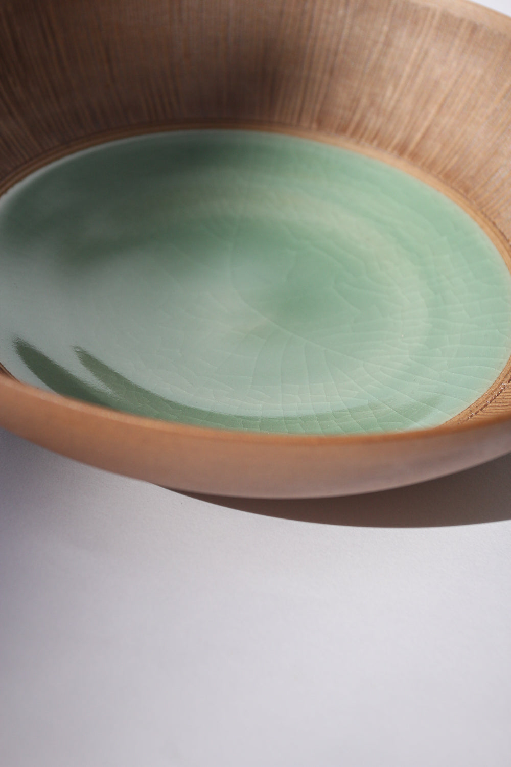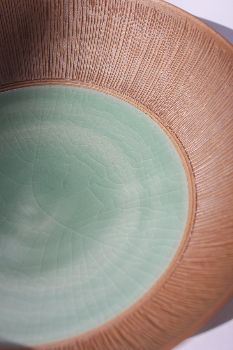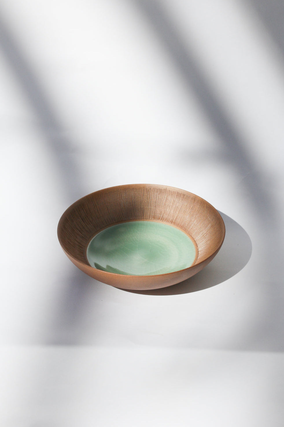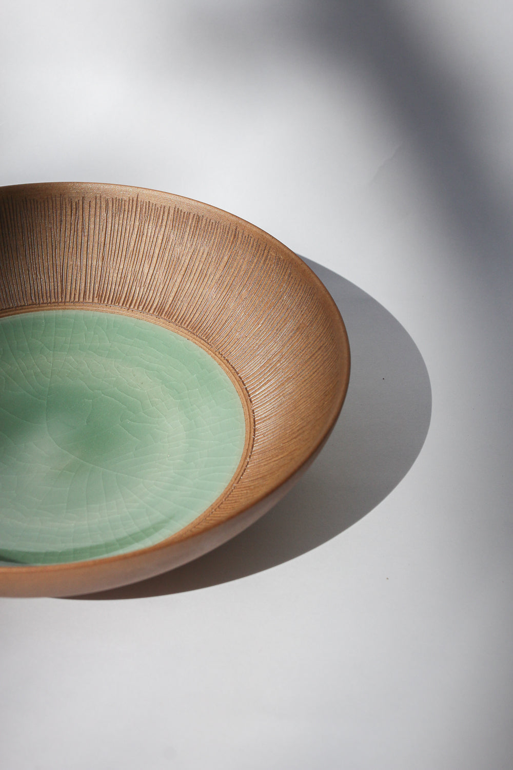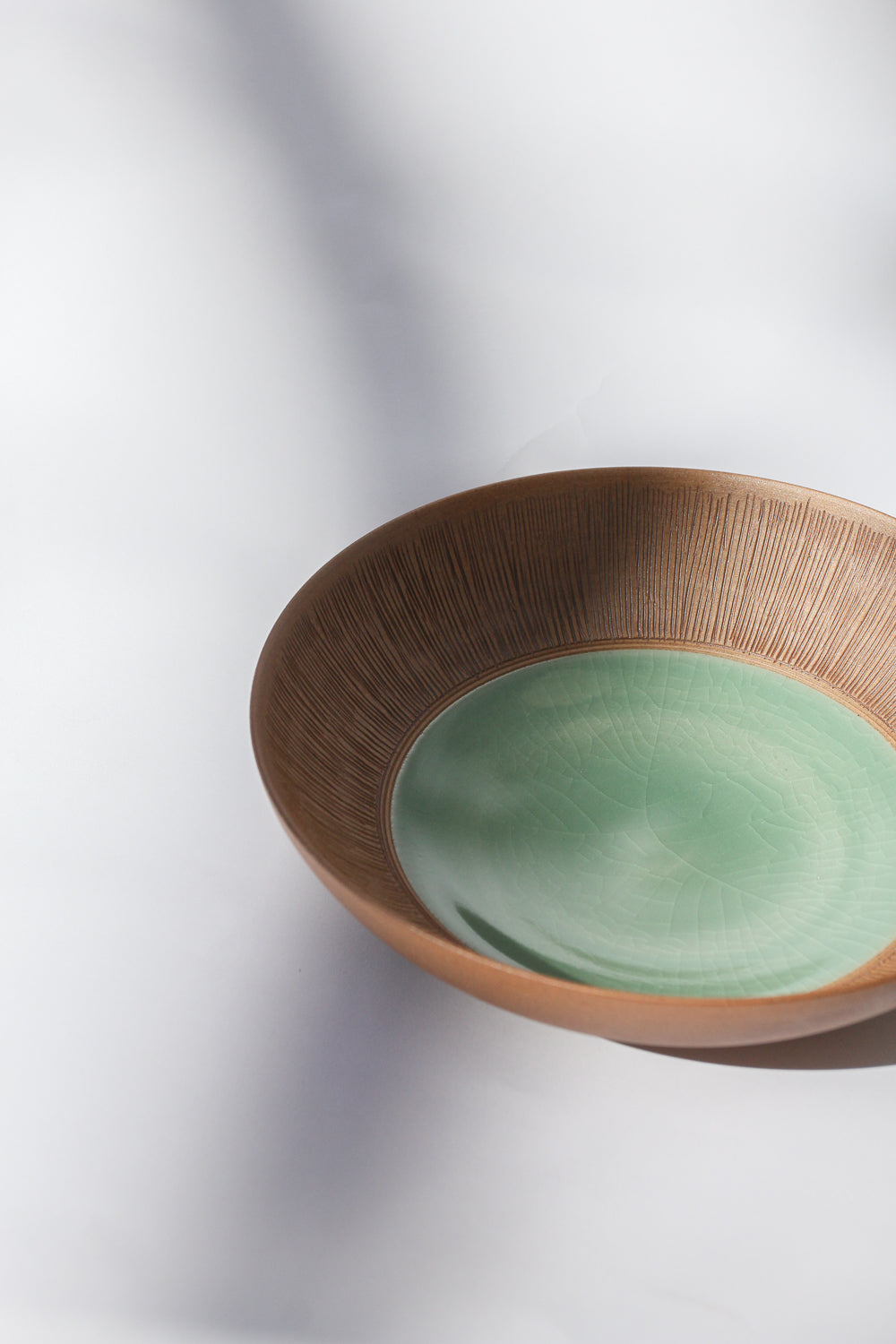 The comb-patterned celadon ware is a delicate design inspired by ancient comb-patterned pottery.
