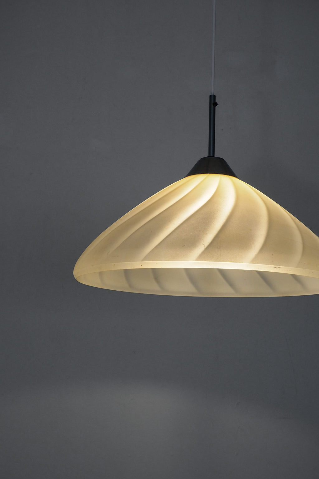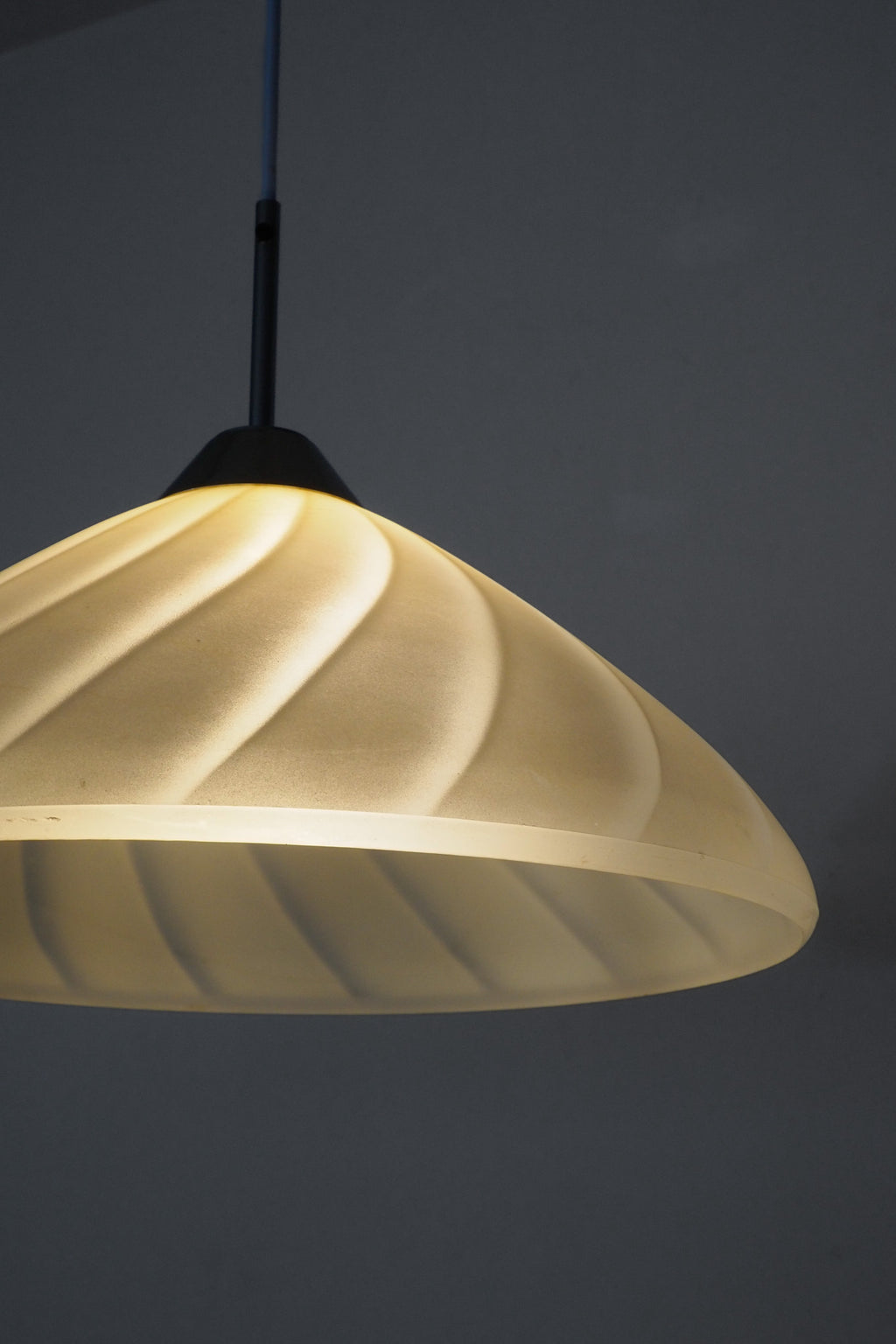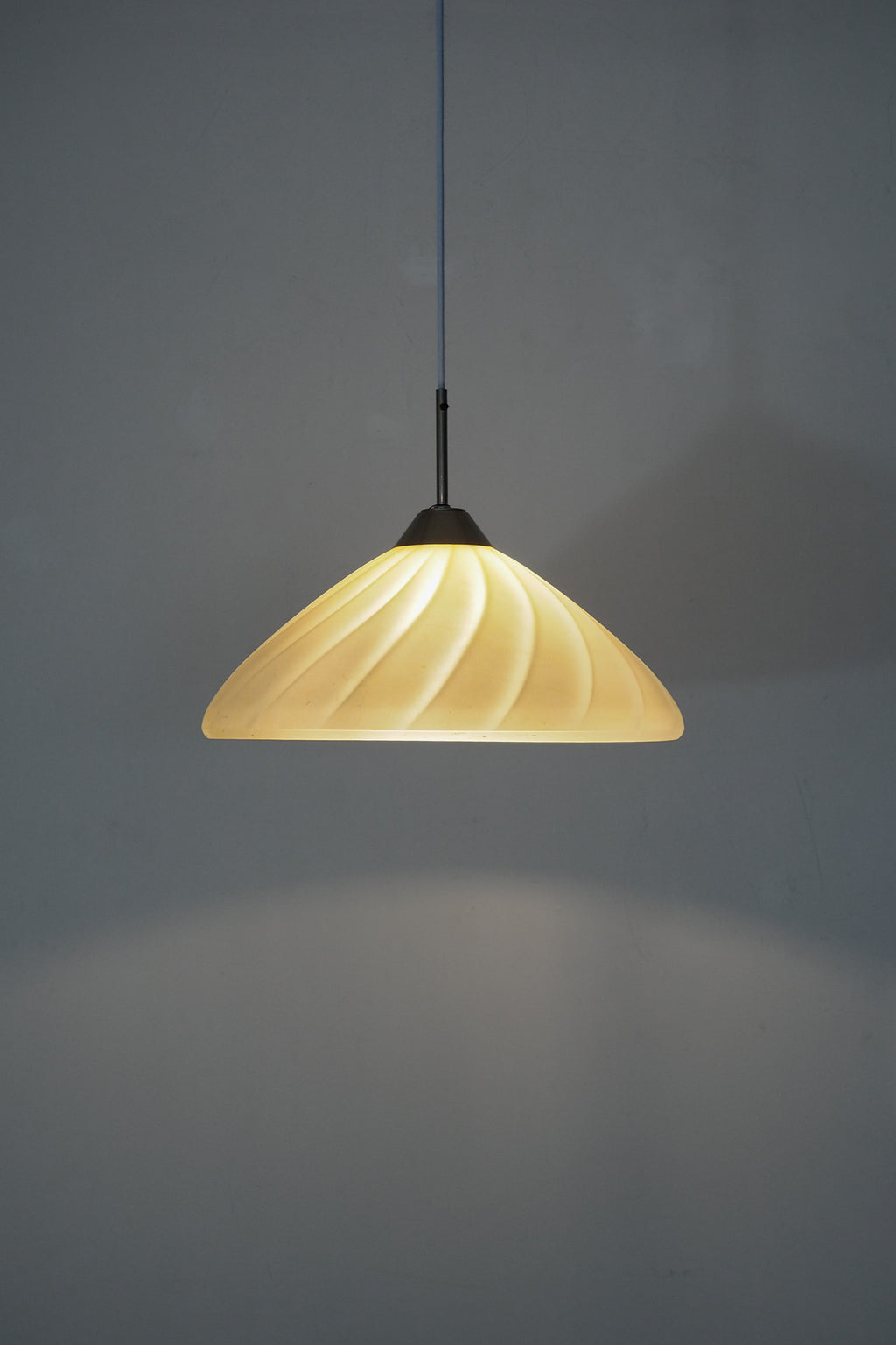 光を灯すと、ガラスシェードに浮かび上がる繊細な波状の模様が印象的なペンダントライトです。