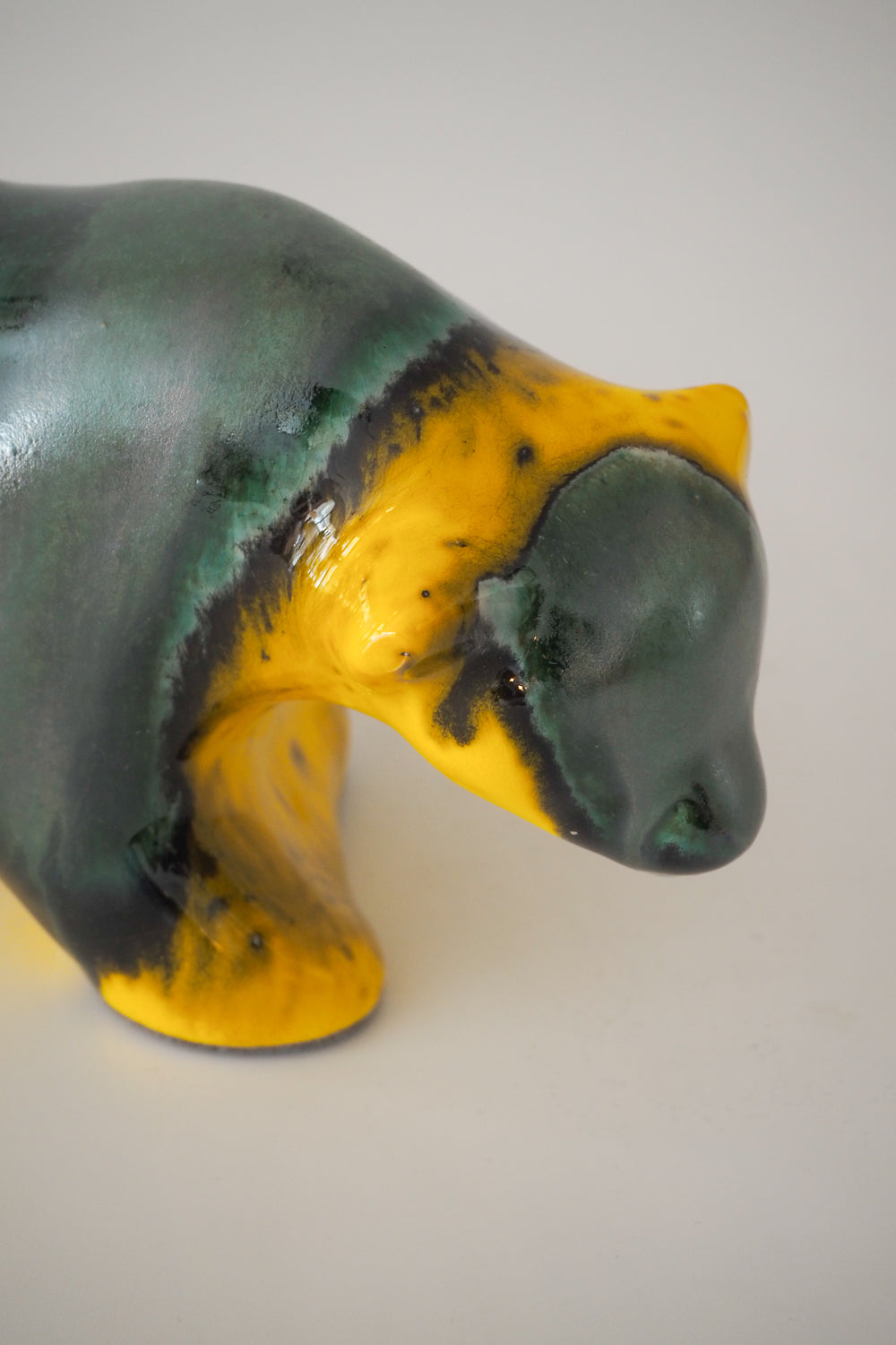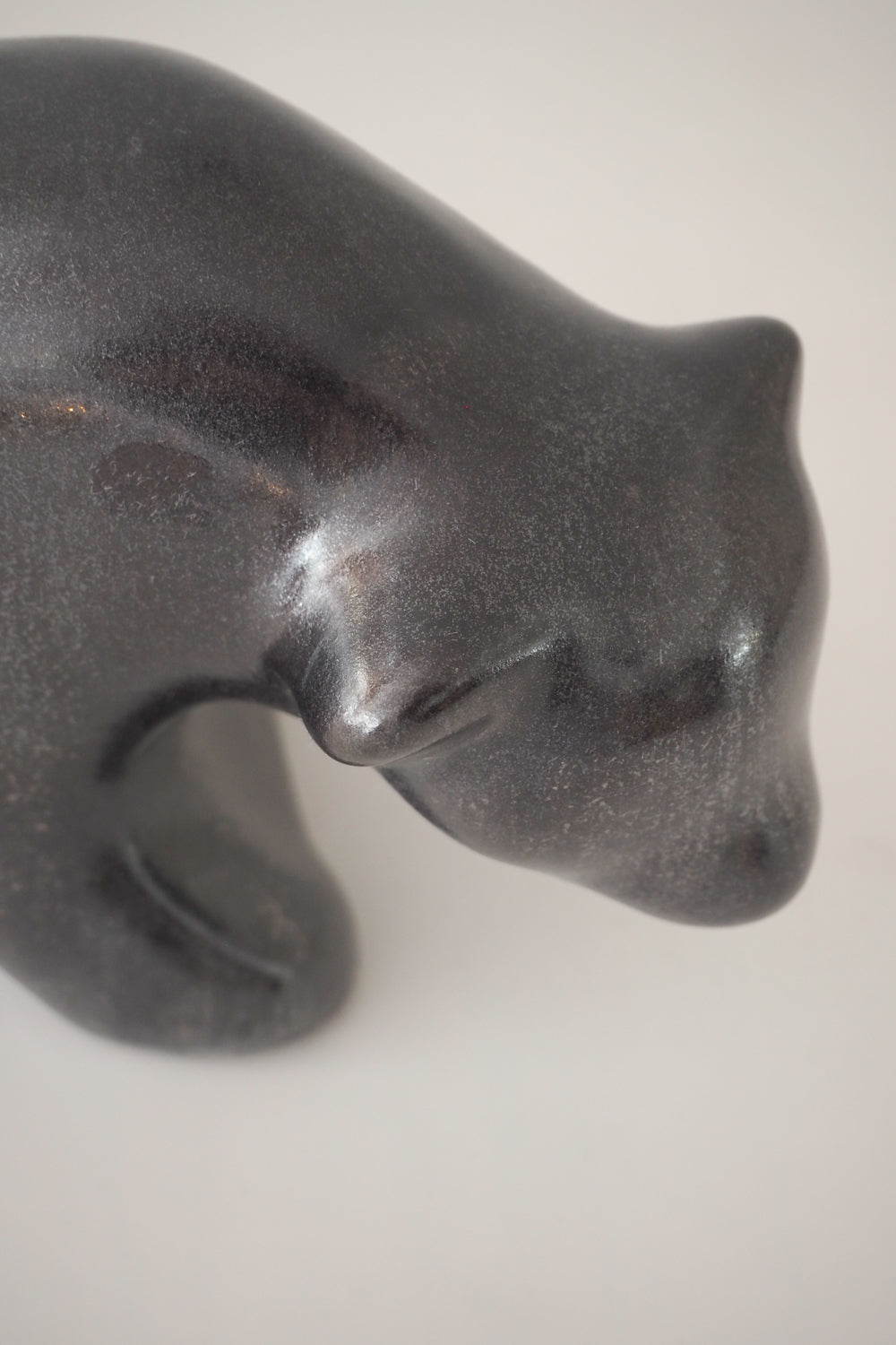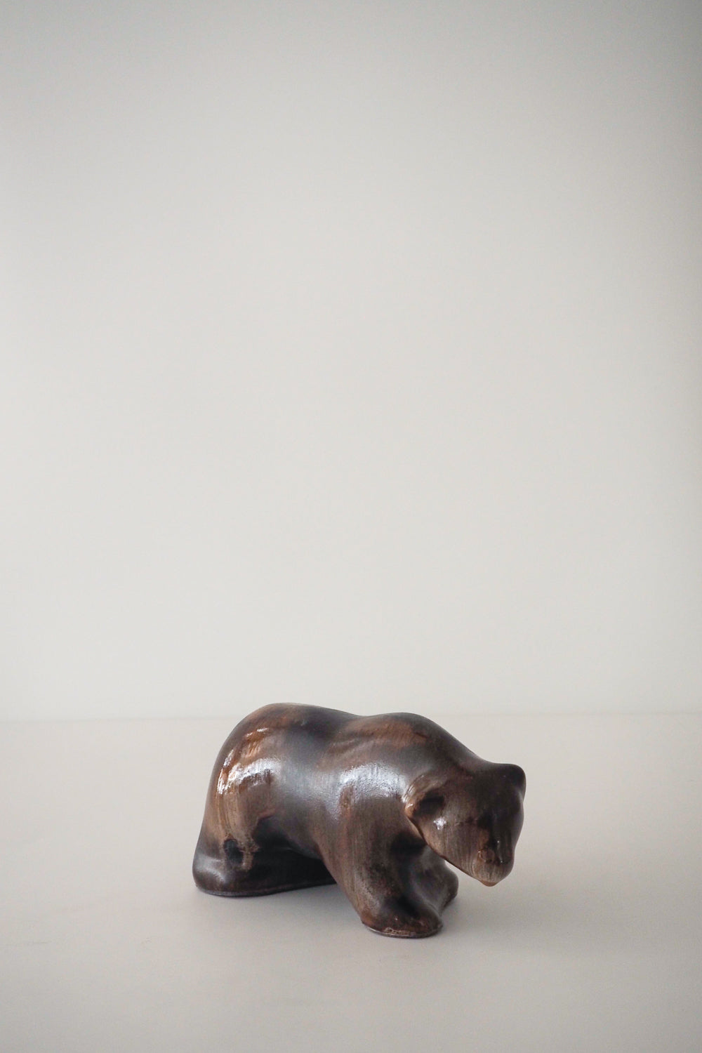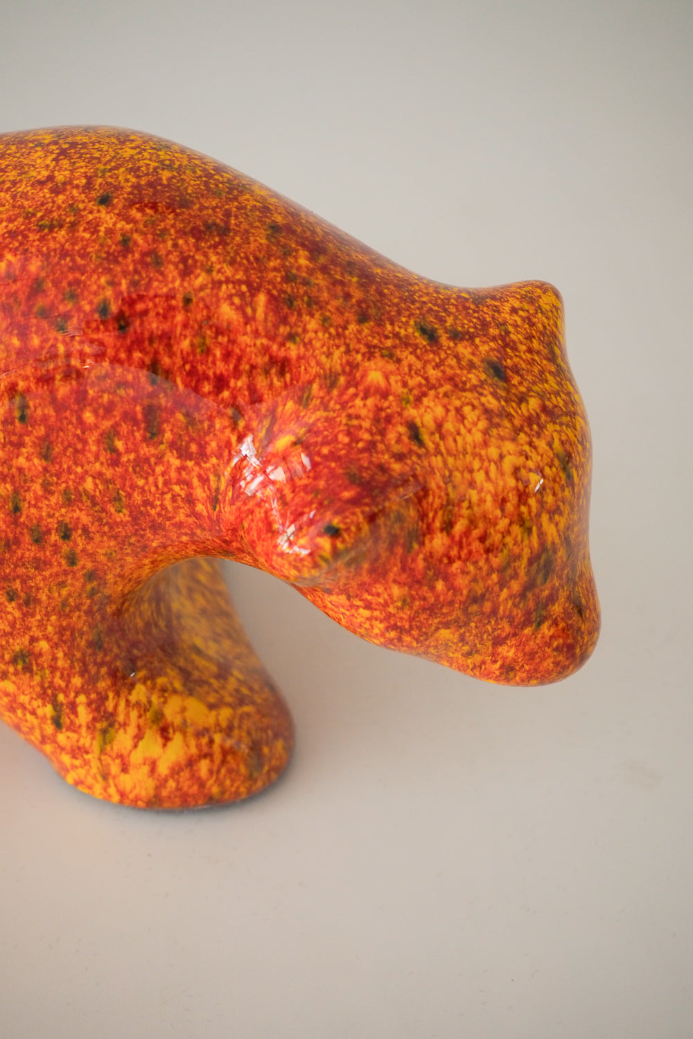 The flowing glaze creates a random speckled pattern on the surface, evoking a unique sense of depth reminiscent of a starry sky or natural stone. The image of a bear crawling powerfully forward on all fours is a simple yet dynamic design.
