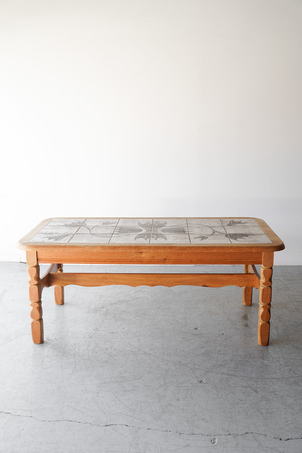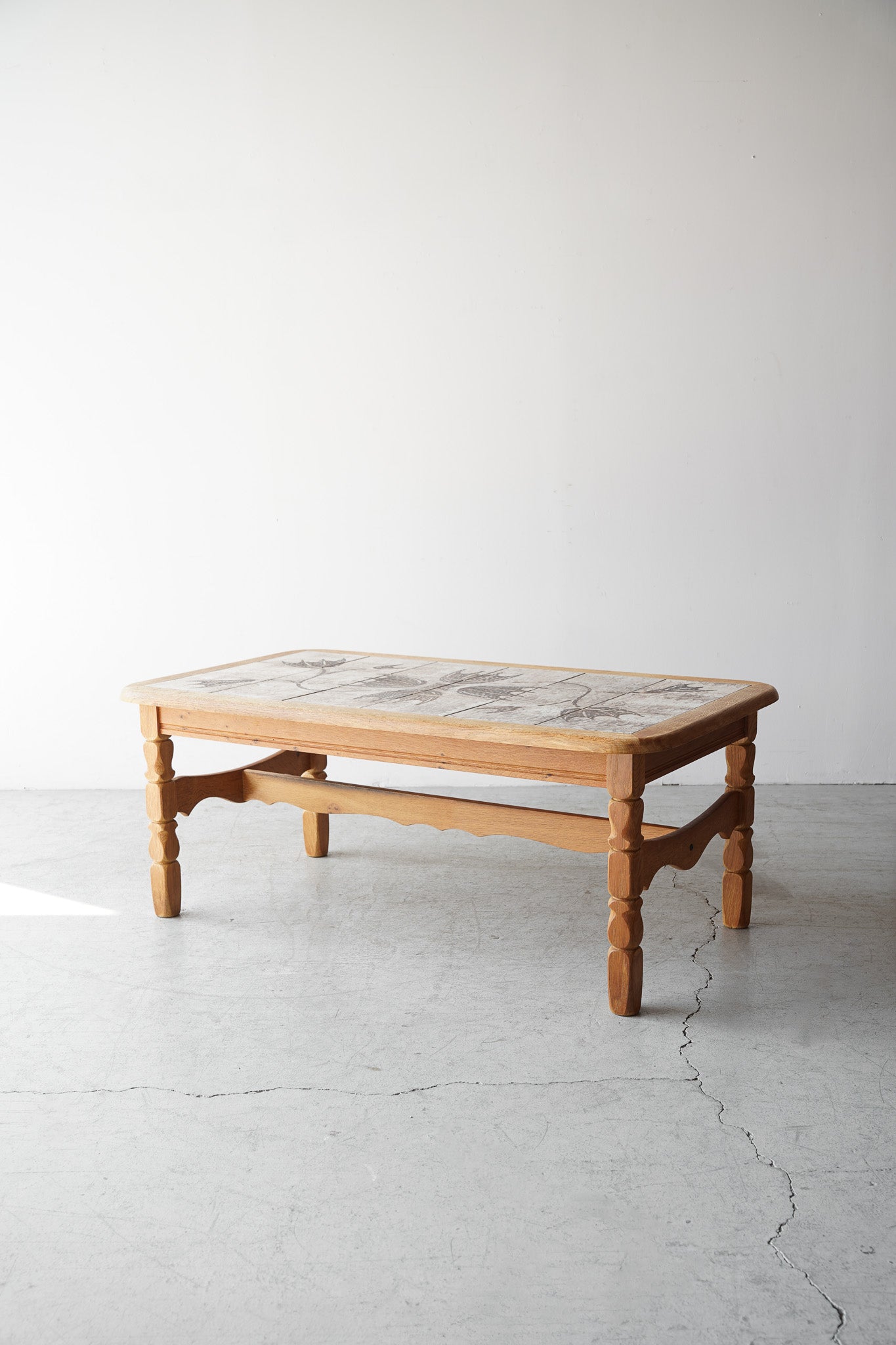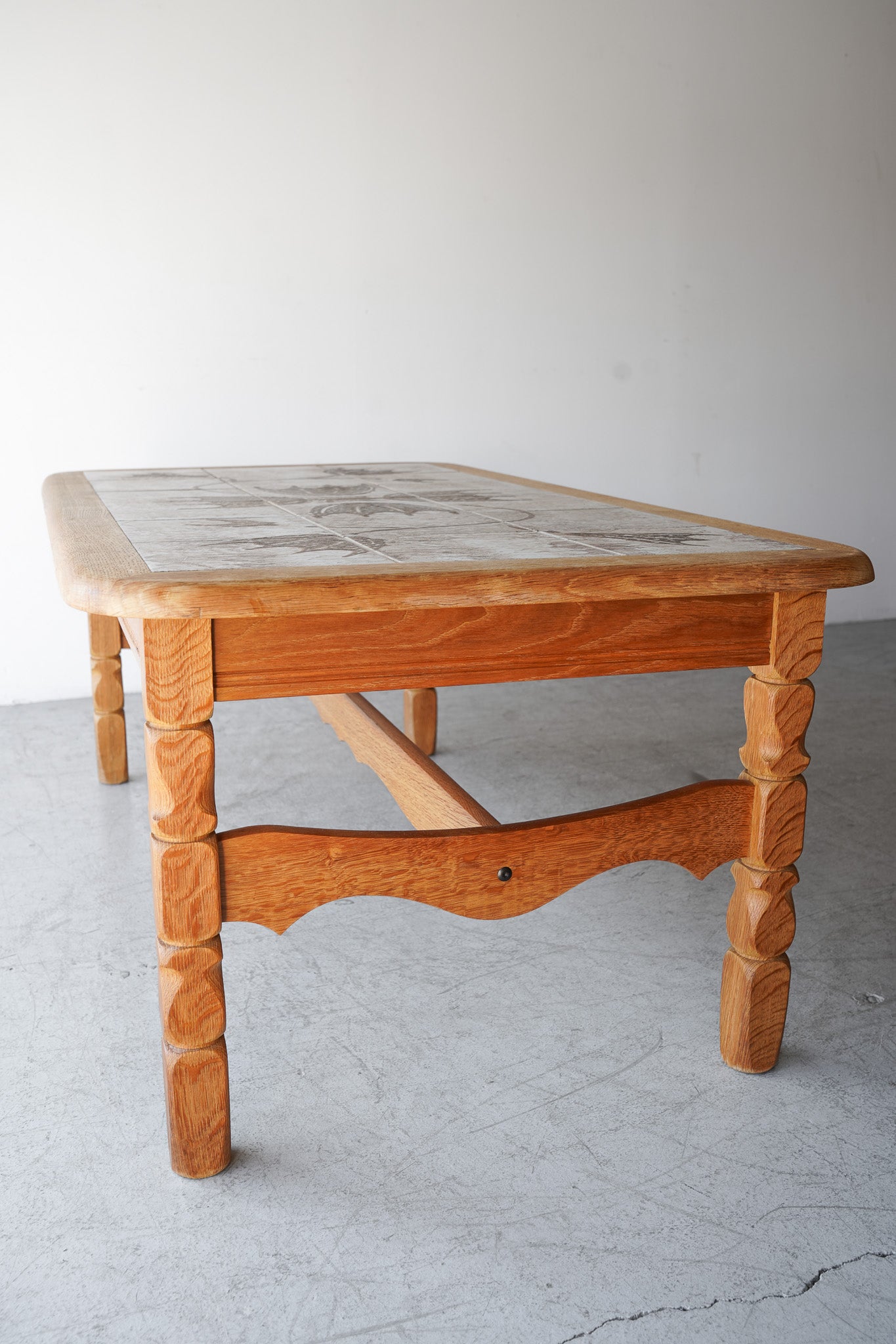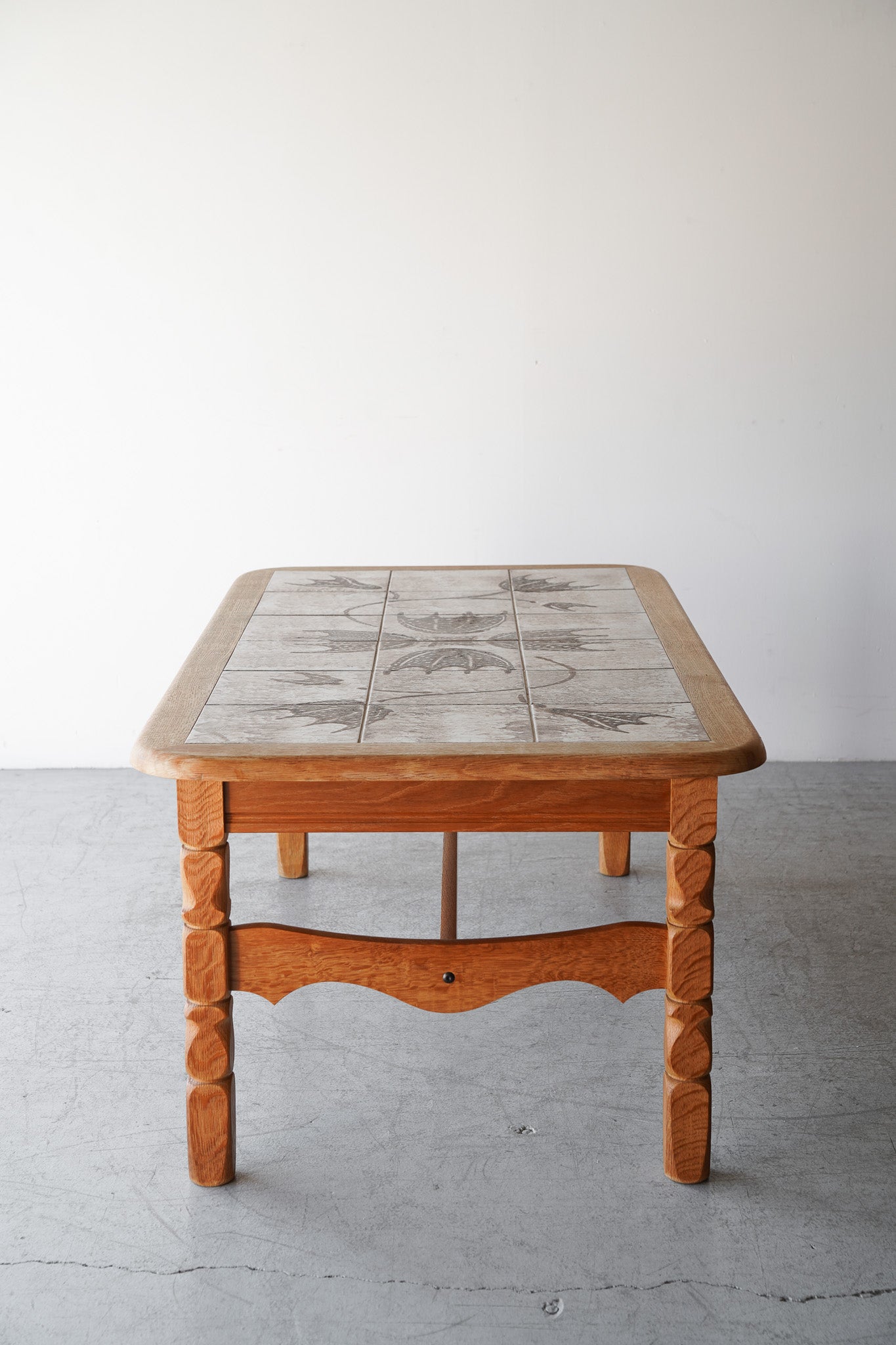 ドイツのPaul Herrmann(パウル・ヘルマン)というアーティストによってデザインされた、温かみのある素朴な色合いのドローイングが施されたタイルと、深みのある木目の色味が調和した個性的なデザインのタイルトップテーブル。