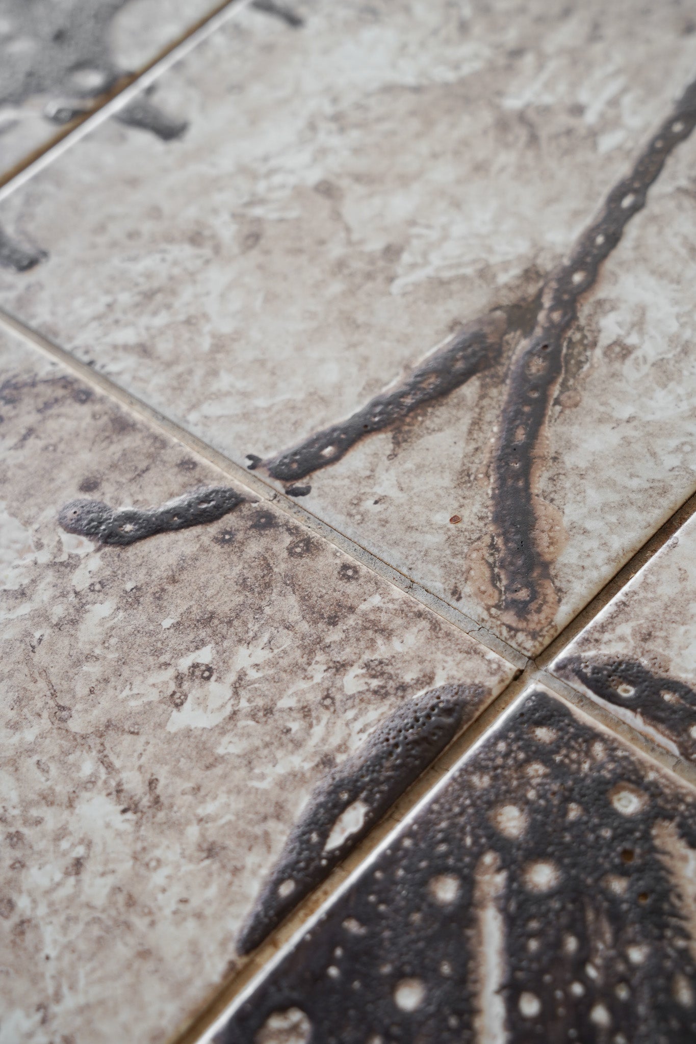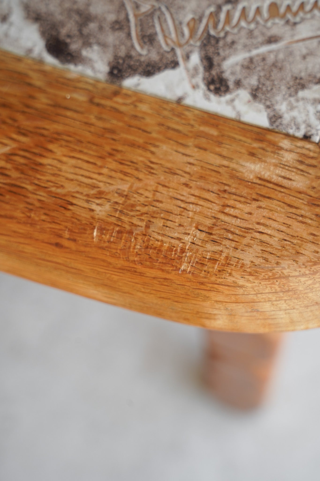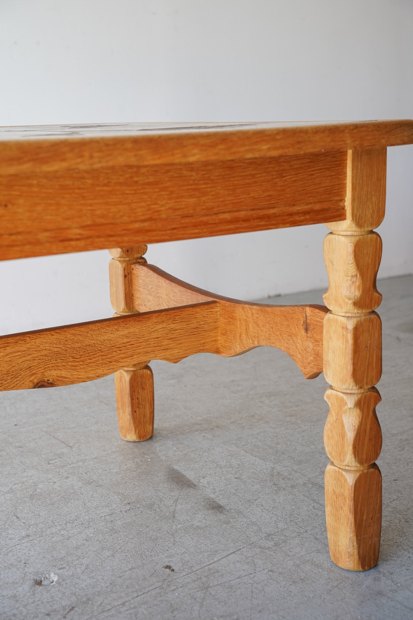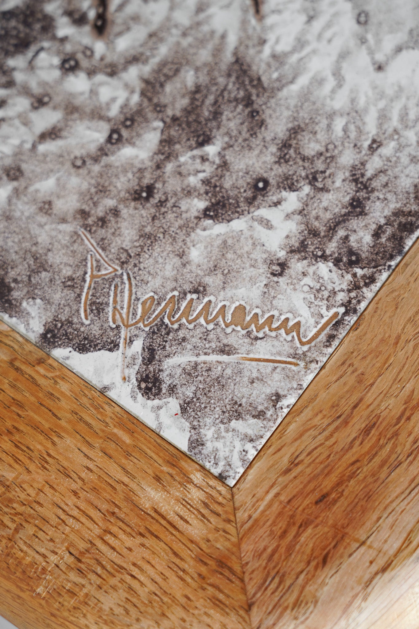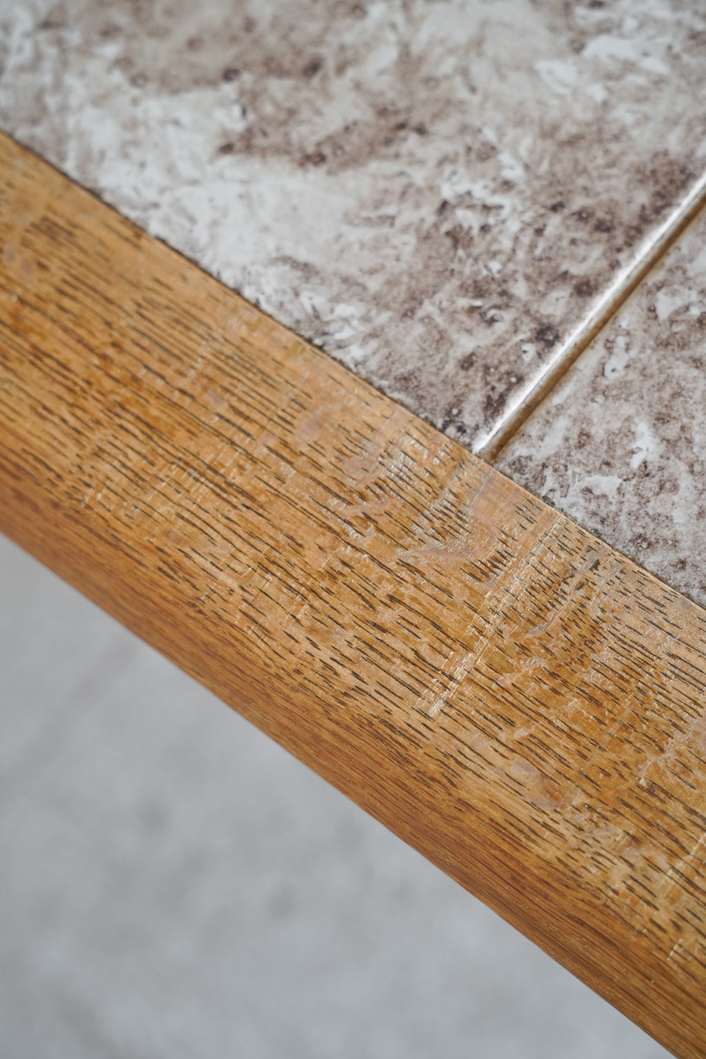 ドイツのPaul Herrmann(パウル・ヘルマン)というアーティストによってデザインされた、温かみのある素朴な色合いのドローイングが施されたタイルと、深みのある木目の色味が調和した個性的なデザインのタイルトップテーブル。