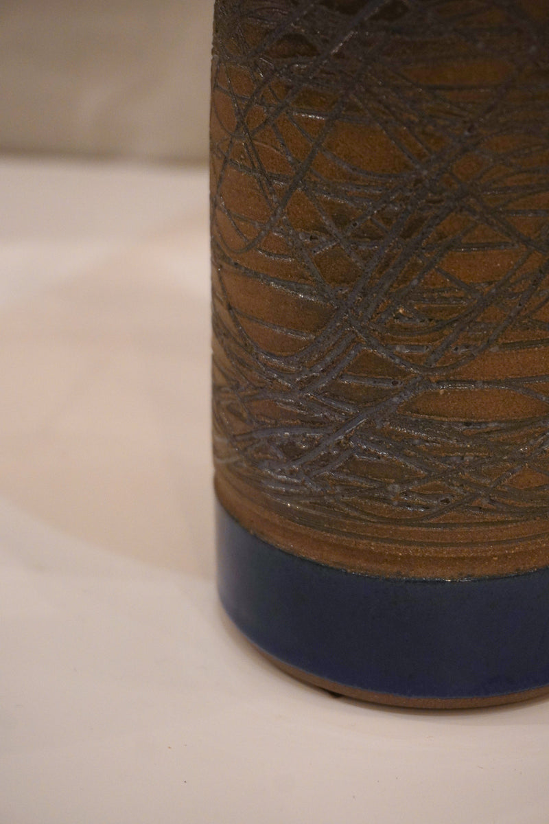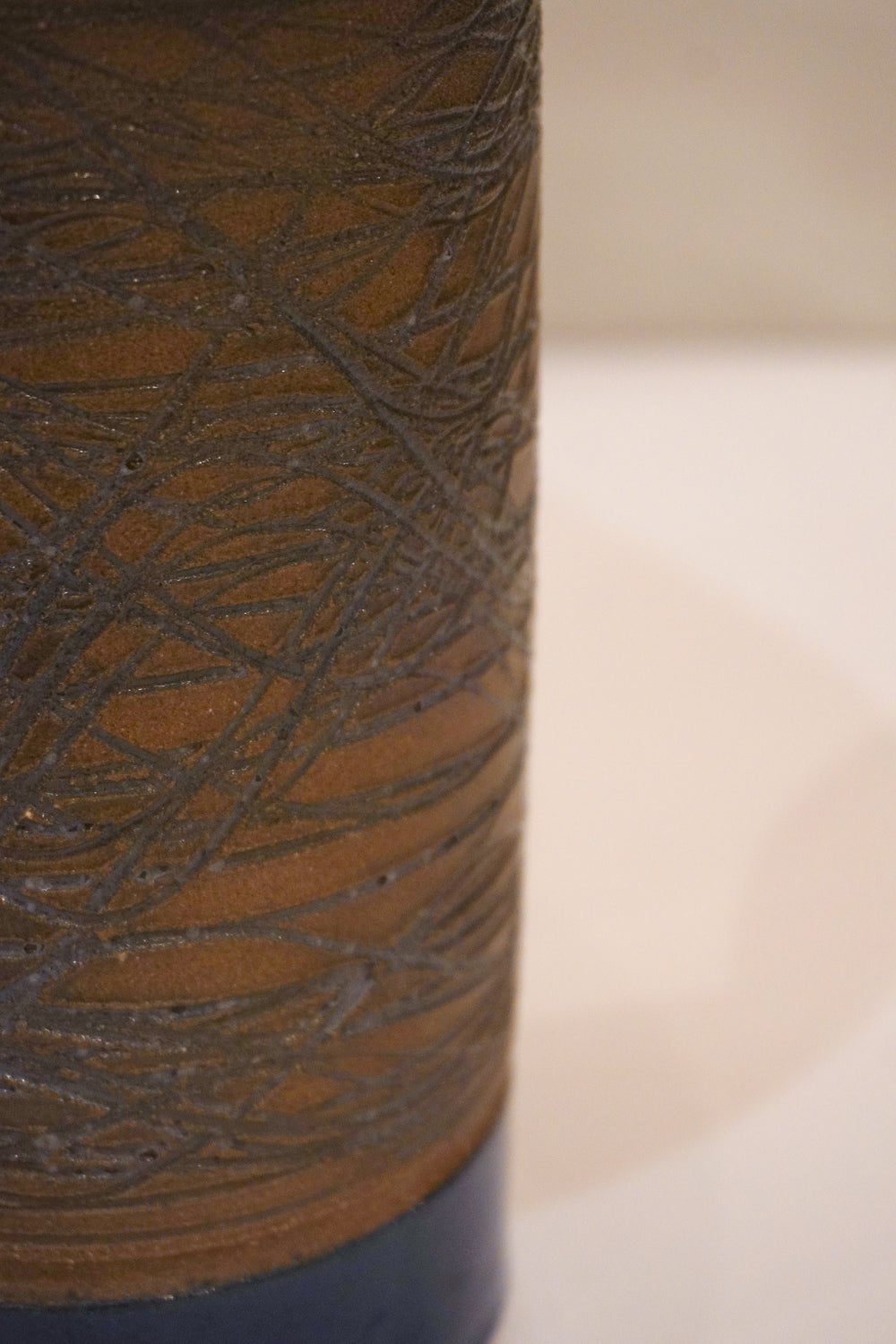 ブルーを基調に、胴の部分にグレー、その上から幾重にも曲線を彫り描き模様を形成しいます。