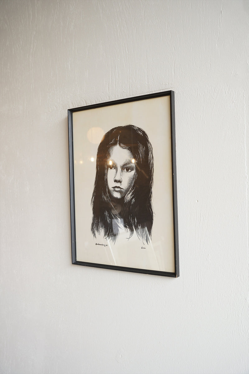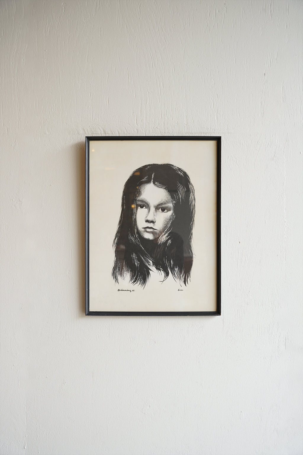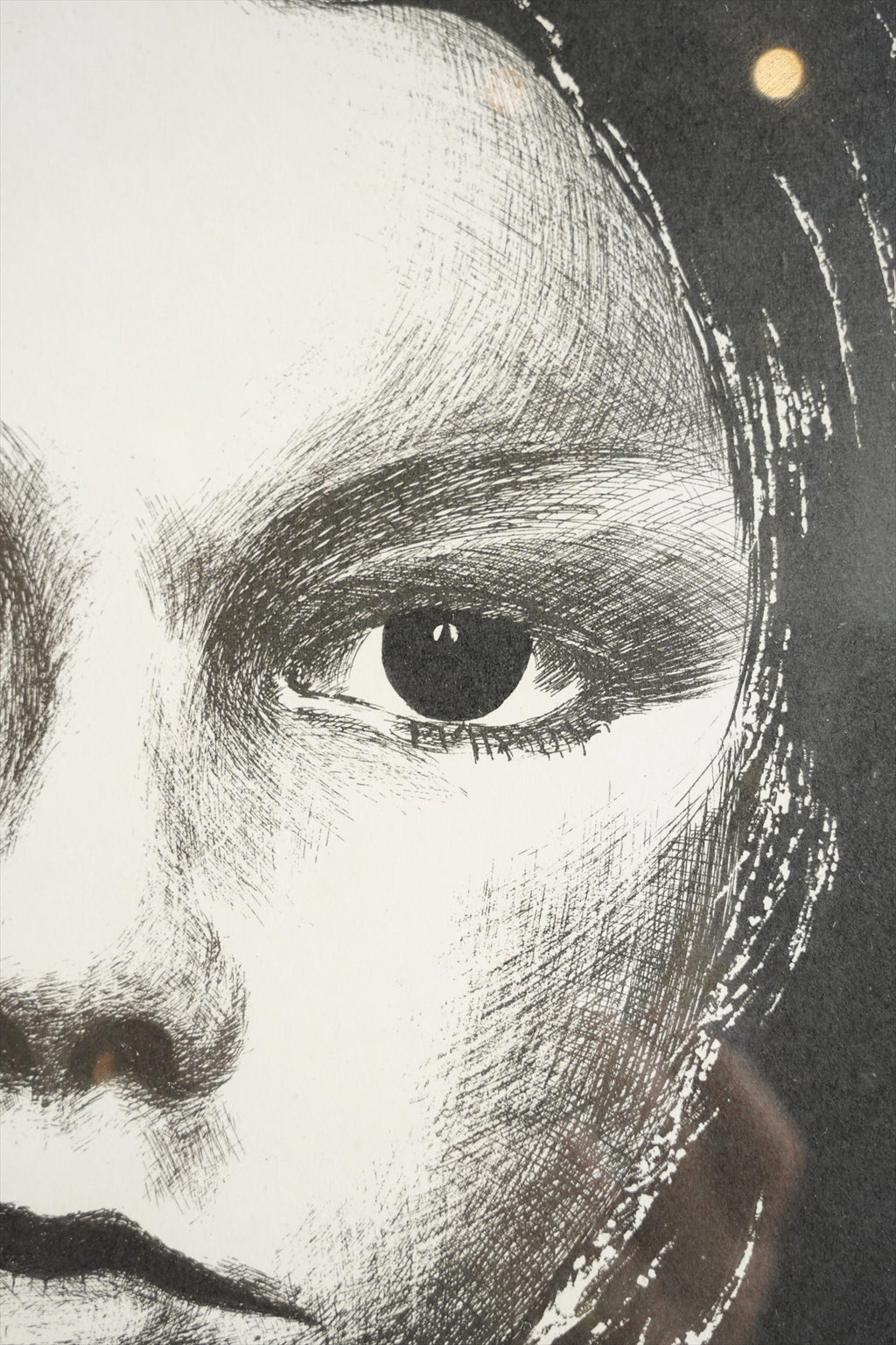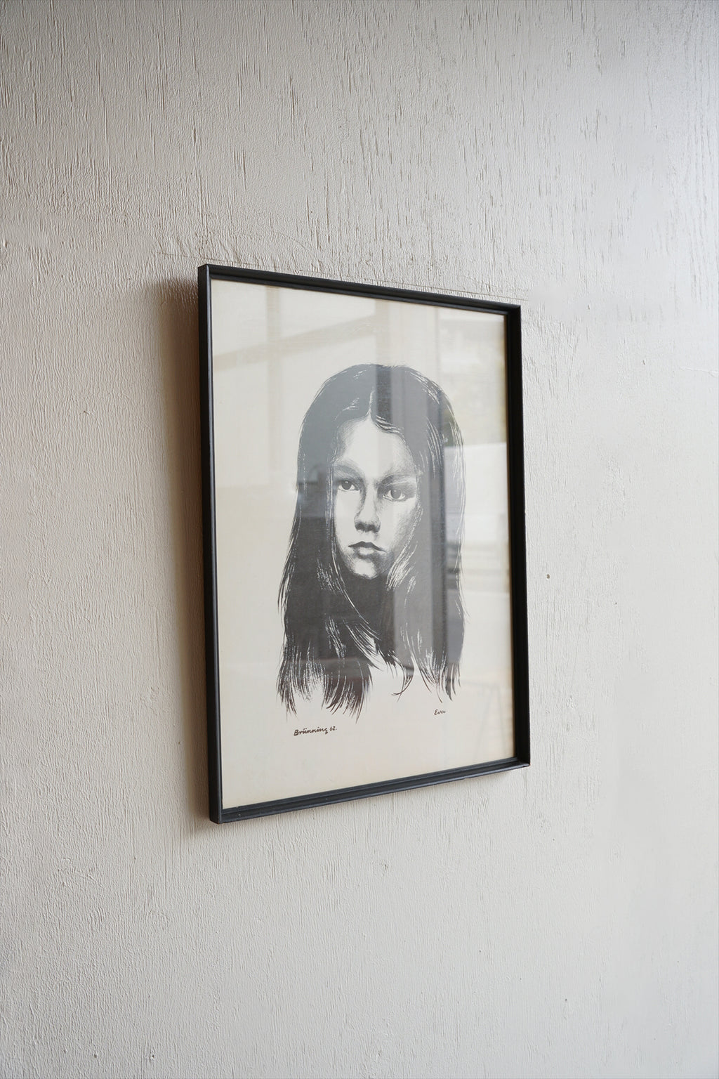 おそらくリトグラフ(石版画)またはペン画によって制作されたもので、非常に細密な描写が際立っています。モチーフとして描かれているのは、長い髪をした少女の正面からの肖像であり、写実的でありながら感情を抑えた静かな表情が観る者に強い印象を与えます。繊細で緻密な線描によって表現されたその表情や髪の流れには、内省的で静謐な雰囲気が色濃く反映されており、彼の特徴的な芸術性が感じられる一作です。