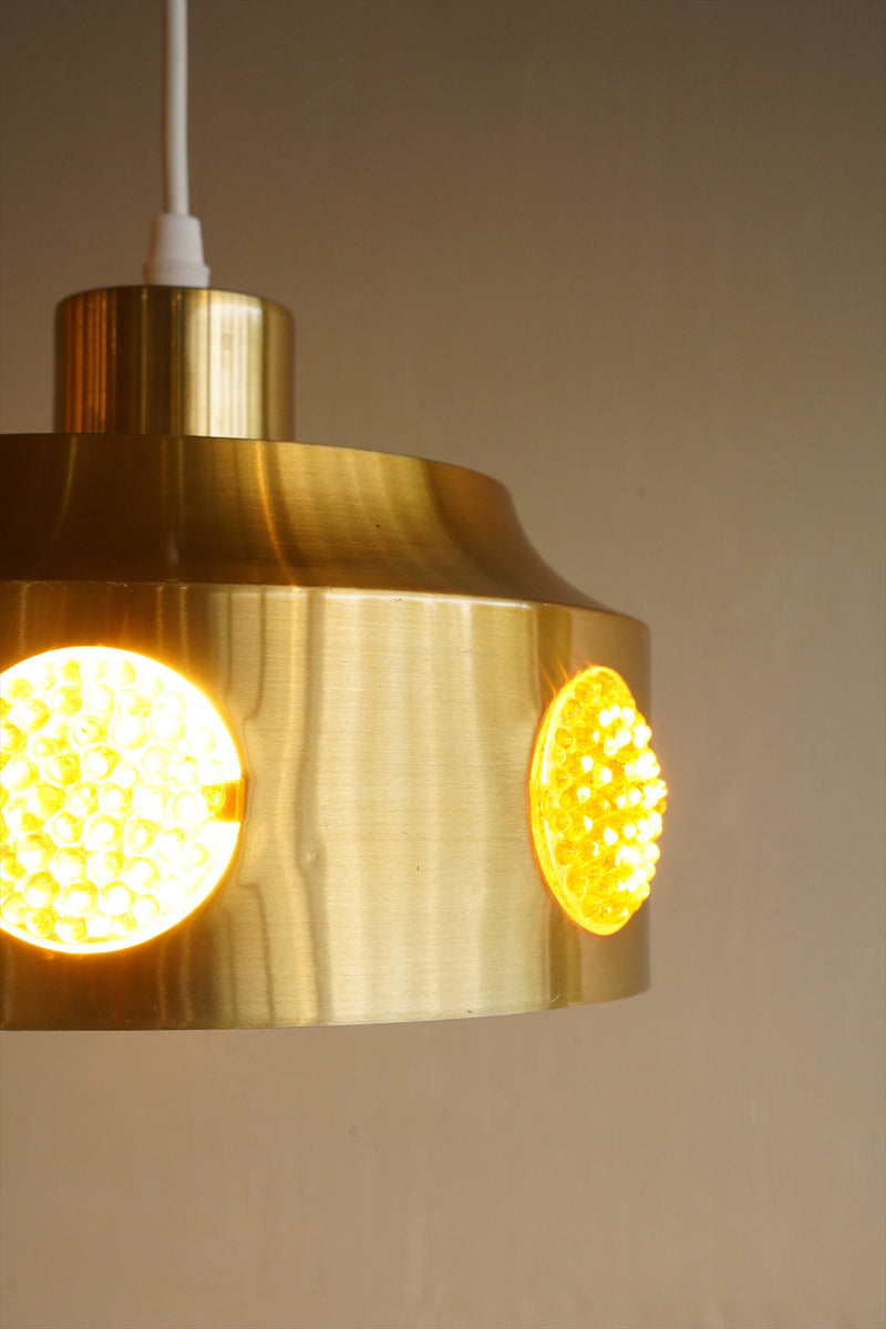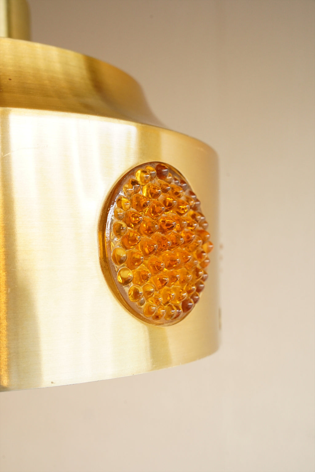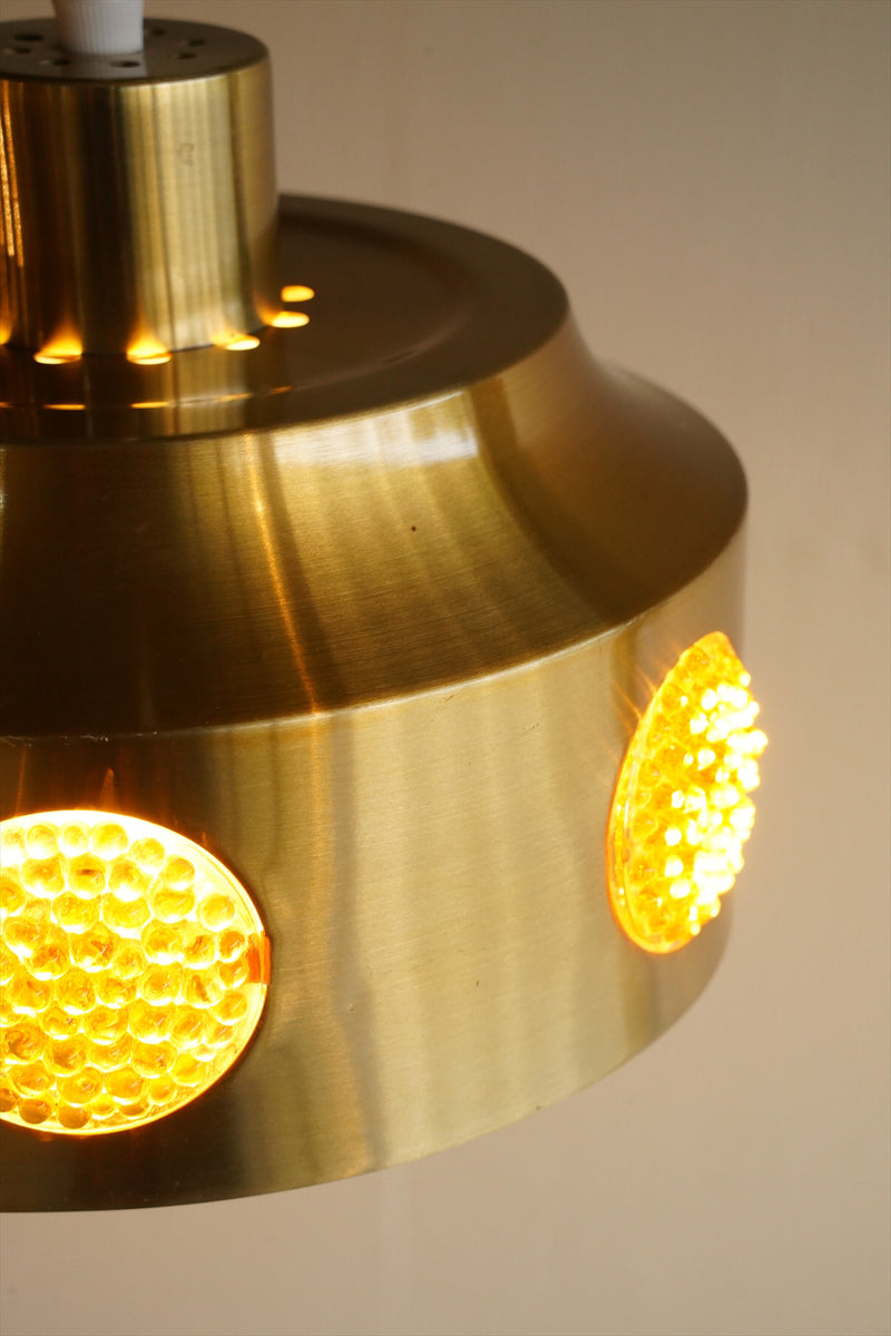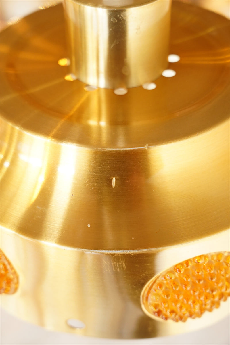 シャンパンゴールドカラーのシェードに飴色の細かなカッティングが施されたアクリルが周囲に付いたペンダントランプのご紹介です。