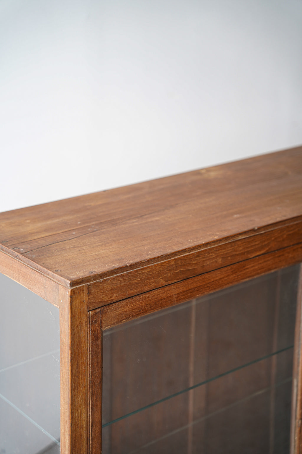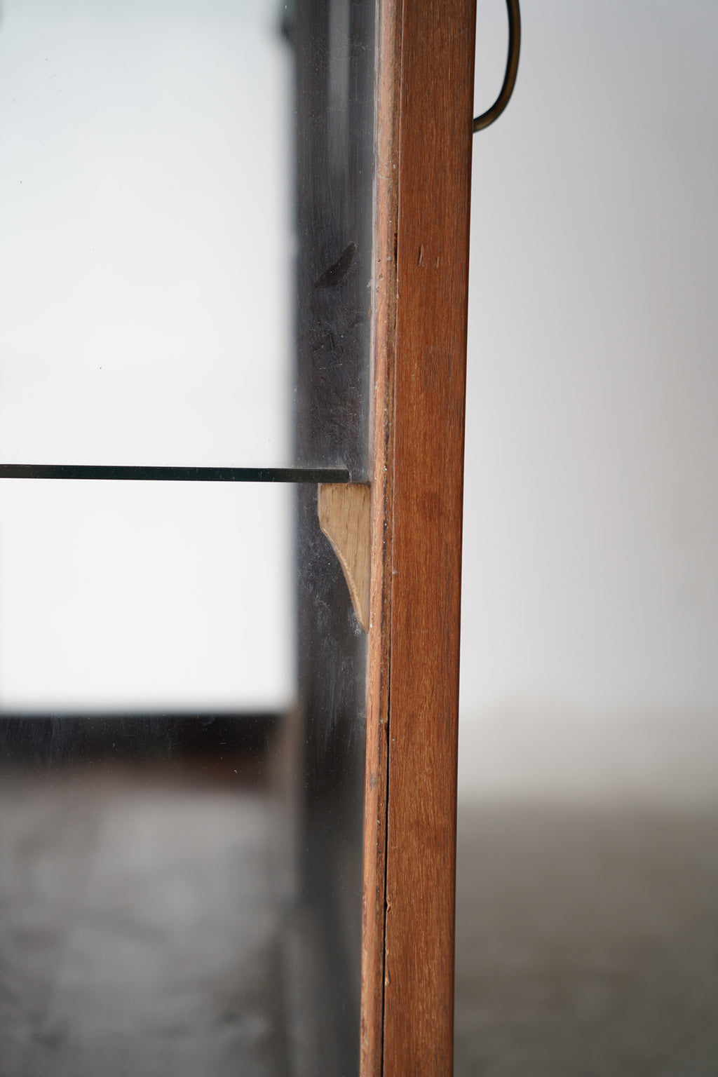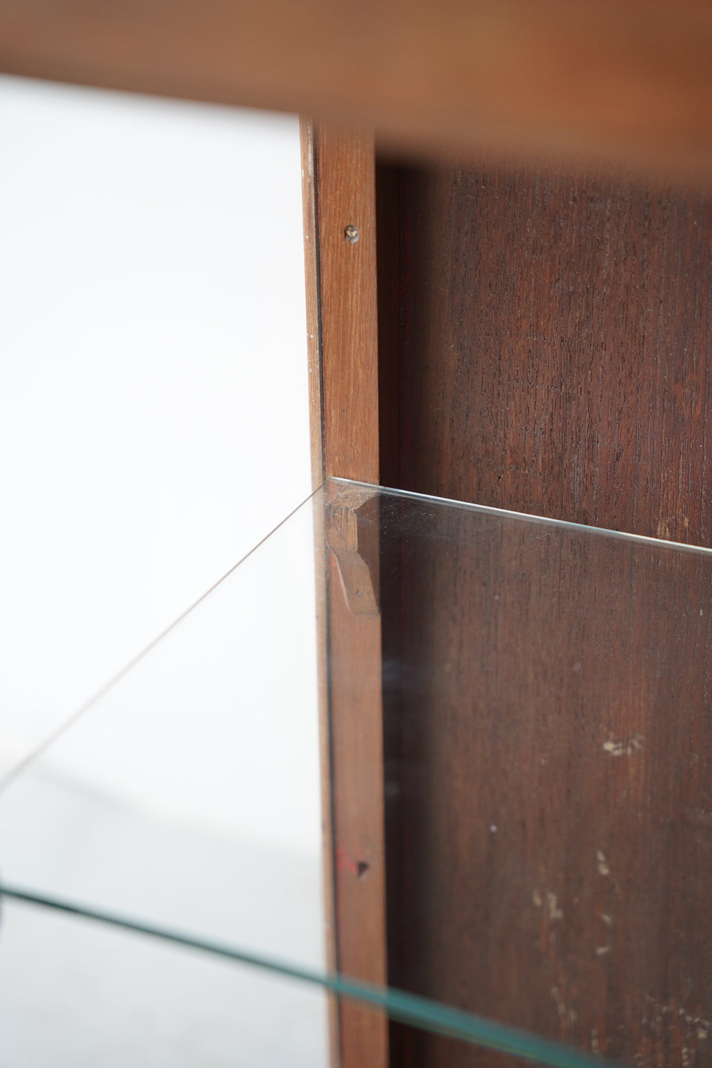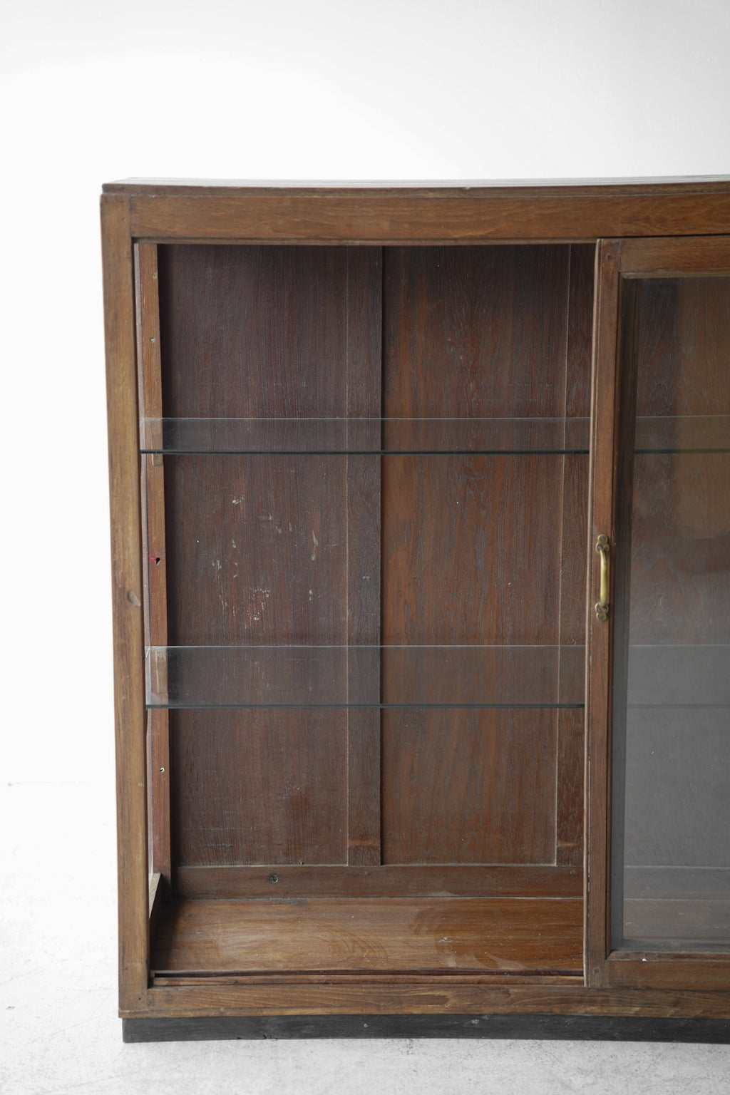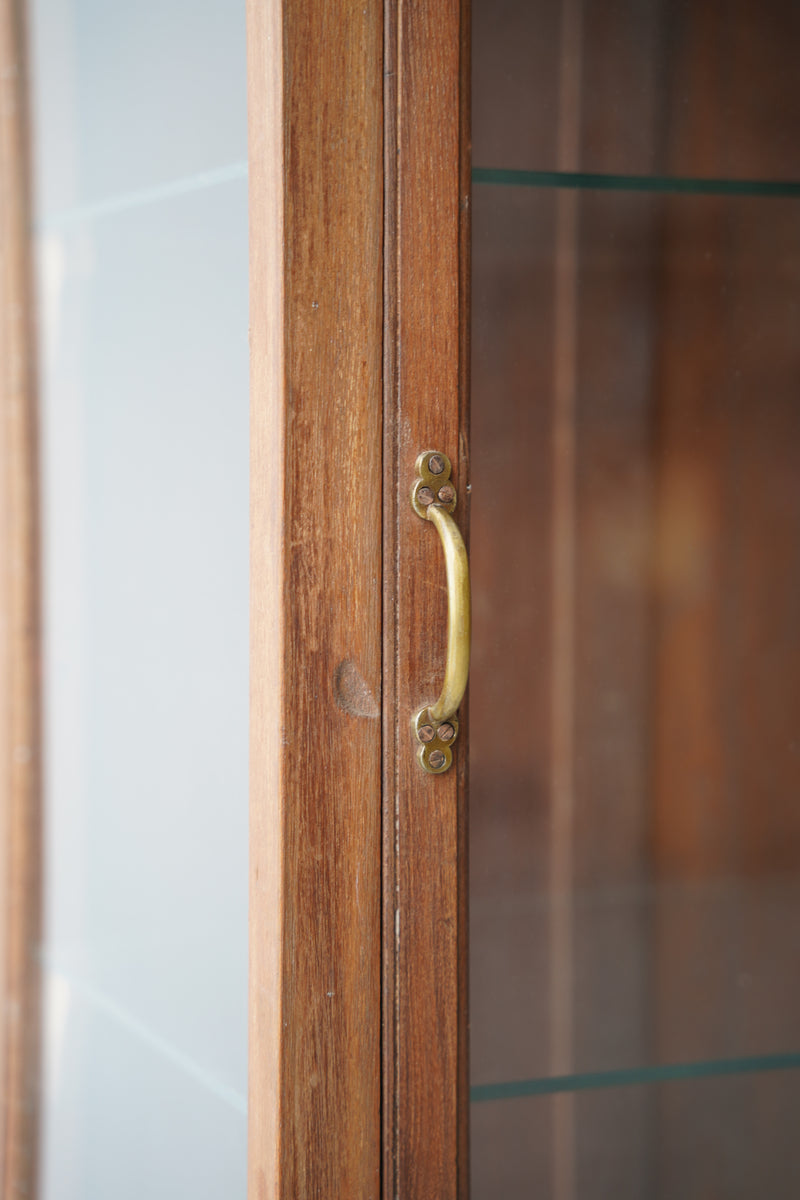 ワンポイントの真鍮製のゴールドの取手をスライドさせると、中には幅広なガラス天板が2枚ついており扉内を仕切りつつも圧迫感を感じさせず空間広くみせてくれます。
