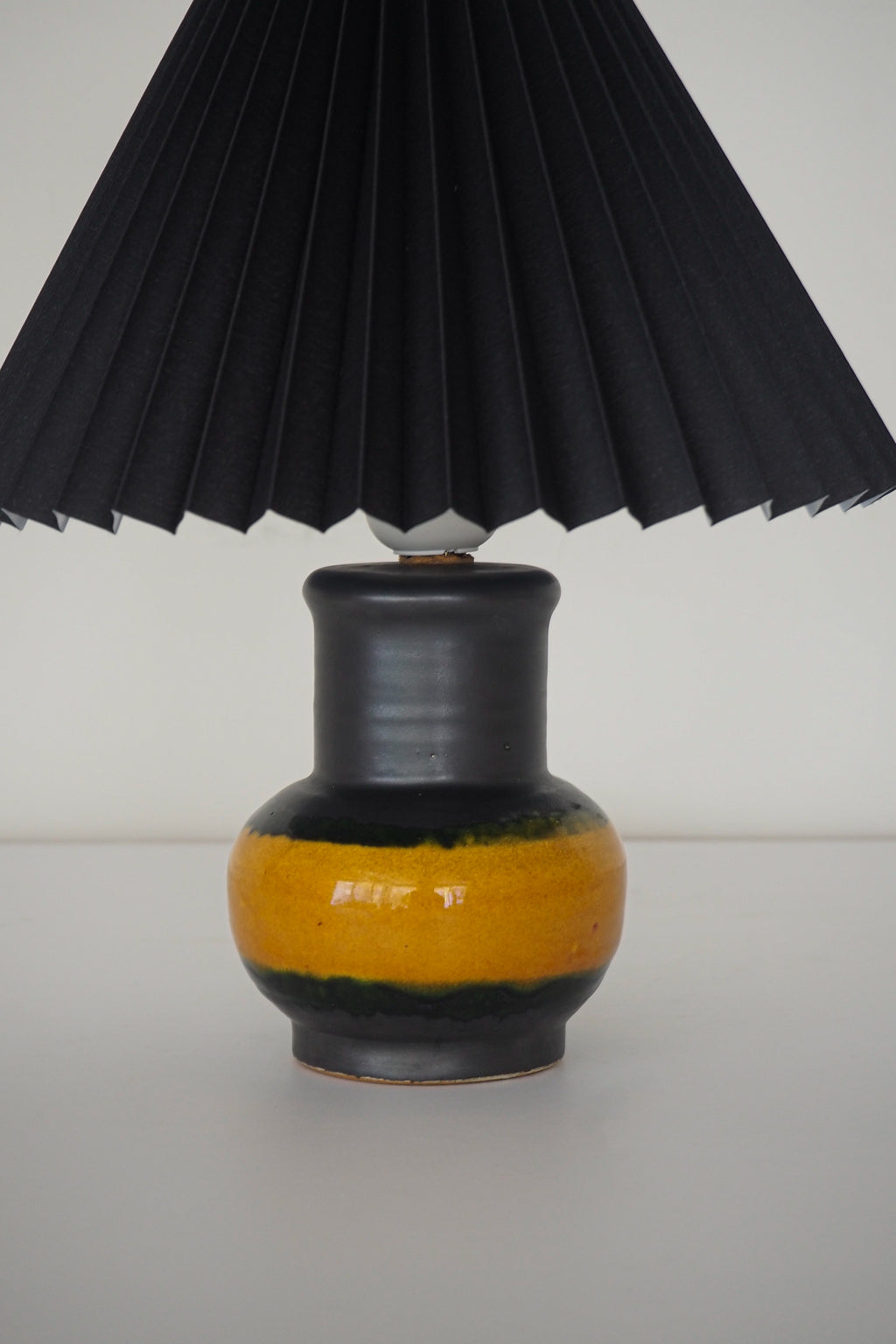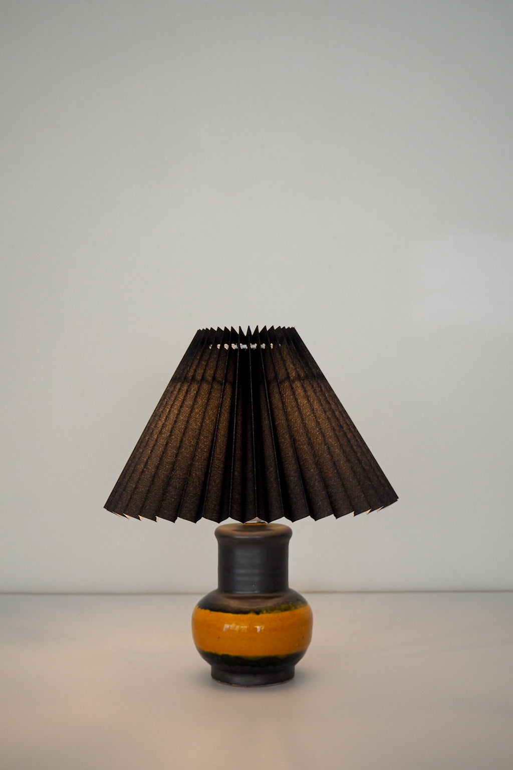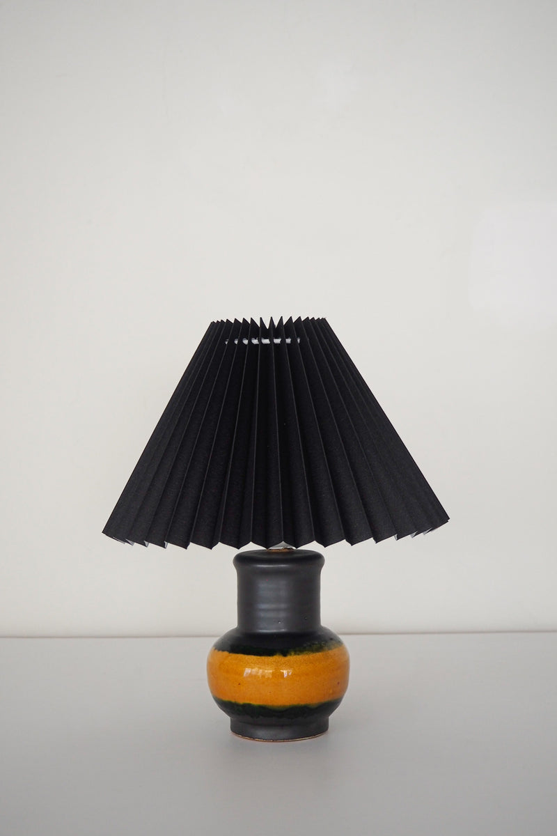 ブラックのプリーツシェードとイエローの組み合わせが目を引くテーブルランプ。