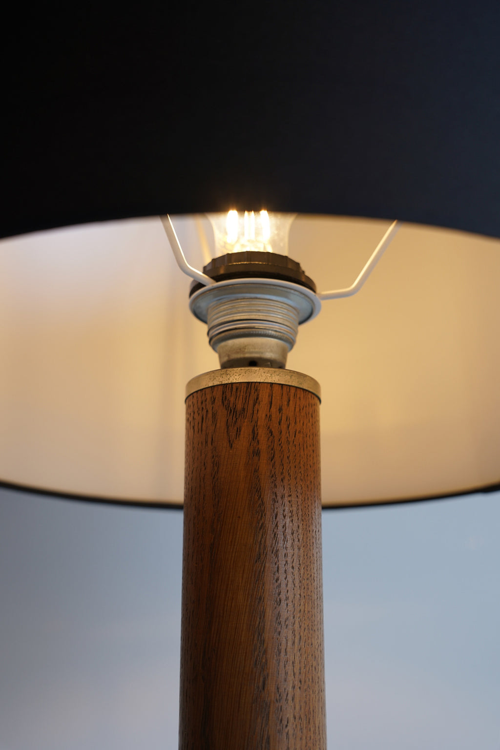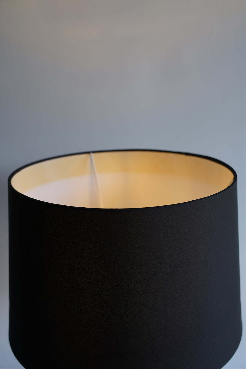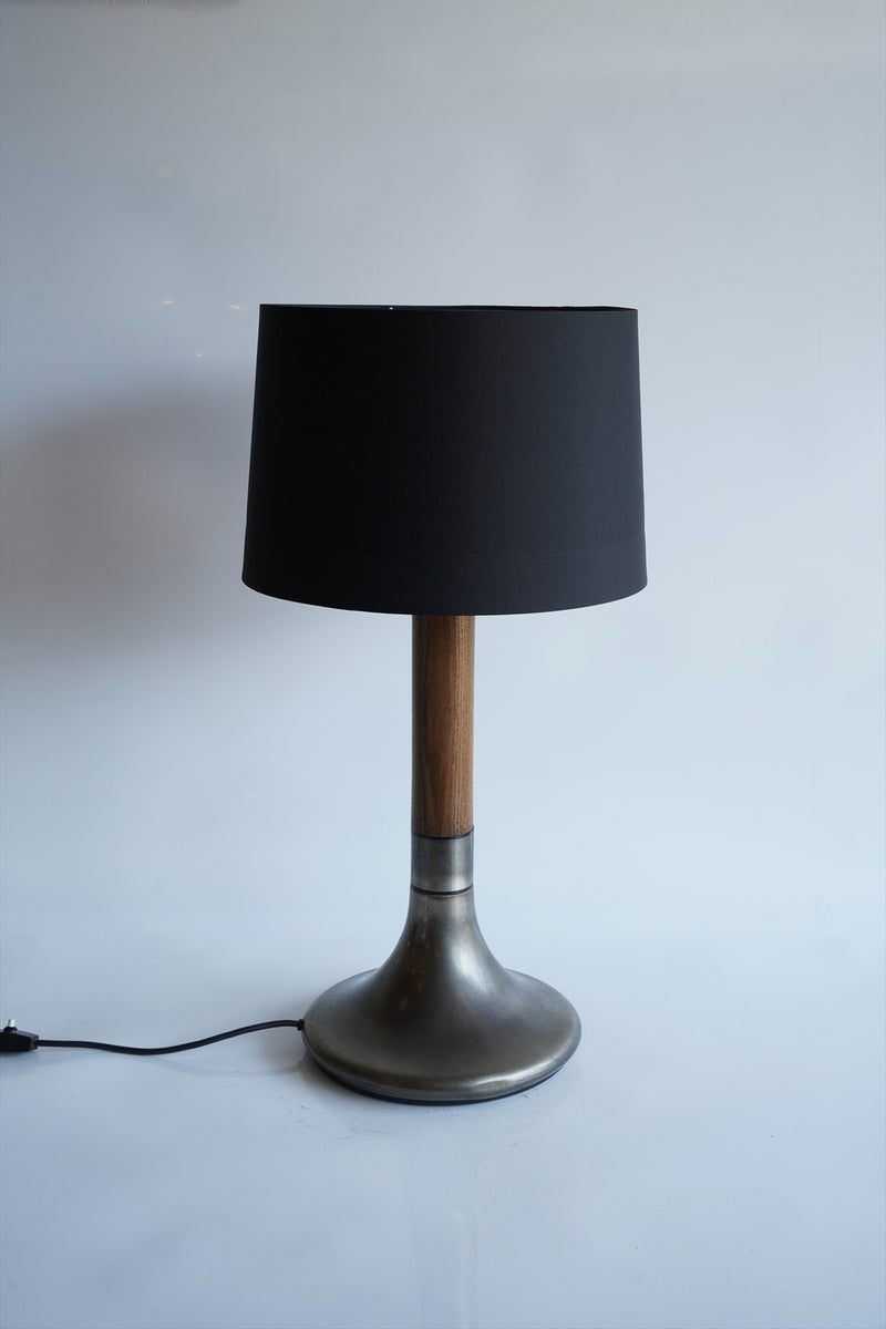 温もりあるウッドの支柱に、重厚感のあるメタルベース、そしてシックなブラックのファブリックシェードを組み合わせた、洗練された佇まいが特徴的な一点。