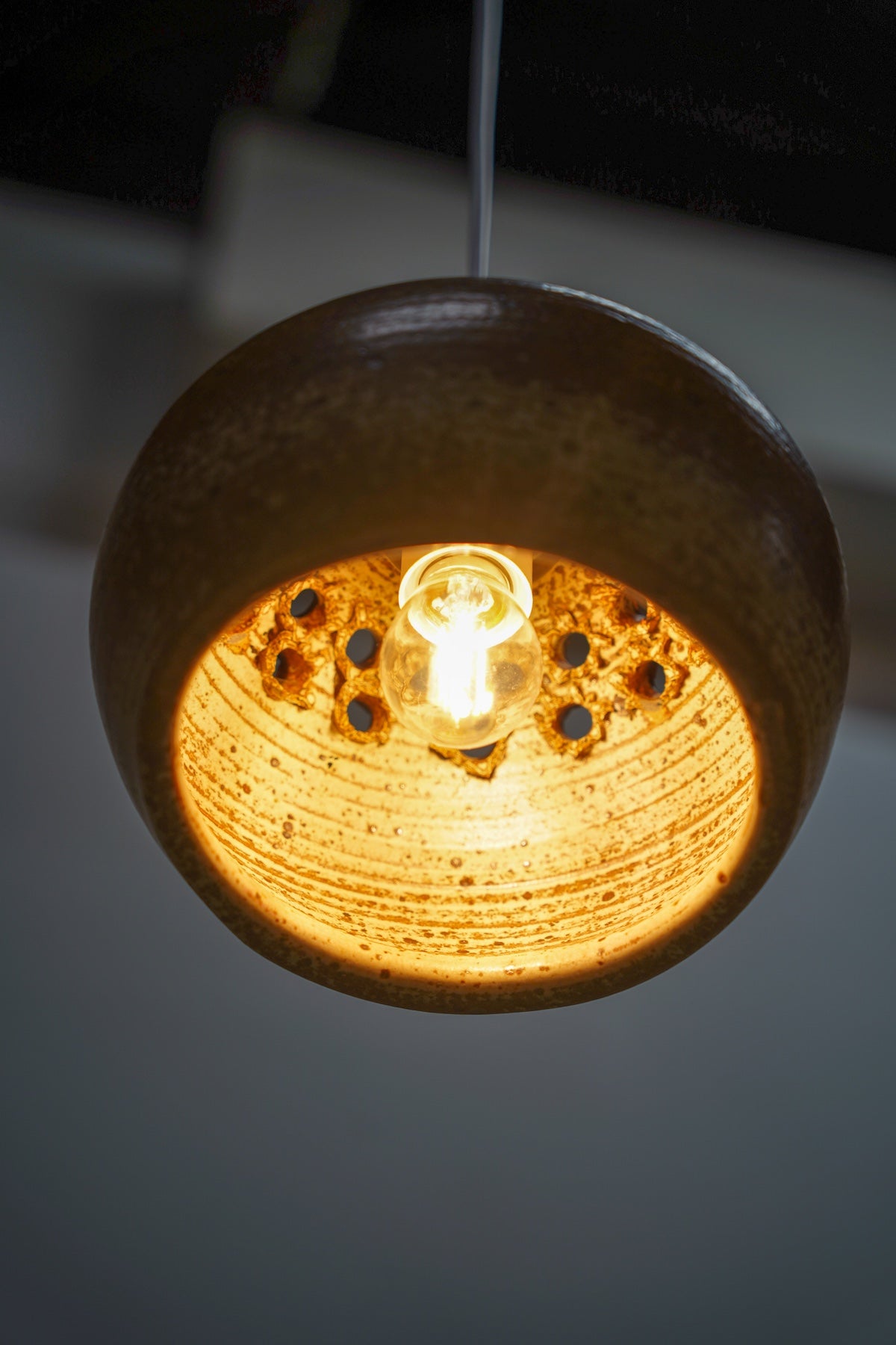 シェード上部に施された複数の丸い開口部からは、柔らかな光がこぼれ落ち、壁や周囲に美しい光と影のパターンを映し出します。