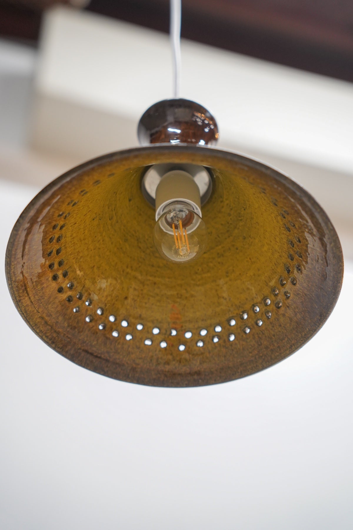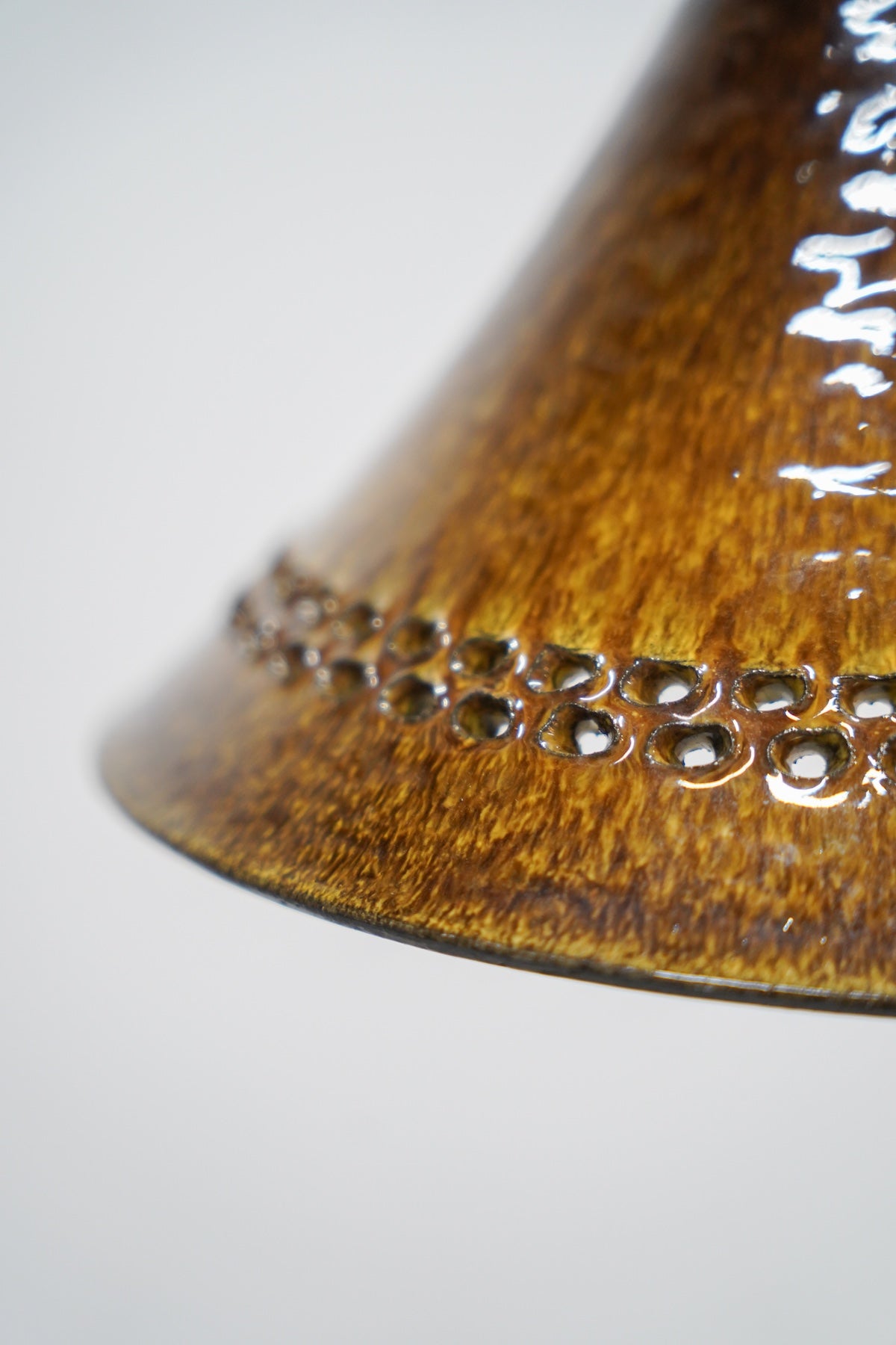 シェードの最も広い部分には、連続した小さな円形の穴が帯状に配されており、点灯するとこの穴から温かな光が環状にこぼれ落ち、天井や壁に印象的な光のパターンを描き出します。