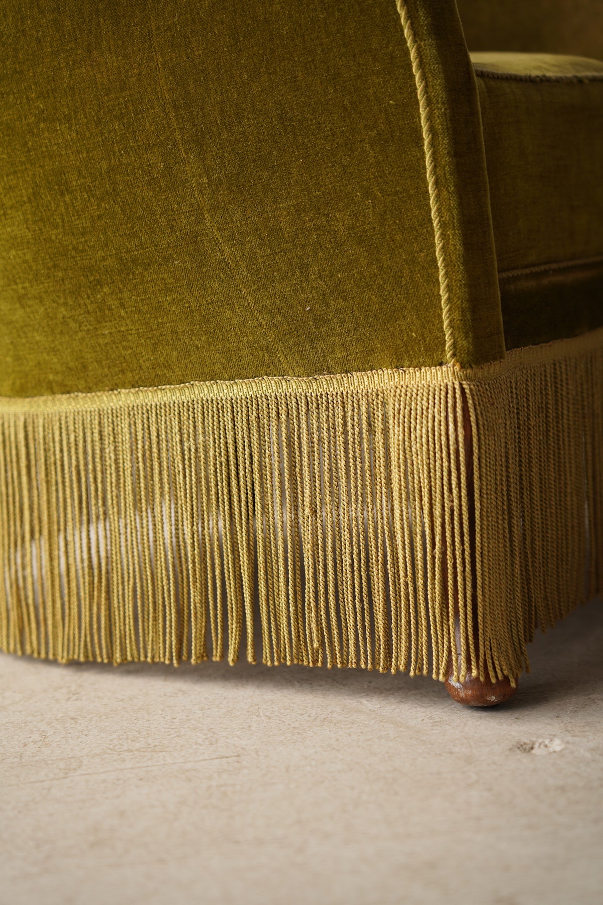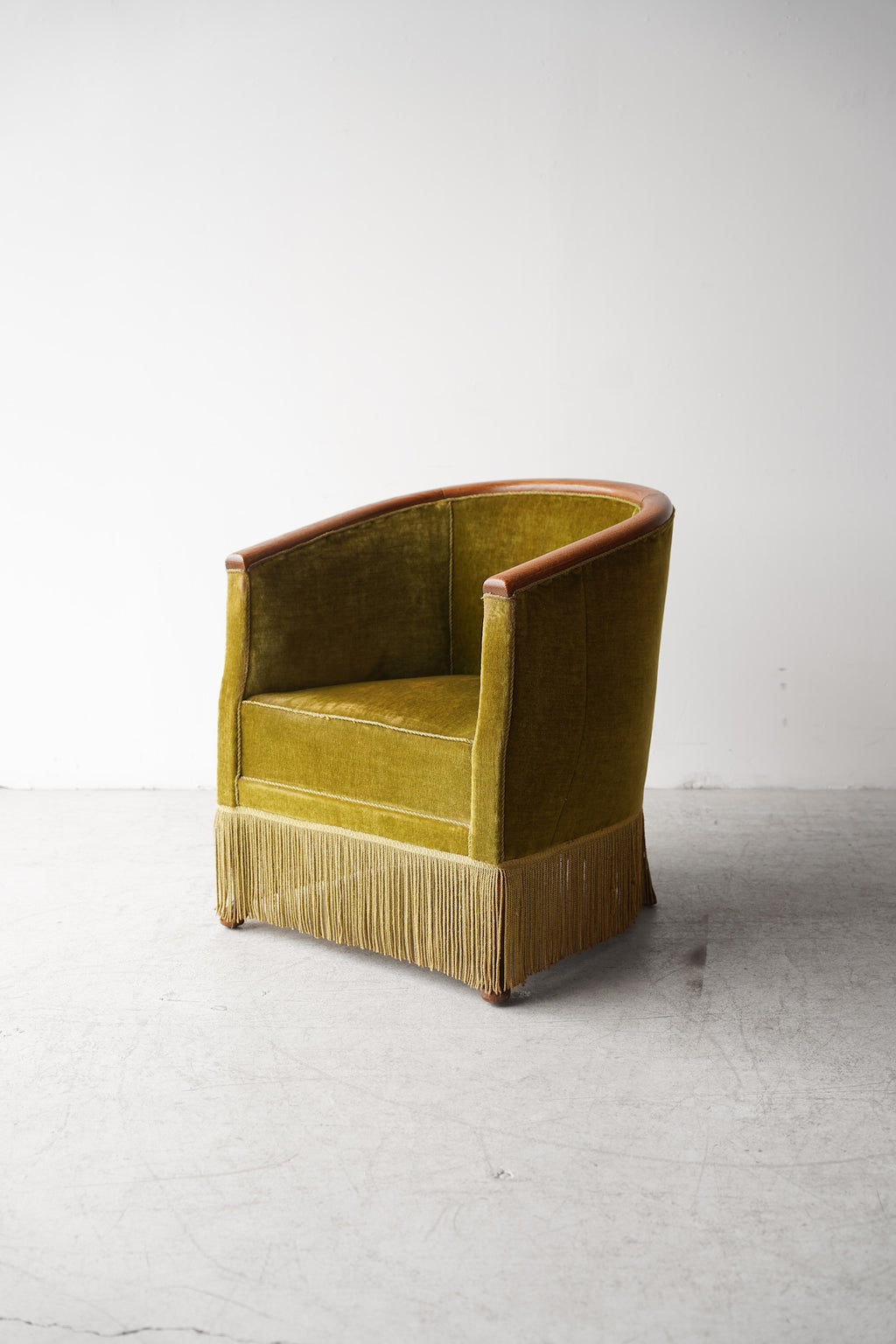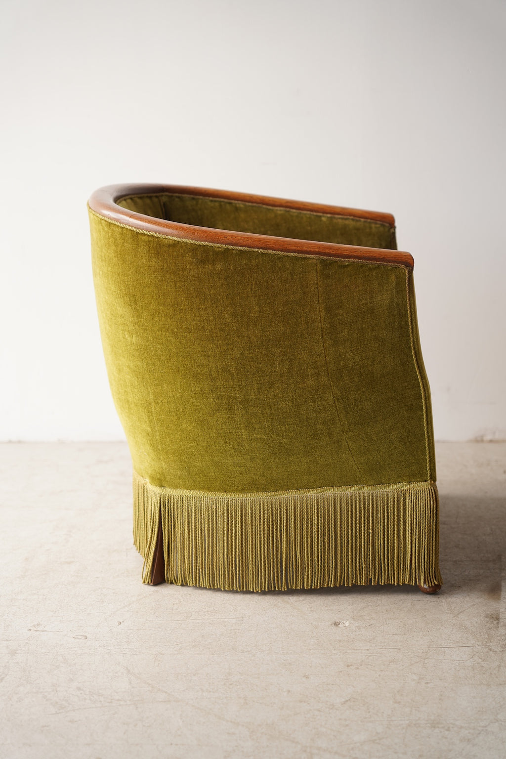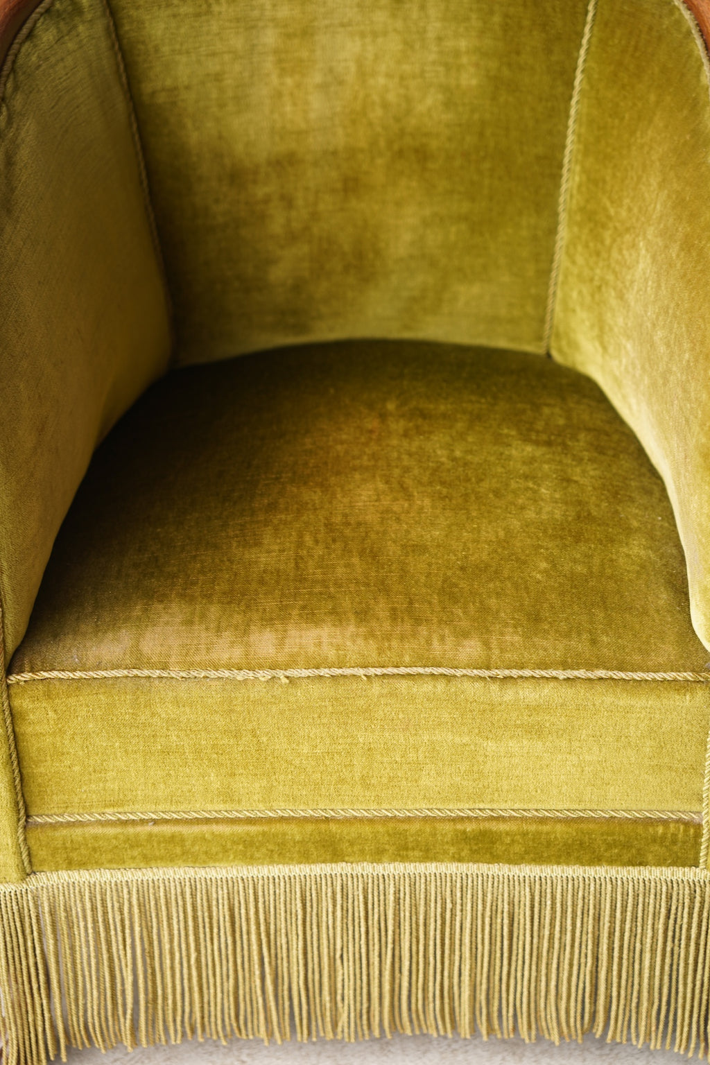 このフリンジが脚部を隠し、全体をよりドラマチックでグラマラスな印象に仕上げています。リビングルームの主役となるラウンジチェアとして、またドレッシングルームや寝室のアクセントチェアとしても最適です。アール・デコ様式の華やかさと、ヴィンテージならではの温かみが融合した特別な存在感を放ち、空間を上質に演出してくれるでしょう。
