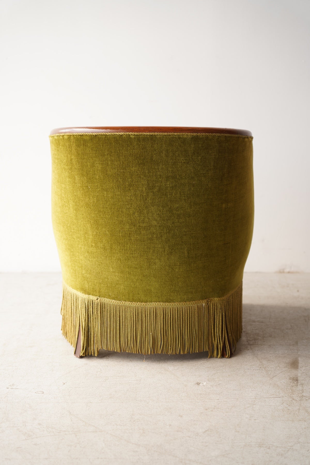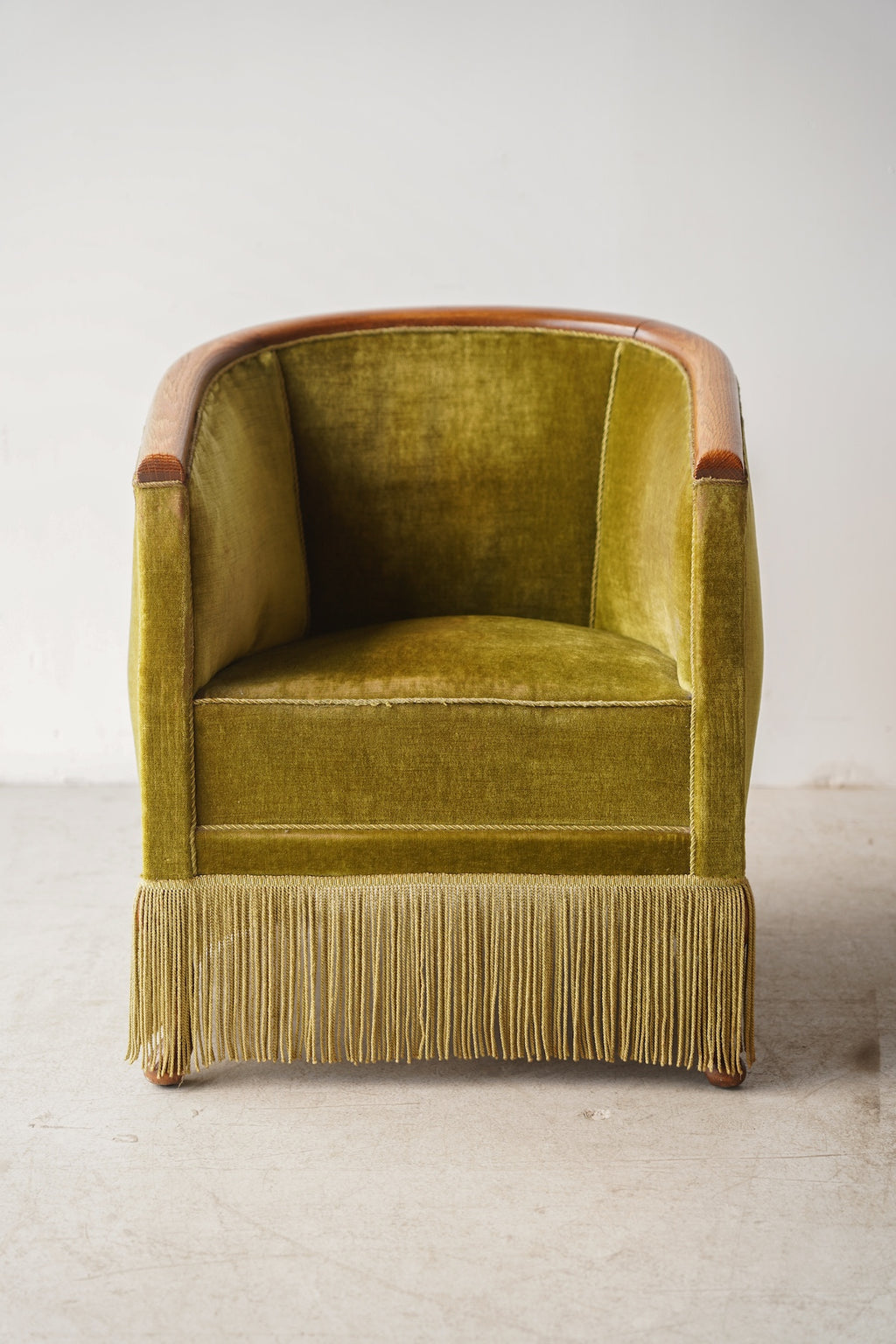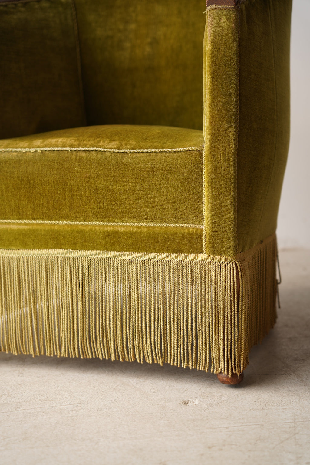 このフリンジが脚部を隠し、全体をよりドラマチックでグラマラスな印象に仕上げています。リビングルームの主役となるラウンジチェアとして、またドレッシングルームや寝室のアクセントチェアとしても最適です。アール・デコ様式の華やかさと、ヴィンテージならではの温かみが融合した特別な存在感を放ち、空間を上質に演出してくれるでしょう。
