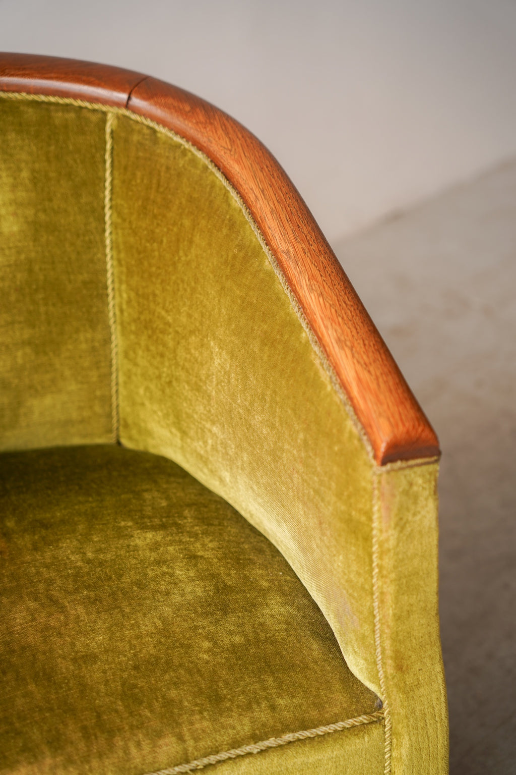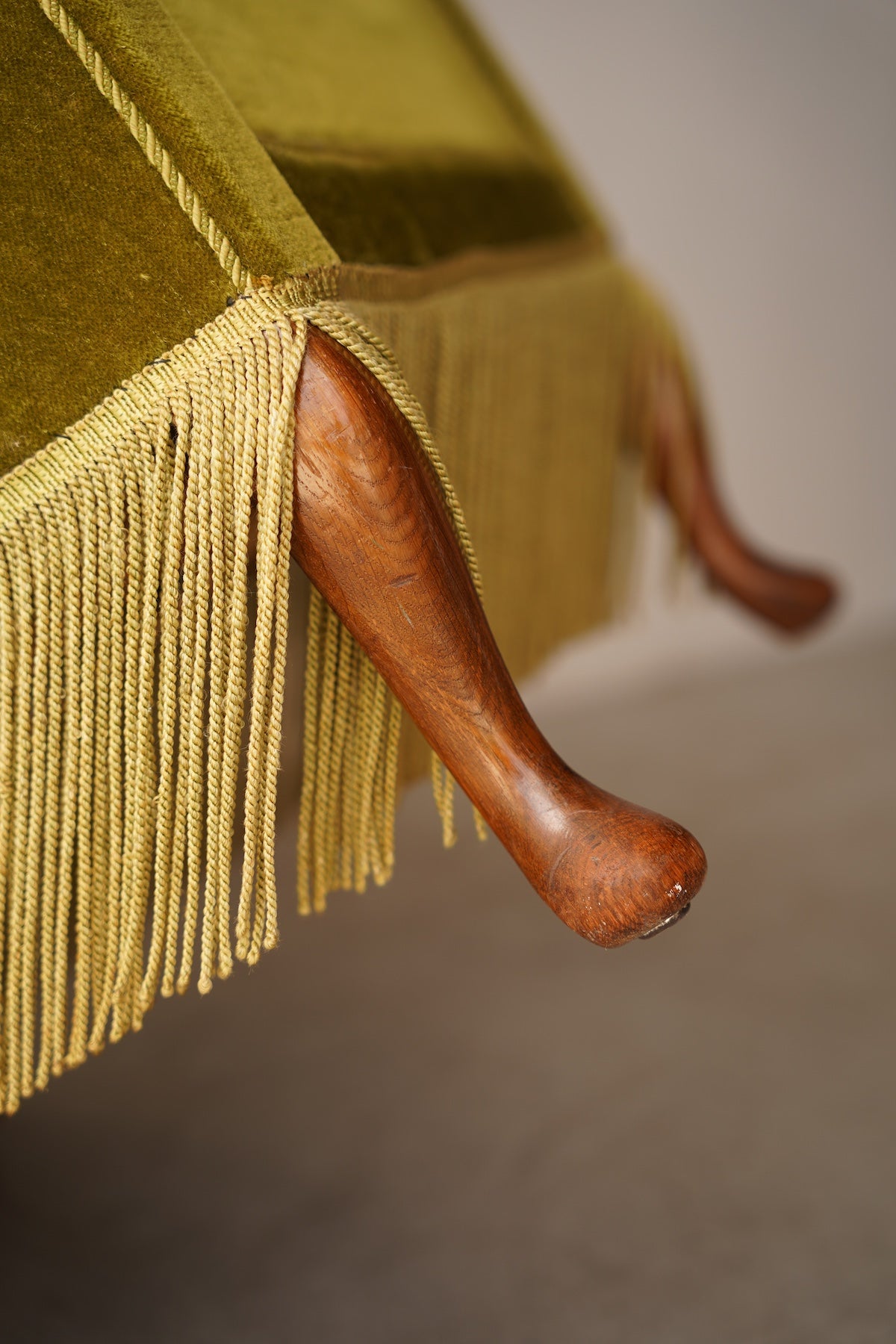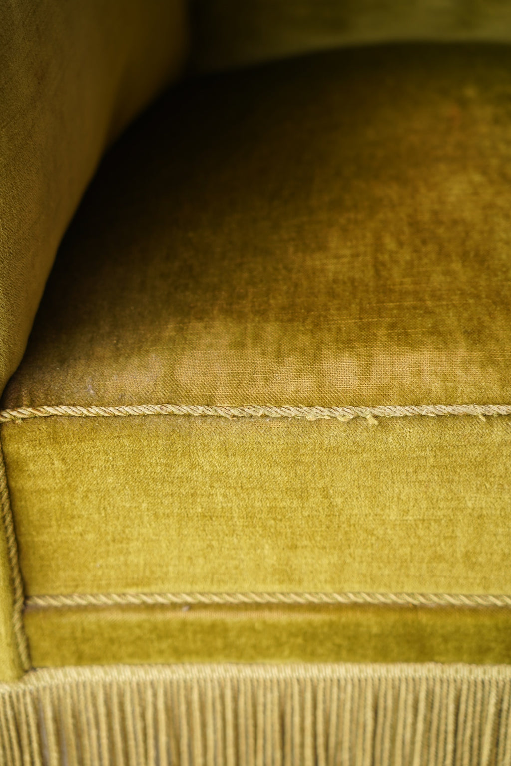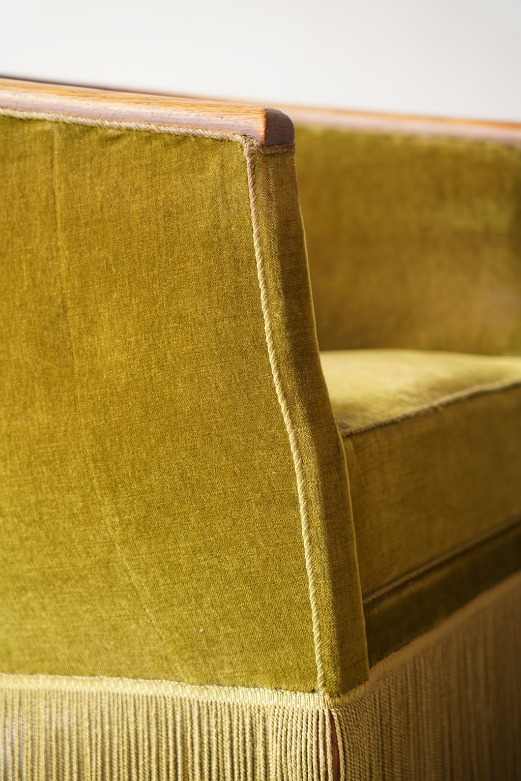 このフリンジが脚部を隠し、全体をよりドラマチックでグラマラスな印象に仕上げています。リビングルームの主役となるラウンジチェアとして、またドレッシングルームや寝室のアクセントチェアとしても最適です。アール・デコ様式の華やかさと、ヴィンテージならではの温かみが融合した特別な存在感を放ち、空間を上質に演出してくれるでしょう。