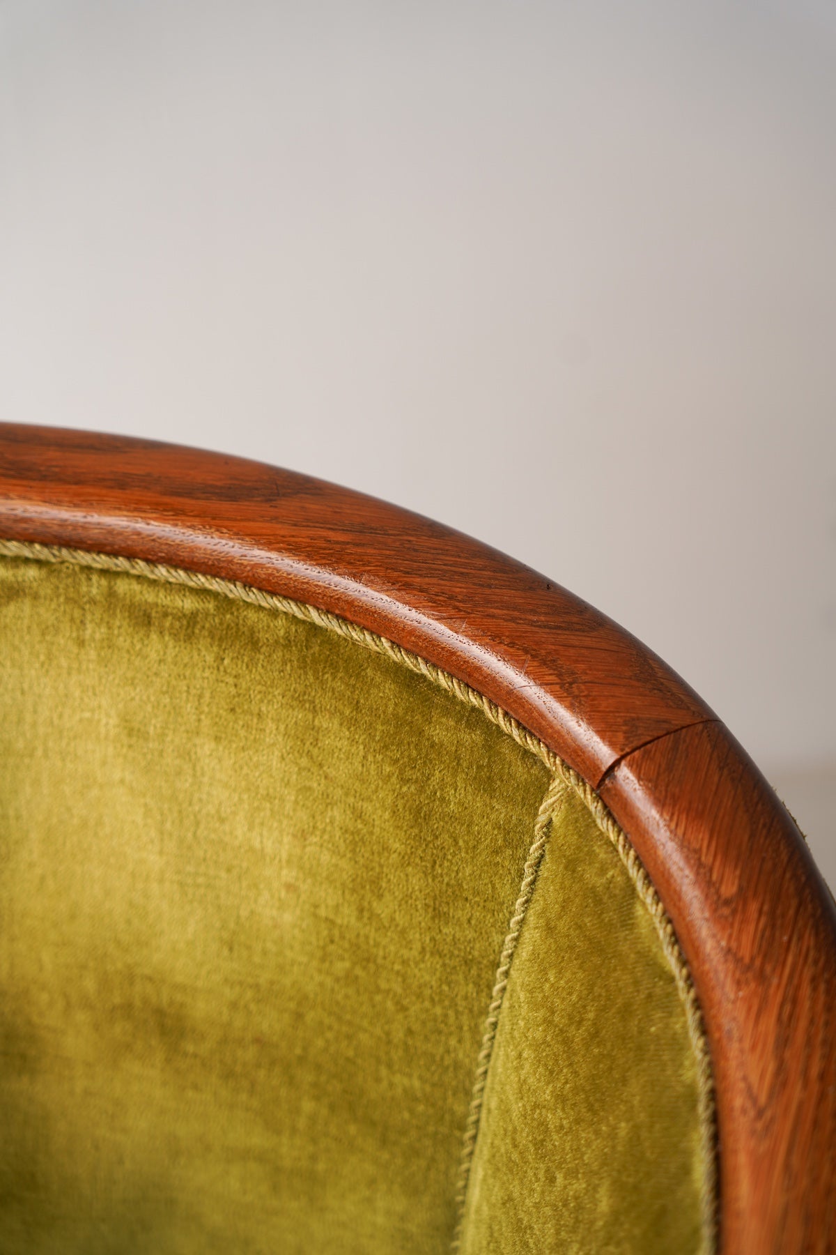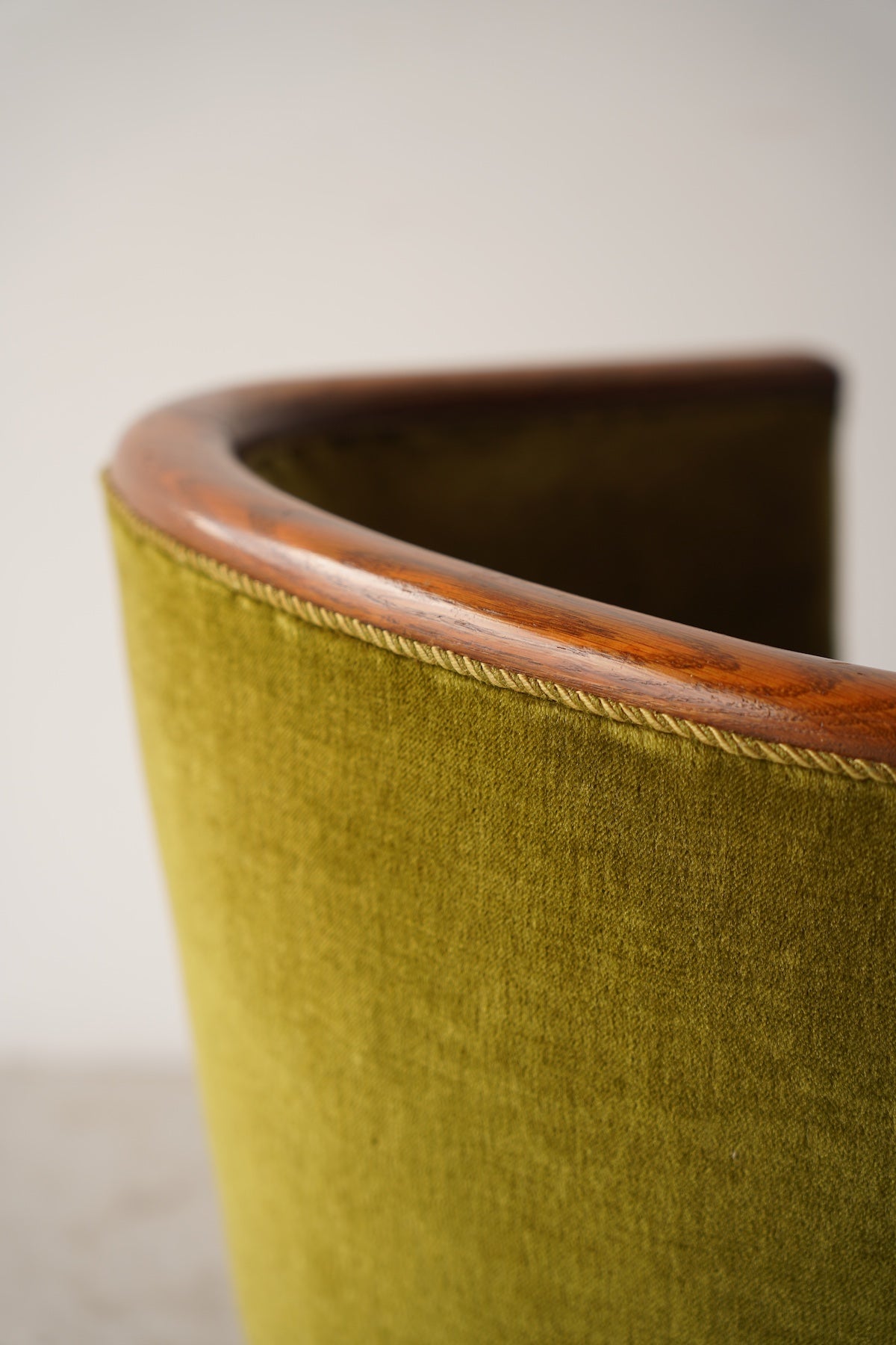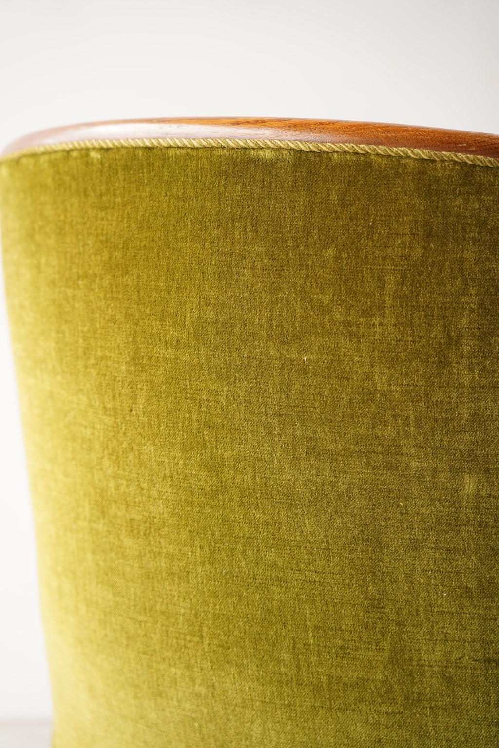 このアームチェアの最大の魅力は、その独特のフォルムと、目を引く素材の組み合わせにあります。滑らかな曲線を描く背もたれからアームレストにかけては、美しい木目のフレームが配されており、上品なアクセントとなっています。座面や背もたれは、光沢のある落ち着いたグリーンのベルベットで覆われ、柔らかな手触りと、見た目の美しさを両立しています。