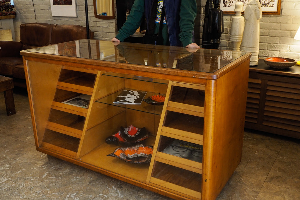 木製フレームにガラス天板とガラス棚を組み合わせたショーケース/カウンター