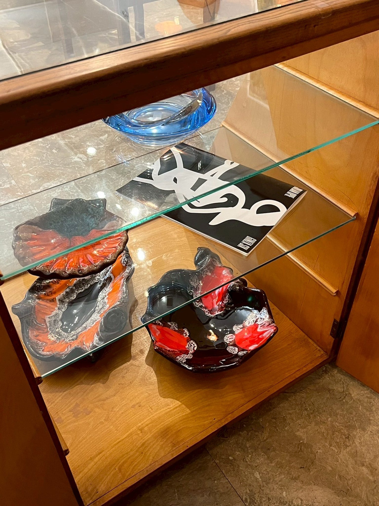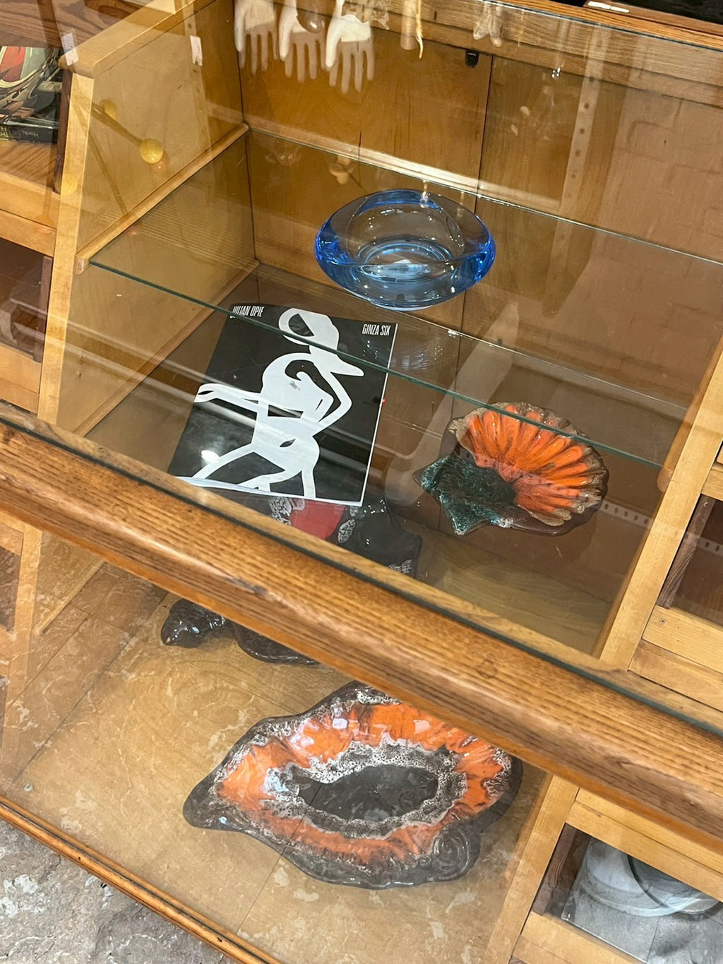 表側はガラス扉のショーケース仕様で、器やオブジェ、アートブックなどを美しく見せながら収納可能。内部の棚板は木製とガラス棚の組み合わせで、立体感のあるディスプレイを楽しめます。