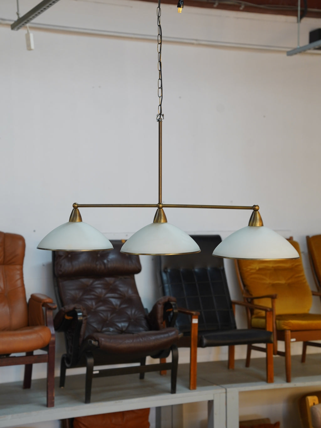 落ち着いた真鍮のフレームに、柔らかな光を広げる白いシェードを組み合わせた3灯シャンデリアです。