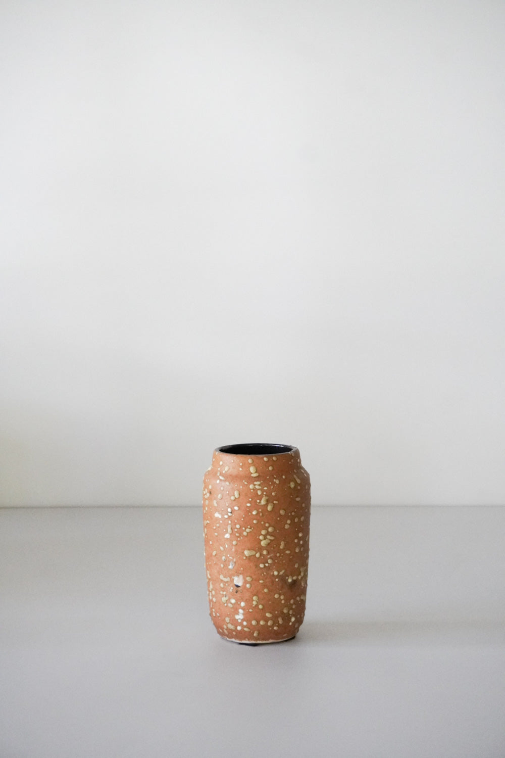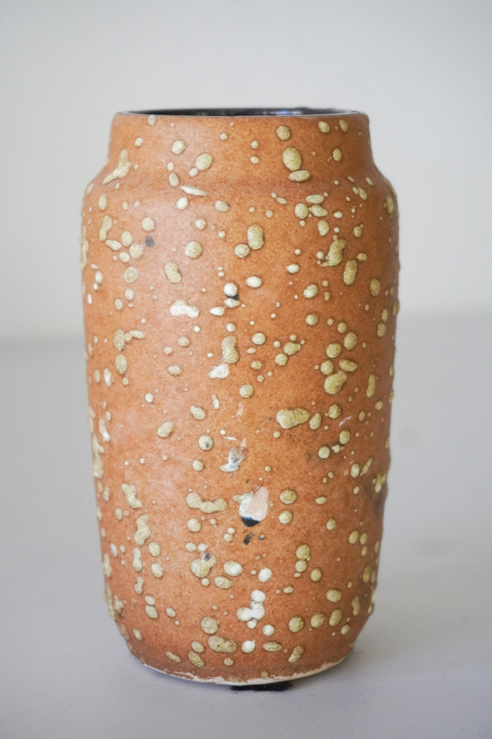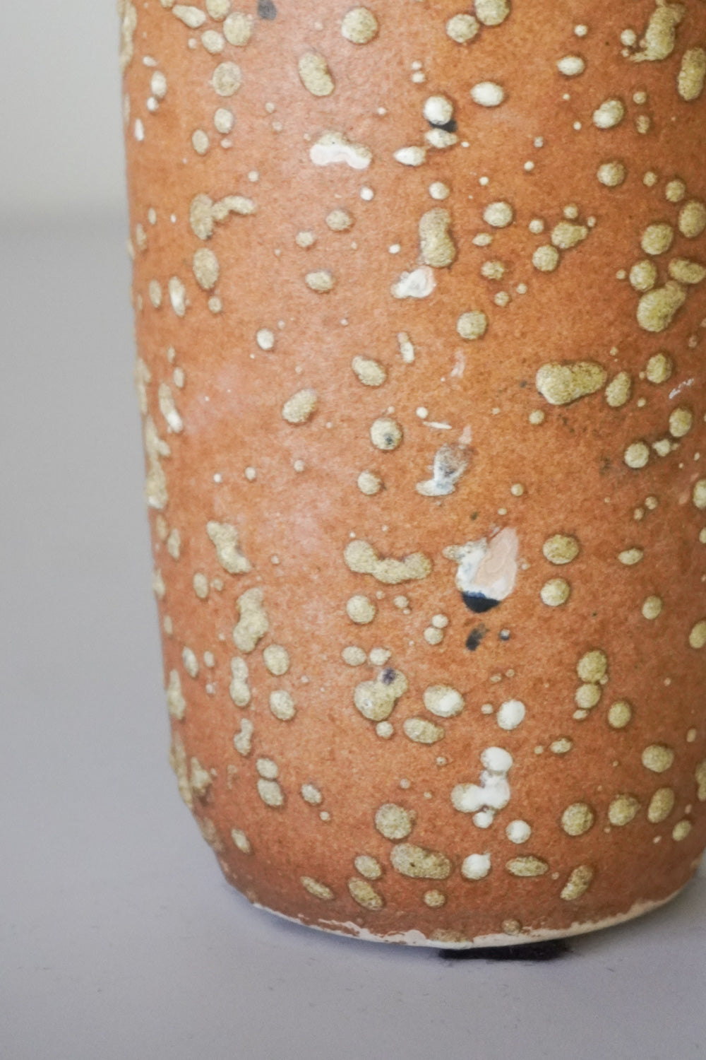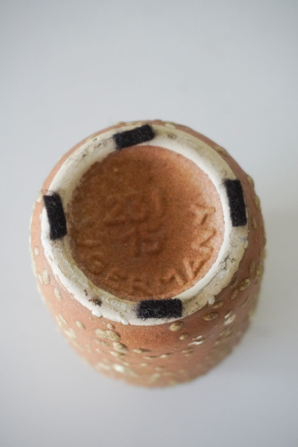 水玉模様の白い釉薬のドットが施されたフラワーベースです。