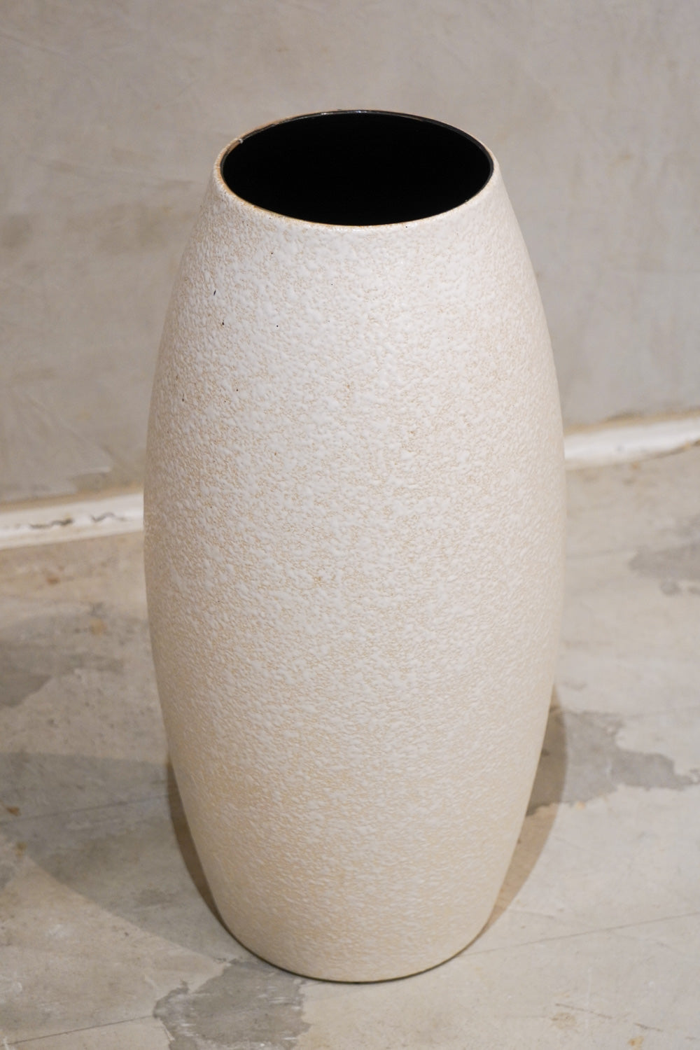 全体的に縦長の卵型をしており、柔らかなアイボリーやベージュのような色合いです。表面には、細かくザラザラとした釉薬(いわゆる「ファット・ラヴァ」)が施されています。