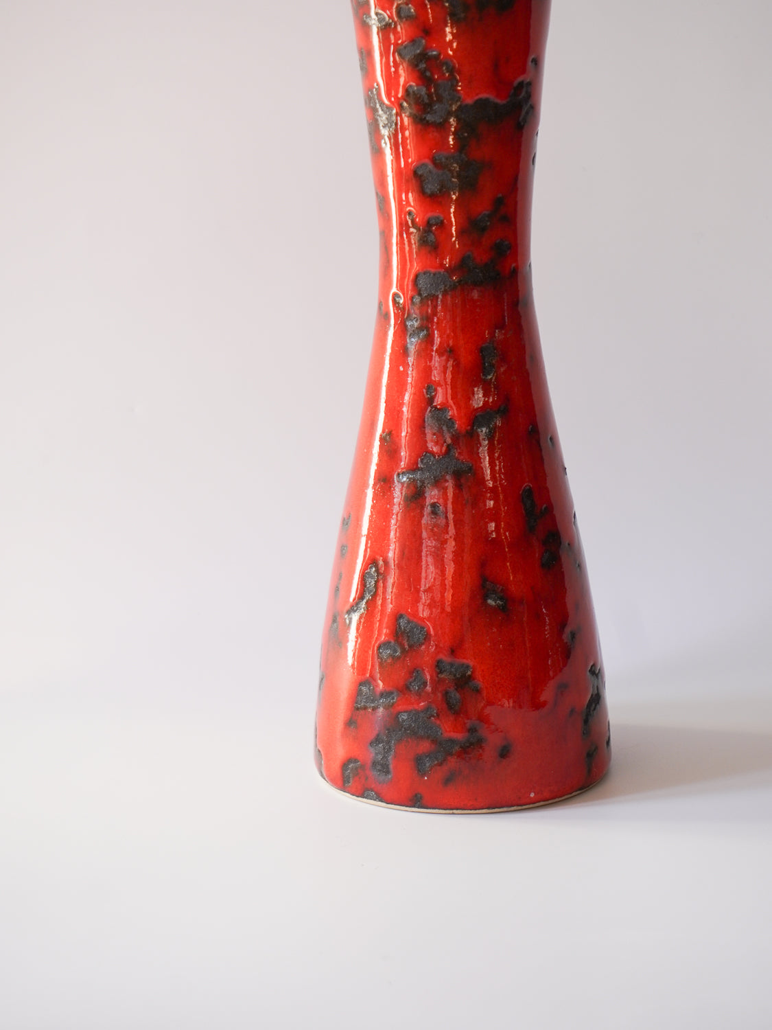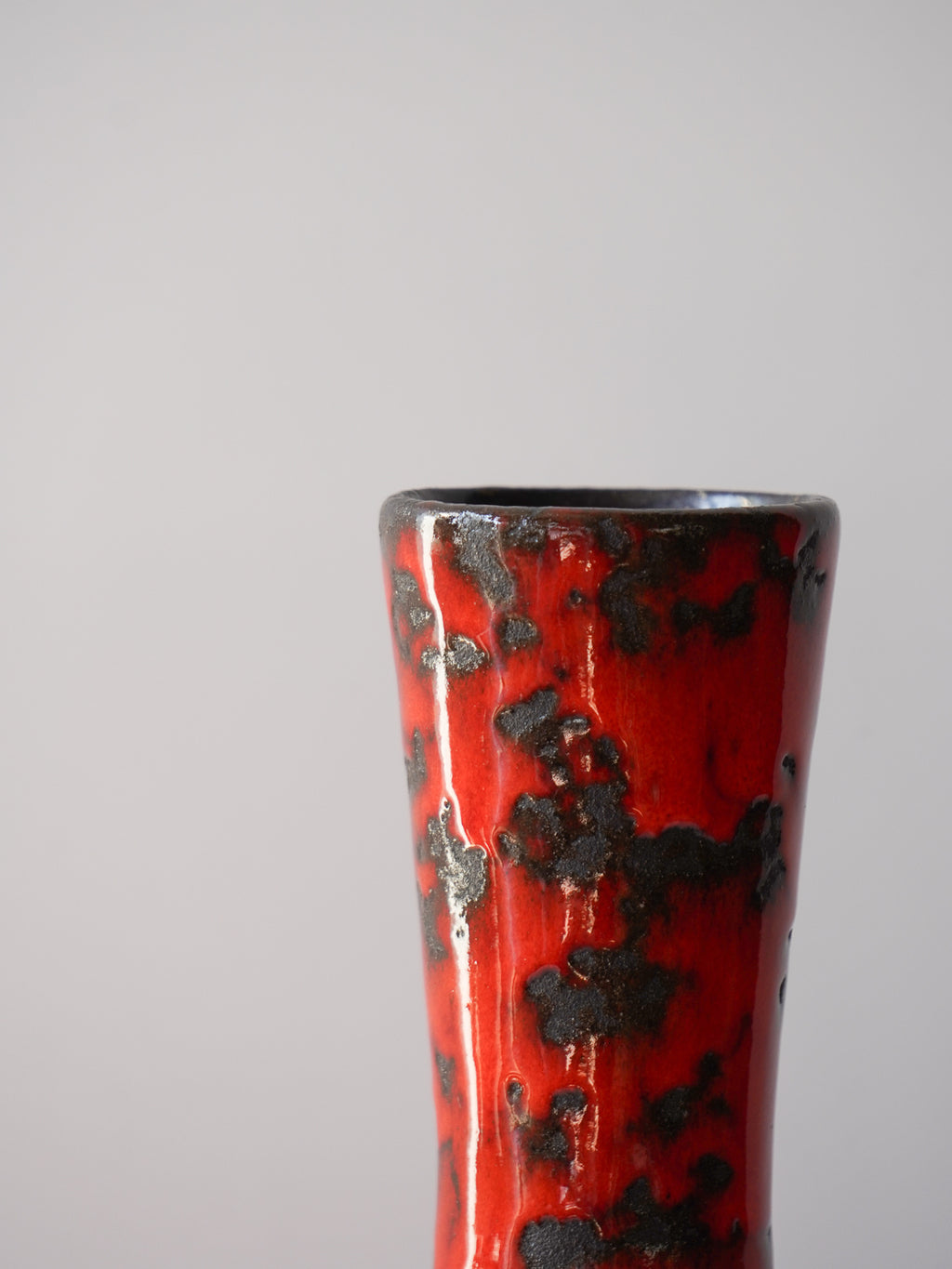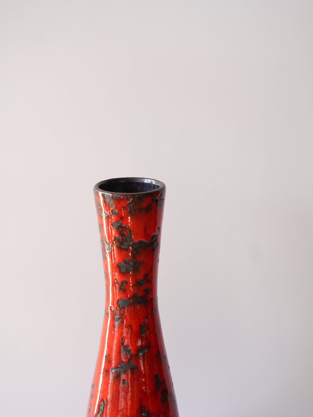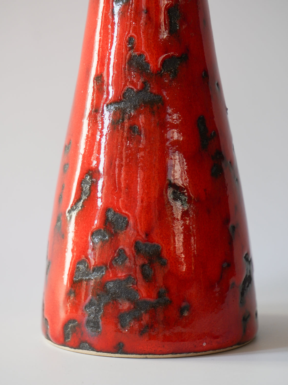 表面全体は、光沢のある鮮烈な朱色の釉薬で覆われ、その中に黒い釉薬が斑点状に散りばめられています。