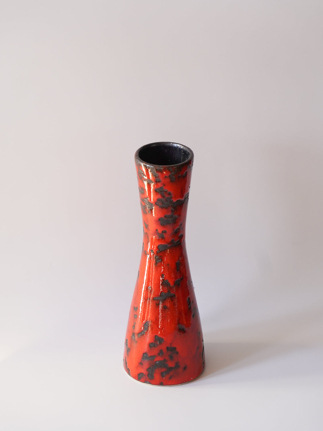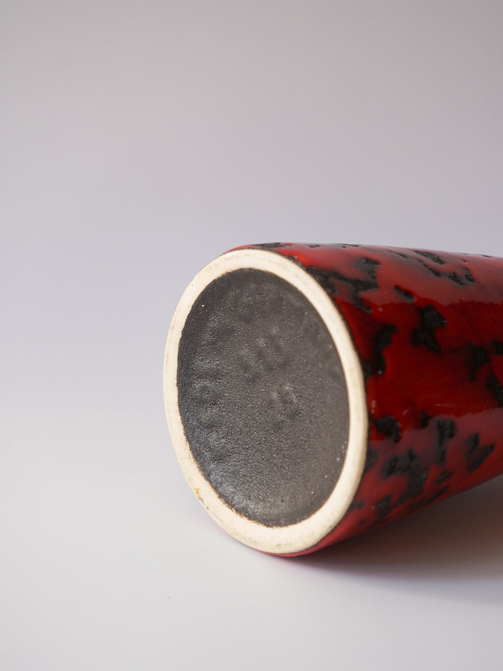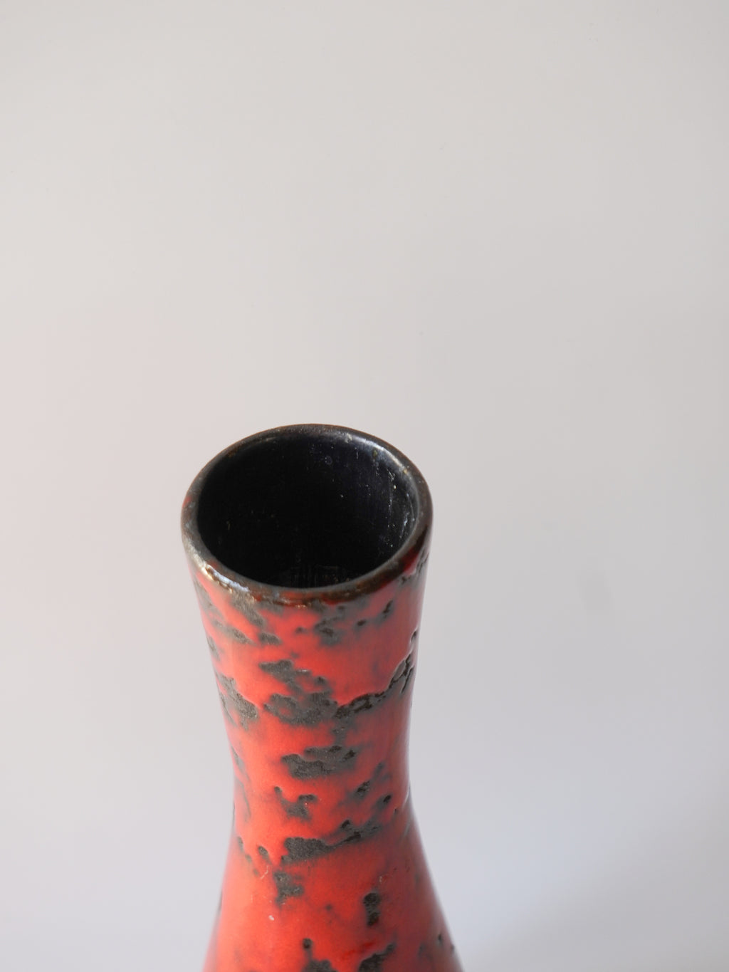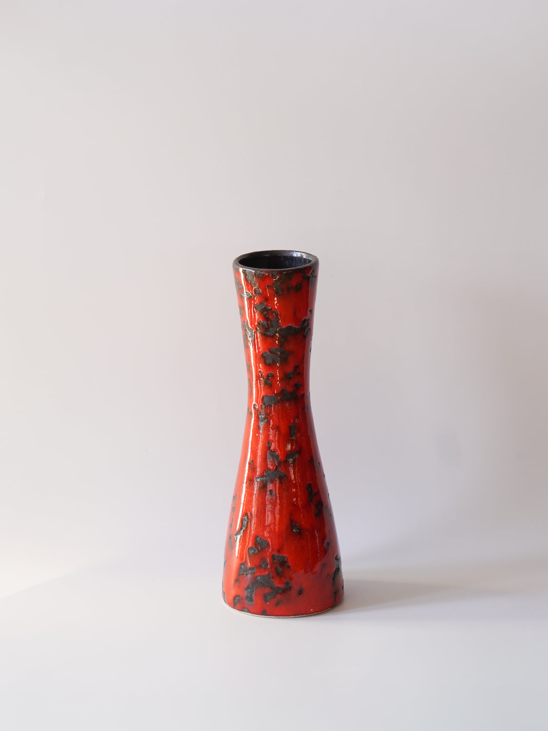 表面全体は、光沢のある鮮烈な朱色の釉薬で覆われ、その中に黒い釉薬が斑点状に散りばめられています。