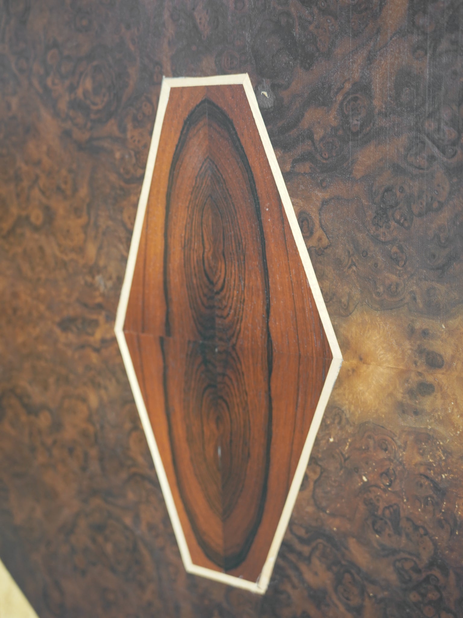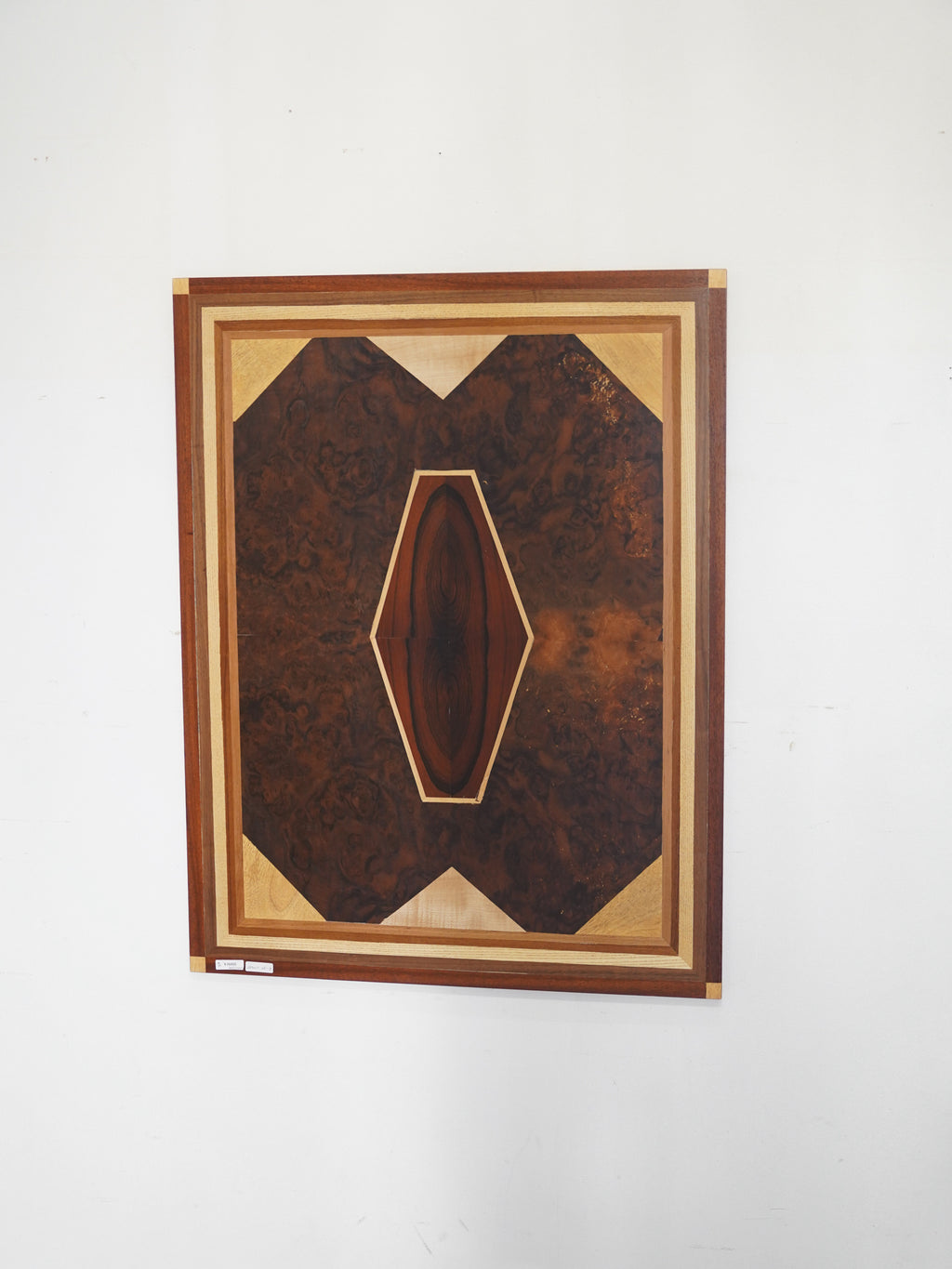 ヨーロッパで買い付けられた、精緻なマーケットリー(木象嵌)のウォールパネルです。中央に配された美しい対照図形を囲むように、複雑にうねる独特な杢目を持つ天然木が配されており、自然の造形美と高度な職人技が融合した深い芸術性を放っています。