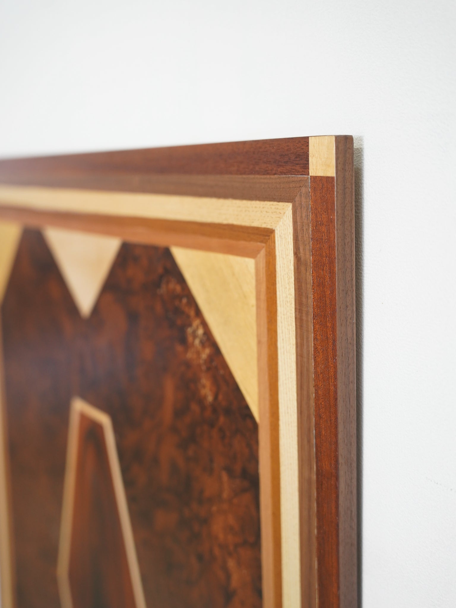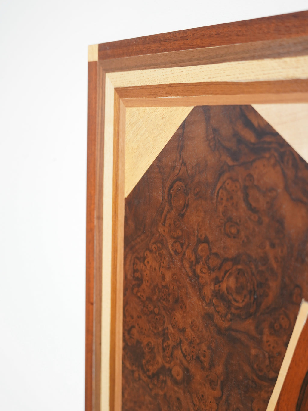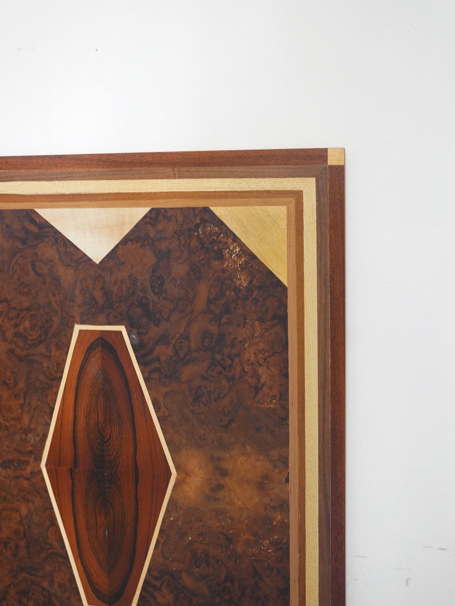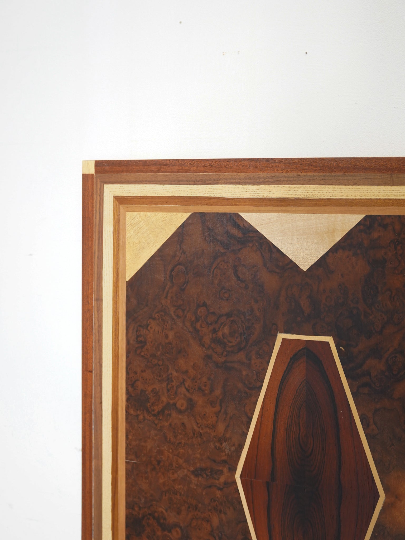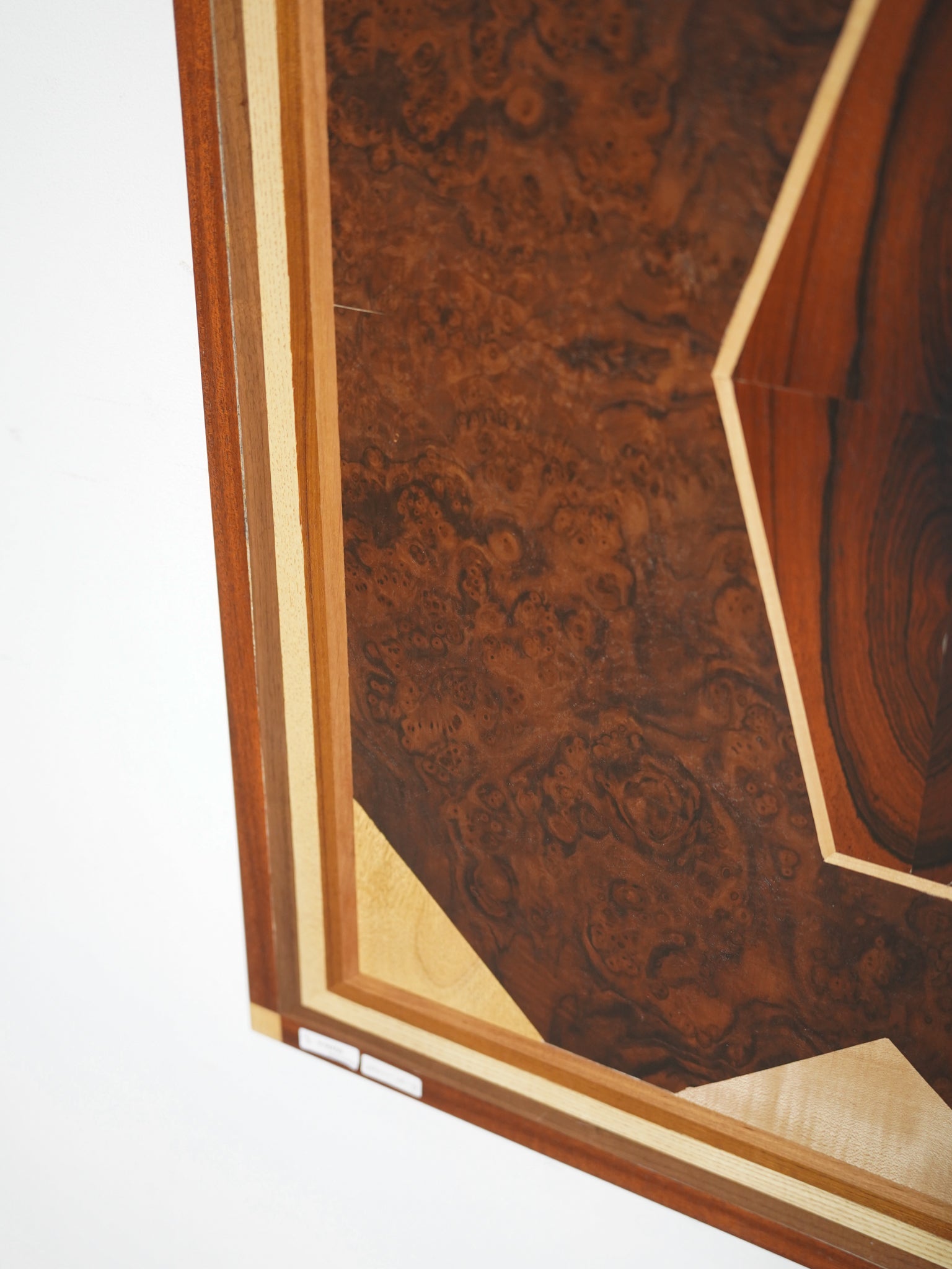 木材の質感や色の濃淡を計算し尽くした幾何学的な構成により、見る角度で表情を変える立体的な奥行きを演出。欧州の熟練した工房で装飾パネルとして制作された希少な一点ものです。壁面に飾るだけで、空間に圧倒的な品格と知的な落ち着きをもたらす至高のアートピースです。