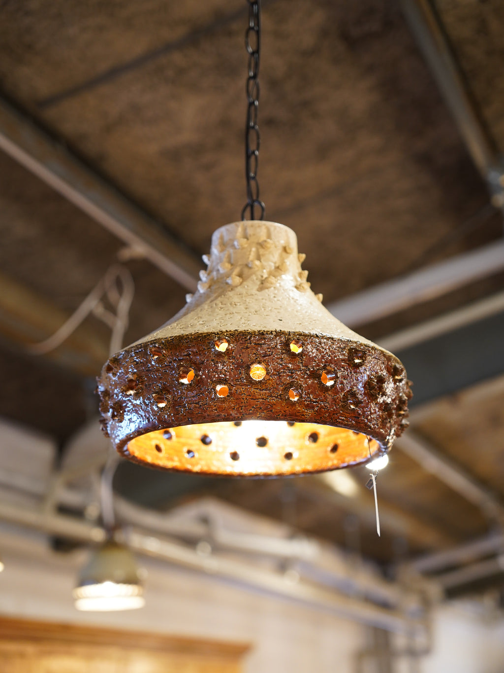 こちらは、北欧デンマークで製作されたセラミック製のペンダントランプです。独特のフォルムと、職人の手仕事による温かさが凝縮された一点ものの照明です。
