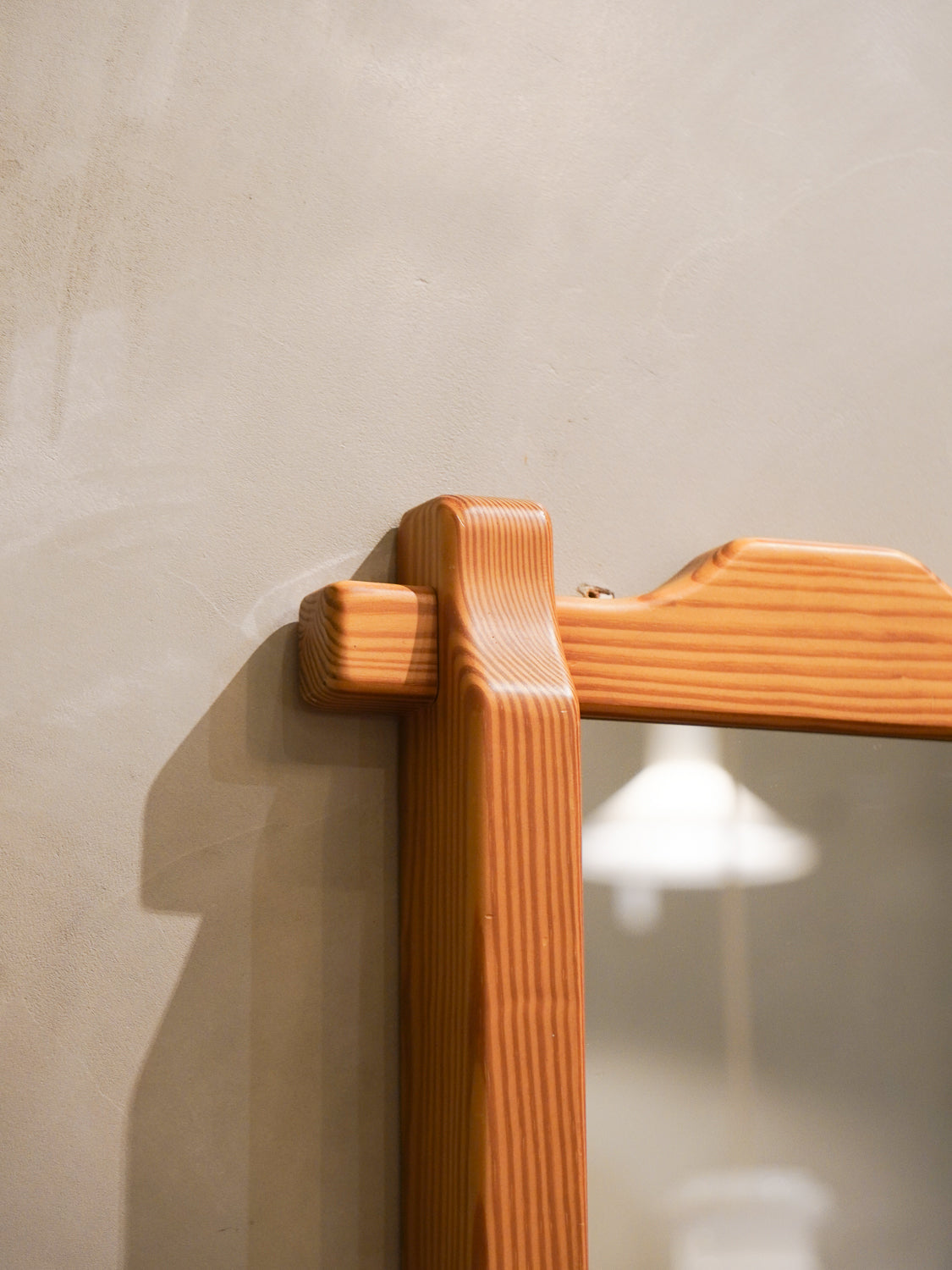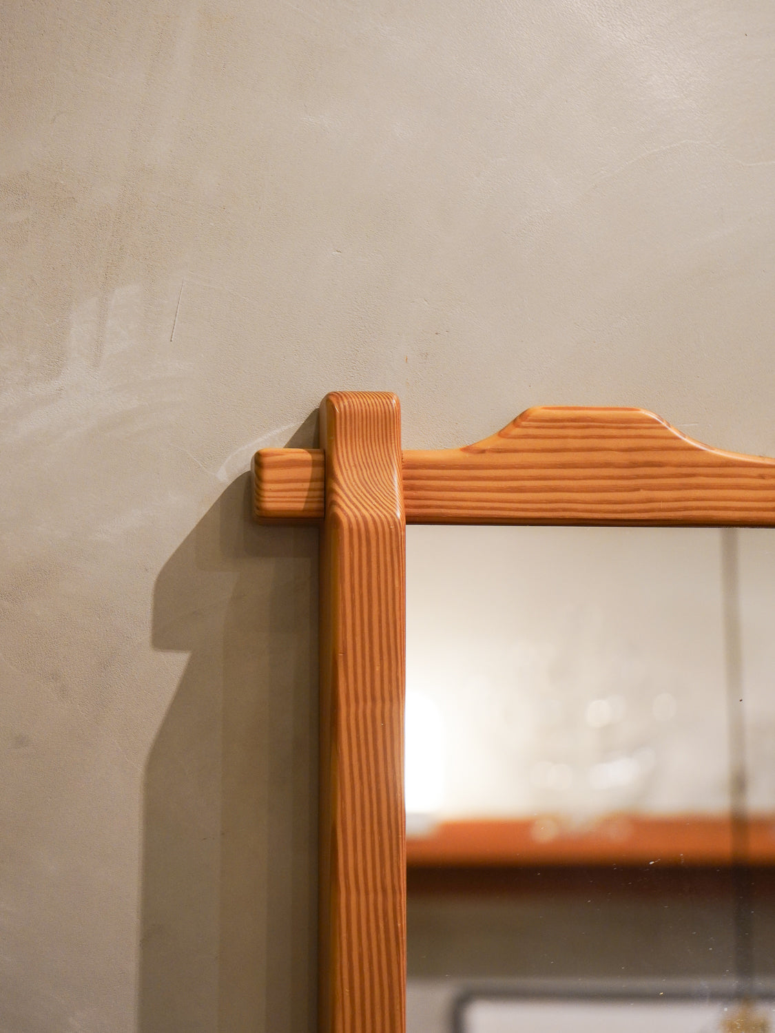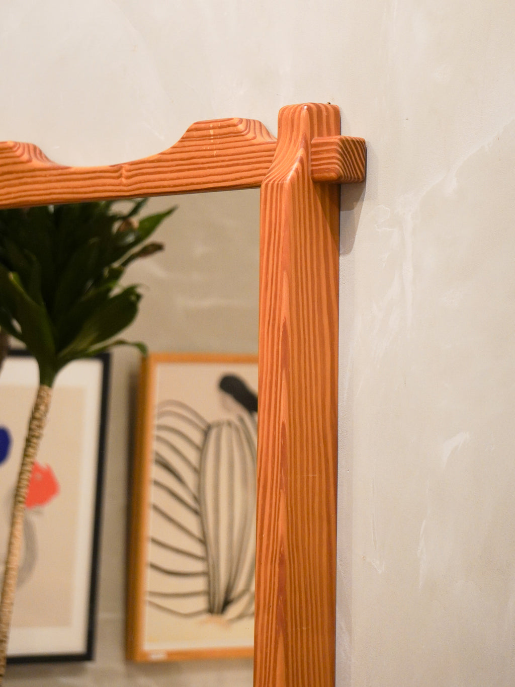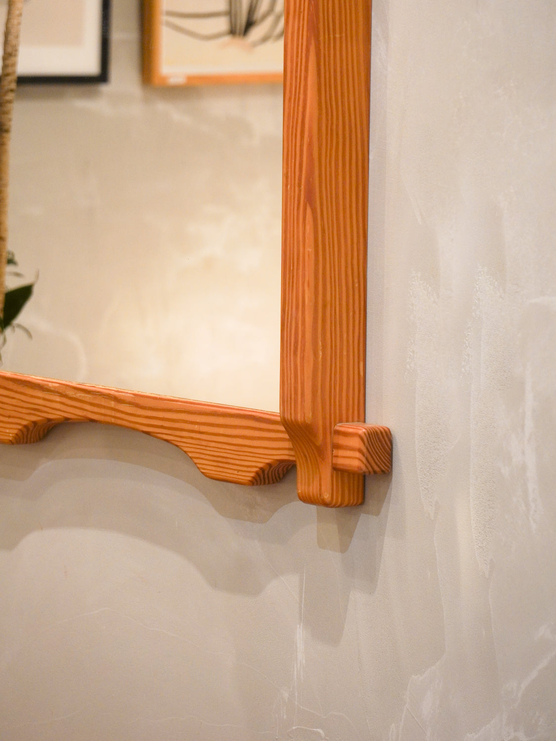 鮮やかで明るい木目が特徴のパインウッドを贅沢に使用した、個性的なデザインの木製フレームミラーです。パイン材特有の温かい色合いと柔らかな質感が、空間に明るく心地よい雰囲気をもたらします。