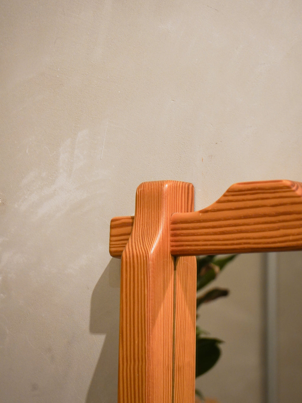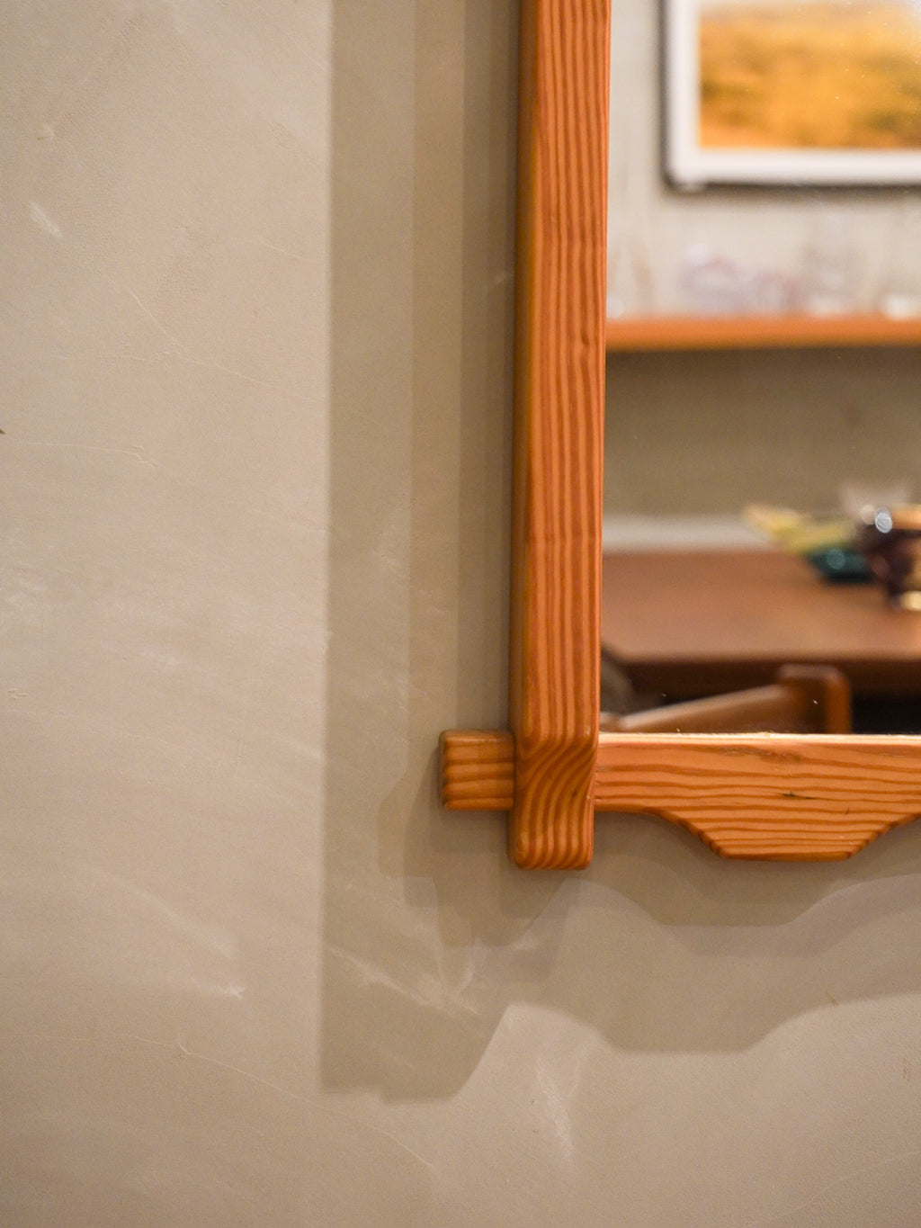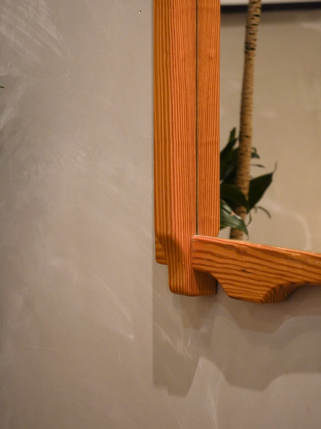 鮮やかで明るい木目が特徴のパインウッドを贅沢に使用した、個性的なデザインの木製フレームミラーです。パイン材特有の温かい色合いと柔らかな質感が、空間に明るく心地よい雰囲気をもたらします。